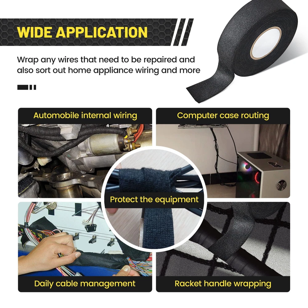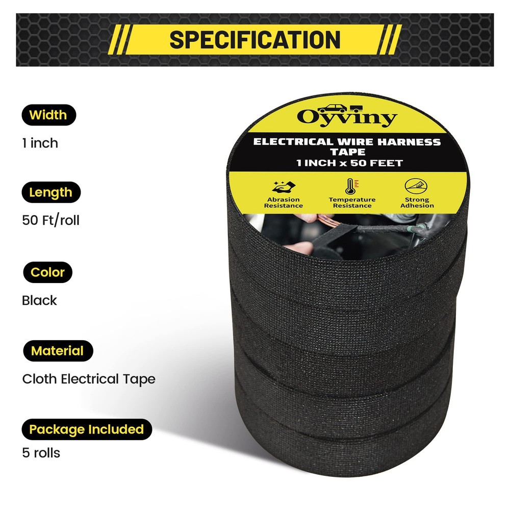 Wire Harness Cloth Tape Application: Automotive wire loom tape is widely used in the area near the engine, battery or on normal wire harness and also suitable for the use of wire harness in automobile interior noise reduction part, such as instrument panel harness; Wrap any wires that need to be repaired Temperature Resistance: Electrical wiring harness cloth tape made of high-quality polyester non-woven fabric and strong acrylic pressure sensitive adhesive, with high adhesive Force, abrasion resistance and high-temperature resistance (-40℉- 225℉) Easy to Tear: automotive cloth tape is easy to tear and convenient to use, just wrap the harness cloth tape around the wiring harness and gently tear it apart, No tools required; You could tear the tape at any length according to your need Good Performance: Automotive wire loom harness cloth tape is wear-resistant and with strong anti-aging, which can be applied for a long time; It is also suitable for automotive circuit and engine maintenance to achieve the effect of insulation protection Harness Cloth Tape Size: Package comes with 5 rolls 25mm x 15m electrical wire harness tape, each roll radio wiring harness cloth tape is 1 inch width and 50 feet length, the size and length is suitable for your daily use
