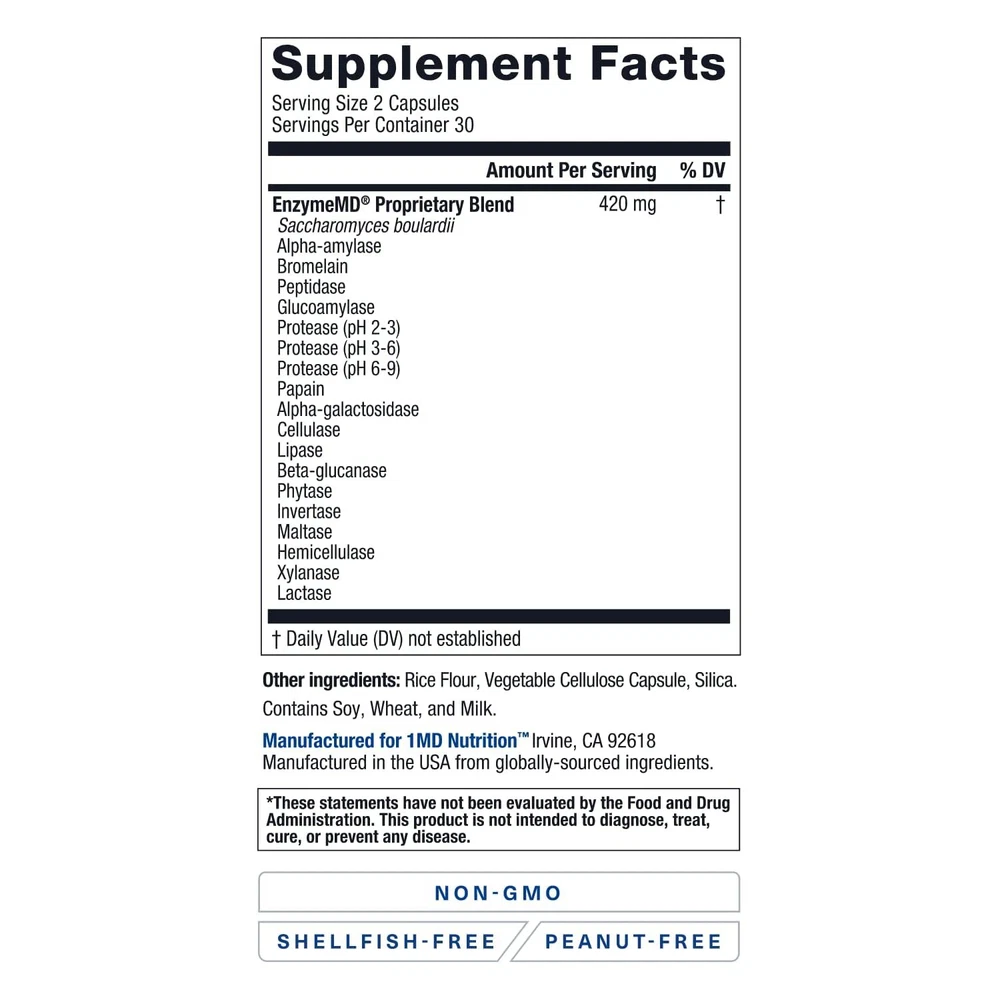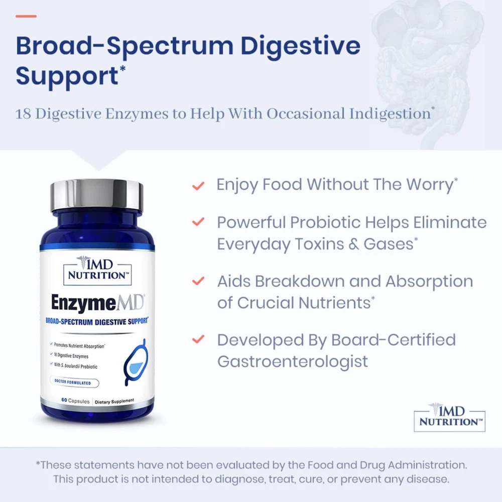 1MD Nutrition EnzymeMD - Digestive Enzymes Supplement - Doctor Formulated | 18 Plant-Based Enzymes - Gas & Bloating Support | 60 Capsules USA. Powerful Probiotic and Enzyme Combination: 18 potent, plant-based digestive enzymes to aid breakdown of important nutrients. The addition of S. boulardii probiotic stimulates enzymatic activity for comprehensive digestive support.* Feel Good About What You Eat: Enjoy what you eat without the worry. EnzymeMD helps aid proper breakdown of food to promote optimal digestion while reducing gas production.* Reduce Occasional Digestive Discomfort: Digestive enzymes aid the process of digestion and limit bacterial fermentation. This enhanced digestion reduces occasional gas, bloating, and dysmotility that can occur after eating.* Restore Long-Term Digestive Health: Fast-acting enzymes work with the powerful probiotic to stimulate digestion, reinforce the gut barrier, and support long-term health.* Vegetarian Capsule For Easy Digestion: Each capsule is tailored to support a robust digestive capacity and to help reduce digestive discomfort, so you benefit from optimal enzymatic activity.* EnzymeMD is doctor formulated to provide comprehensive digestive support while maximizing nutrient absorption. This complex formula includes 18 potent, plant-based digestive enzymes , plus Saccharomyces boulardii, a powerful probiotic used to stimulate digestive function and neutralize gas production. Each non-GMO vegetarian capsule is specifically tailored to increase digestive capacity and reduce discomfort associated with indigestion, gas, and bloating.* Shipping We offer FREE shipping on all orders! We ship within Three business days of payment, usually sooner. We use a selection of shipping services such as UPS, FedEx, USPS etc. We only ship to the lower 48 states, no APO/FPO addresses or PO Boxes allowed. Local pickups and combined shipping options are not provided at this time. Return You can return a product for up to 30 days from the date you purchased it. Any product you return must be in the same condition you received it and in the original packaging. Please keep the receipt. Payment We accept payment by any of the following methods: PayPal Please pay as soon as possible after winning an auction, as that will allow us to post your item to you sooner! Feedback Customer satisfaction is very important to us. If you have any problem with your order, please contact us and we will do our best to make you satisfied. Contact Us If you have any queries, please contact us via ebay. We usually respond within 24 hours on weekdays. Please visit our eBay store to check out other items for sale! Thank you for shopping at our store.