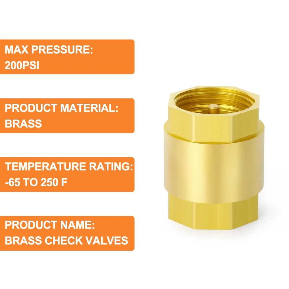【Material】: Using brass valve body and stainless steel spring, it has the characteristics of corrosion resistance, high temperature ductility and low magnetic permeability. 【SIZE】: 1-1/2" Female Thread Check Valve 【Rated value】: The maximum working pressure is 200PSI 【Introduction】: Used to prevent fluid backflow, good tightness, no leakage, easy to install and disassemble. 【Applications】: Widely used in fuel/air/liquid/oil/gas, pipeline applications and connections, and can be used in various measuring devices and collectors.