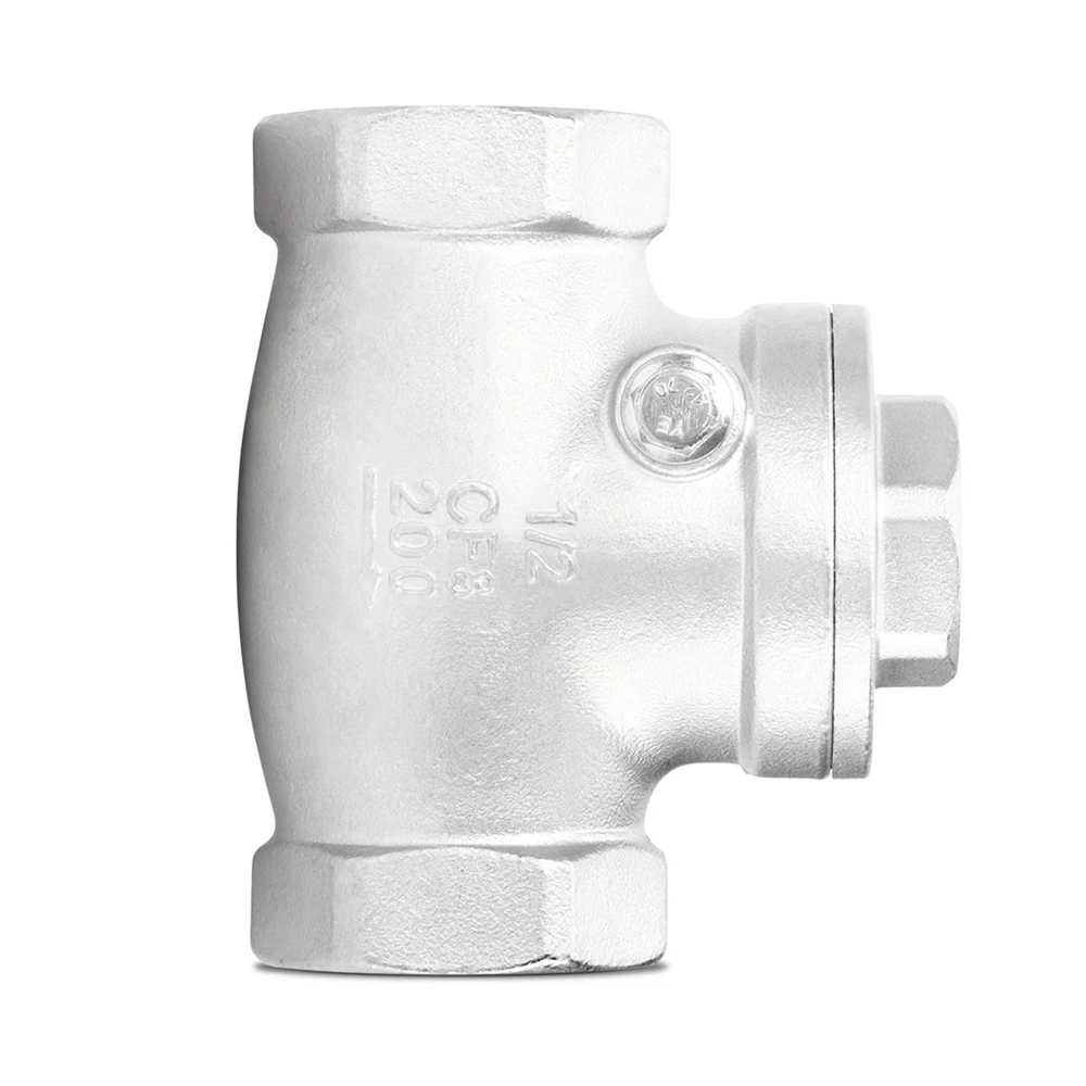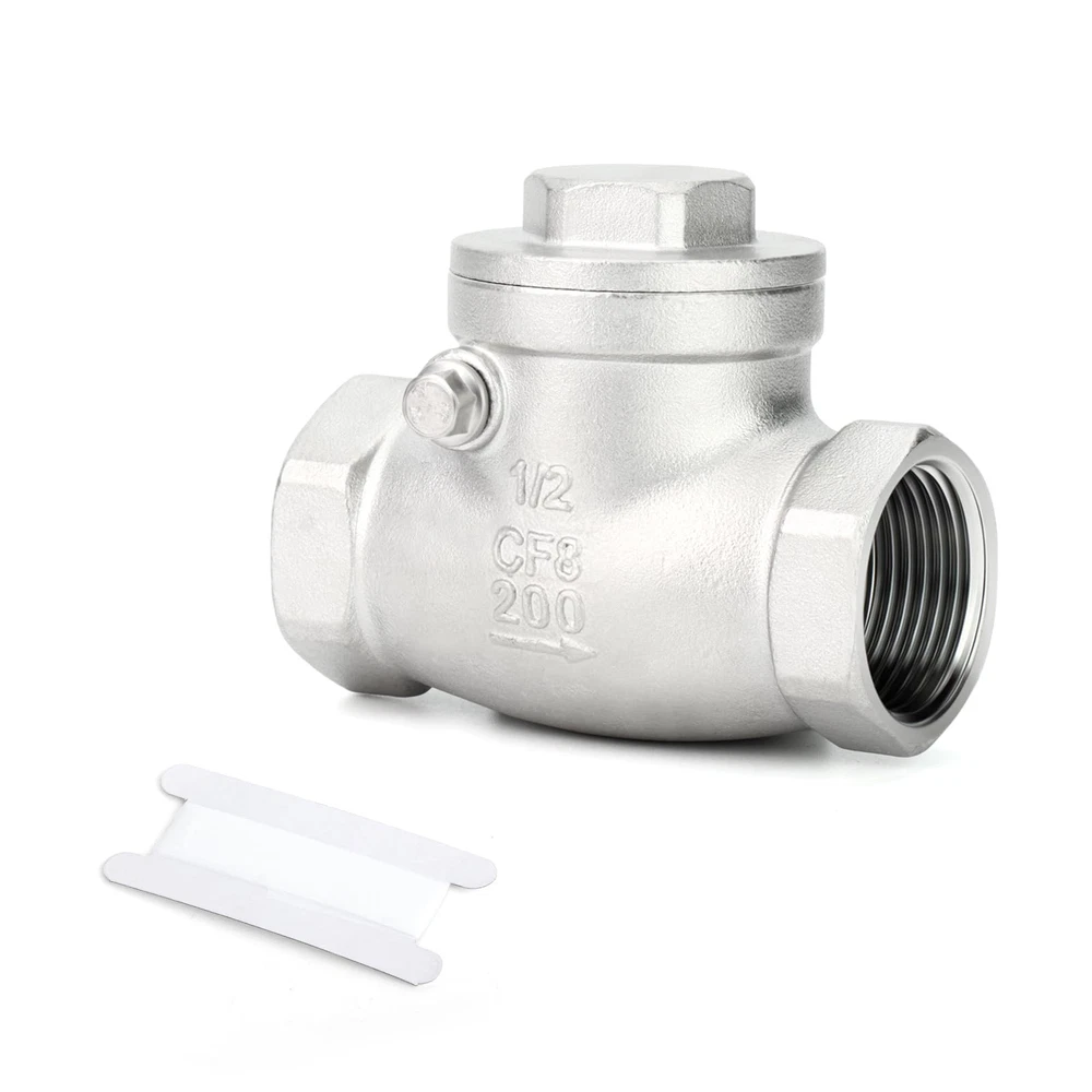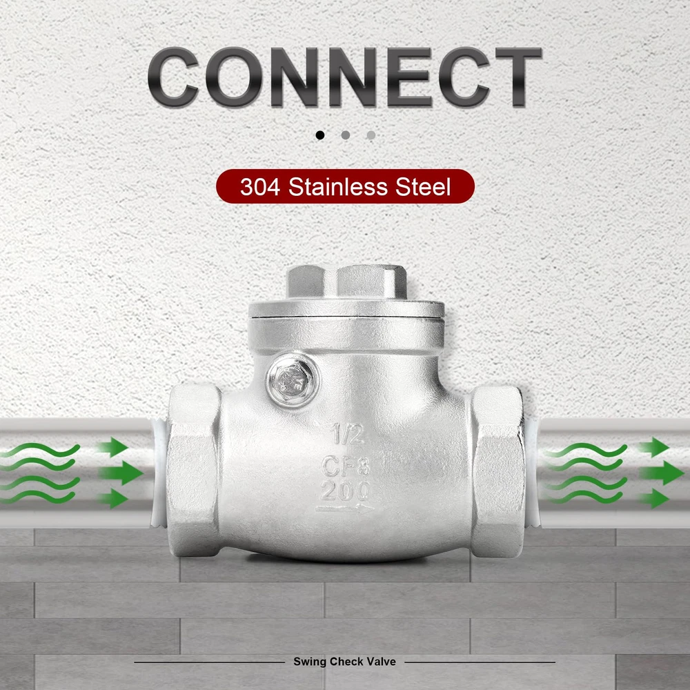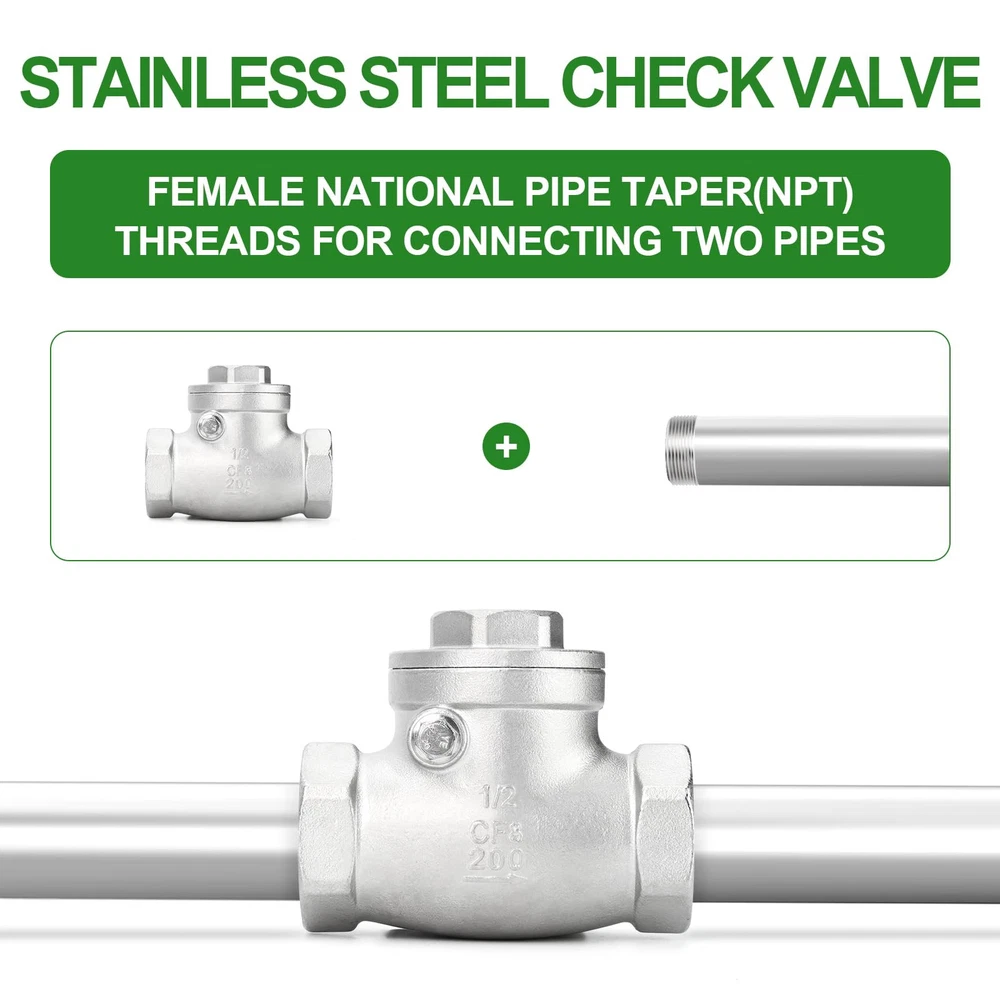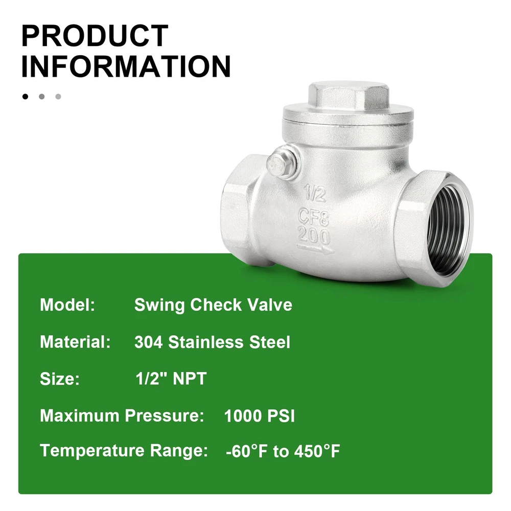 [ Product Type ] Swing Check Valve(1/2" NPT Female) ,for industry connecting pipes or fittings with different end types, diameters, or materials. [ Metal ] 304 stainless steel strength and resistance to corrosion. [ Working Temperature& Maximum Pressure ] Temperature range from -60 to 450 degrees F.Maximum working pressure is 1000PSI. [ Introduction ] Used to prevent fluid backflow, good tightness, no leakage, easy to install and disassemble. [ Applications ] Widely used in fuel/air/liquid/oil/gas, pipeline applications and connections, and can be used in various measuring devices and collectors.