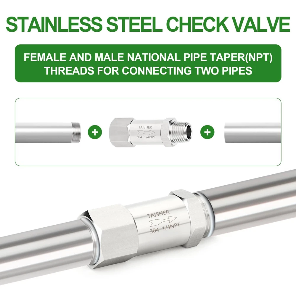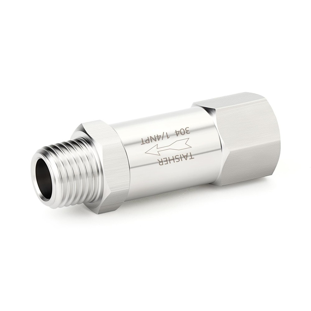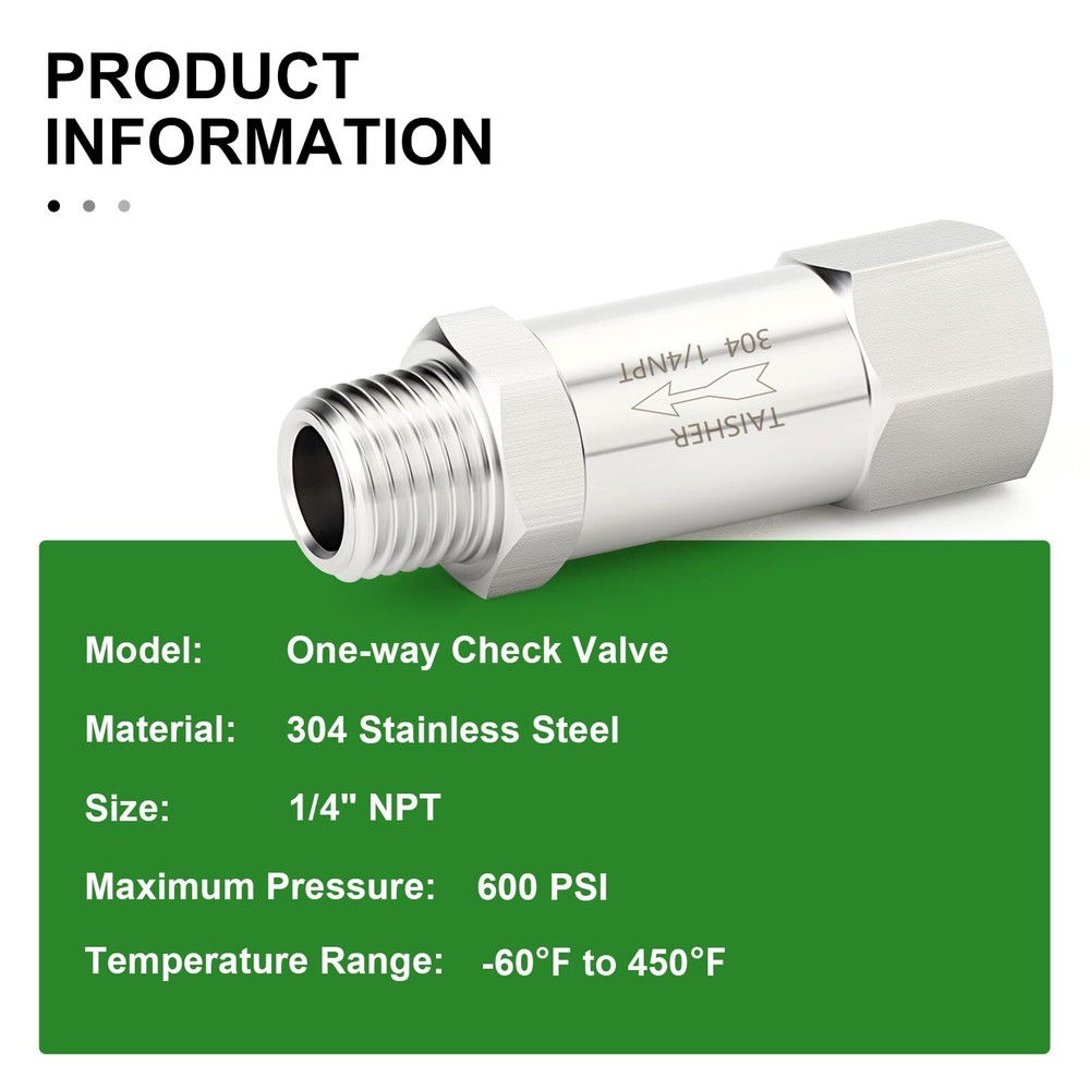 [ Product Type ] Check Valve(1/4" NPT Male x 1/4" NPT Female) ,for industry connecting pipes or fittings with different end types, diameters, or materials. [ Metal ] 304 stainless steel strength and resistance to corrosion. [ Working Temperature& Maximum Pressure ] Temperature range from -60 to 450 degrees F.Maximum working pressure is 600PSI. [ Introduction ] Used to prevent fluid backflow, good tightness, no leakage, easy to install and disassemble. [ Applications ] Widely used in fuel/air/liquid/oil/gas, pipeline applications and connections, and can be used in various measuring devices and collectors.