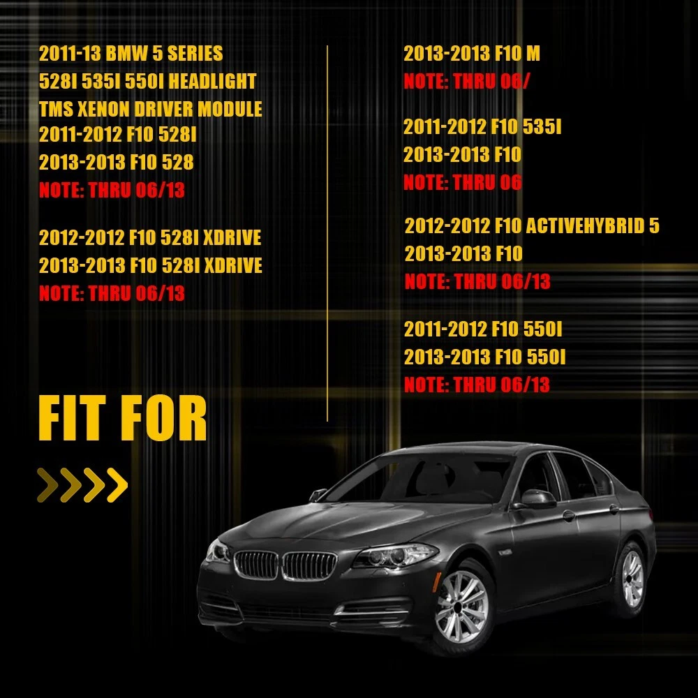 Fits for: 2011-13 BMW 5 Series 528i 535i 550i Headlight TMS Xenon Driver Module 2011-2012 F10 528i 2013-2013 F10 528i Note: thru 06/13 2012-2012 F10 528i xDrive 2013-2013 F10 528i xDrive Note: thru 06/13 2011-2012 F10 535i 2013-2013 F10 535i Note: thru 06/13 2011-2012 F10 550i 2013-2013 F10 550i Note: thru 06/13 2012-2012 F10 ActiveHybrid 5 2013-2013 F10 ActiveHybrid 5 Note: thru 06/13 2013-2013 F10 M5 Note: thru 06/13 Specifications: OE: 63117316217, 7316217, 7304905, 63117305235, 63117304905, 63117279625, 63117274400 Lighting Technology: HID, LED, Xenon 1PCS Xenon Headlight Driver Module Adaptive 63117316217 For 5 Series F10 F11 F07 Fits for: 2011-13 BMW 5 Series 528i 535i 550i Headlight TMS Xenon Driver Module 2011-2012 F10 528i 2013-2013 F10 528i Note: thru 06/13 2012-2012 F10 528i xDrive 2013-2013 F10 528i xDrive Note: thru 06/13 2011-2012 F10 535i 2013-2013 F10 535i Note: thru 06/13 2011-2012 F10 550i 2013-2013 F10 550i Note: thru 06/13 2012-2012 F10 ActiveHybrid 5 2013-2013 F10 ActiveHybrid 5 Note: thru 06/13 2013-2013 F10 M5 Note: thru 06/13 Specifications: OE: 63117316217, 7316217, 7304905, 63117305235, 63117304905, 63117279625, 63117274400 Lighting Technology: HID, LED, Xenon Headlight Style: Argon Lamps Material:Plastic Features: *High quality standards Made of superior material to design and produce for better durability and long service life.Also, it has undergone rigorous testing to meet stringent quality standards. *Warm notice 1.It can be applied to the cars with argon lamps, but not fits for the cars with halogen lamps. 2.This module without headlights steering/move function can be used directly, you do not need to code it. 3.The orginal products of high-end vehicles with steering need to be programmed for better using. *All tested before shipment All products were tested for performance and to ensure the accurate parameter for your vehicle. Packaging include: 1 x Headlight Drive Module Item Specifics Brand AUXITO Manufacturer Part Number 63117316217 Placement on Vehicle Front, Left, Right Reference OE/OEM Number 63117329157, 63117316217, 63117305235, 63117304905 Type Xenon Headlight Driver Module Adaptive Lighting Technology Xenon Features Easy to install Items Included Ballast Classic Part No Interchange Part Number 63117329157 Manufacturer Warranty 1 Year Lighting Technology HID, LED, Xenon Mounting Style Screws Country/Region of Manufacture United Kingdom Manufacturer Warranty 5 Years Colour Temperature 6500K Performance Part No Universal Fitment Yes Finish Polished Item Length 14CM/5.5IN Item Width 8.7CM/3.4IN Grade High Quality UK STOCK Superseded Part Number 63117304905, 63117279625, 63117274400 Model For BMW 528i 535i 550i xDrive F10 M5 Fitment1 For 2011-13 BMW 5 Series Headlight TMS Xenon Driver Module Fitment2 For 2011-2012 F10 528i Fitment9 For 2013-2013 F10 535i Fitment10 For Note: thru 06/13 Fitment13 For Note: thru 06/13 Fitment17 For 2013-2013 F10 M5 Fitment16 For Note: thru 06/13 Fitment15 For 2013-2013 F10 ActiveHybrid 5 Fitment14 For 2012-2012 F10 ActiveHybrid 5 Fitment12 For 2013-2013 F10 550i Fitment11 For 2011-2012 F10 550i FAQ ♥ If you have a decoding problem or any other problems, please contact us first, we will help you with it. We will reply you within 24 hours in working days. I'm a new seller, thanks a lot for your trust and convince! I will serve you with all my heart. ♥ Q1: Will this bulb fit my vehicle? A: We can match almost any vehicle to one of our bulb sizes. eBay only lets us include some vehicle fitments per listing, but if your vehicle does not show up on the compatibility table at the top of our listings, welcome you to contact us for free consulation before purchasing a product. Q2: My item has not arrived, what's taking so long? A: Sometimes items take longer than expected, especially if it’s going far or to rural area. Check with your post office to see if your item has been held up. Sometimes Royal Mail will not update a tracking number until it has arrived at its destination. If your item still don't arrive after a few days, let us know so we can double check for you and help solve it asap. Q3: My bulbs won't fit, help! A: Special bulb holder may be required. See if you can take the holder from the stock bulb. If not, let us know. The bulb size may be wrong, double check the item you received with the item you ordered. Do you have an aftermarket lighting housing? These may not be perfectly fitted for aftermarket bulbs and will require some manual modifications. Q4: Neither side lighting up? Both sides flicker, hyper flash, or work inconsistantly. A:Check the light fuses, and then check the ballast plugs to insure correct installation. If this doesn't work, there may be a voltage problem with the vehicle. You probably just need a relay or capacitor. Even though some bulbs are builtin resistors, they may still need a decoder. Pay & Ship (1). We gladly accepts payment via PayPal, We will ship your item(s) within 24 hours. (2). Before payment, please keep the consistency of Paypal address and ebay address. (3). Quantity orders are welcome! Returns (1). We offer 60 days free return policy. Please contact us within 60 days from the date you receive your order if you have any issues with the product or want return. Refund will be send after we got your resend package. (2). All returned items should be in the original packaging , return tracking information should be provided . Contact Us (1).Negative feedback will not help resolve any problems you have, please contact us via eBay messages before leaving negative feedback , our customer service will make best effort to help you with the issues. (2).We maintain high standards of excellenceand strive for 100% customer satisfaction! Feedback is very important to us. We request that you contact us immediately before you give us neutral or negative feedback, so that we can satisfactorily address your concerns. About us We're professional in car and motorcycle accessories, especially i