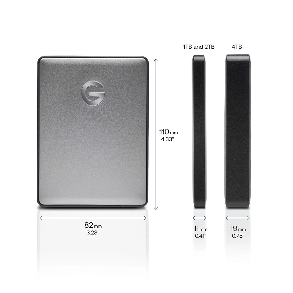 Featuring a plug-and-play USB-C port and transfer speeds up to 140MB/s*, the G-DRIVE mobile USB-C drive offers portable storage in a stylish, aluminum design to complement your Mac computer. And with capacities up to 4TB** of storage, you’re instantly ready to back up your favorite videos, photos, music and documents, wherever you go. |*As used for transfer rate, megabyte per second (MB/s) = one million bytes per second. Performance will vary depending on your hardware and software components and configurations. | **As used for storage capacity, one gigabyte (GB) = one billion bytes and one terabyte (TB) = one trillion bytes. Total accessible capacity varies depending on operating environment. Stylish, aluminum design With capacities up to 4TB of portable storage (As used for storage capacity, one gigabyte (GB) = one billion bytes and one terabyte (TB) = one trillion bytes; Total accessible capacity varies depending on operating environment.) USB C ready; USB 3.0 and Thunderbolt 3 compatible Mac ready; easily reformatted for Windows