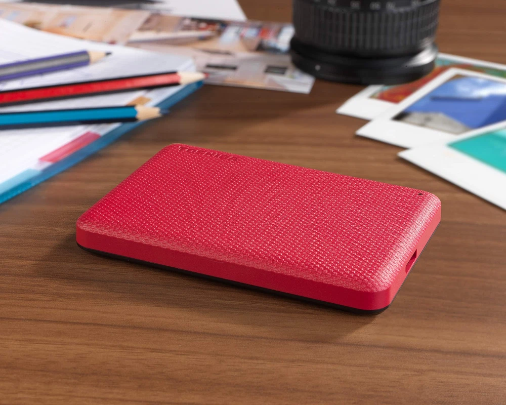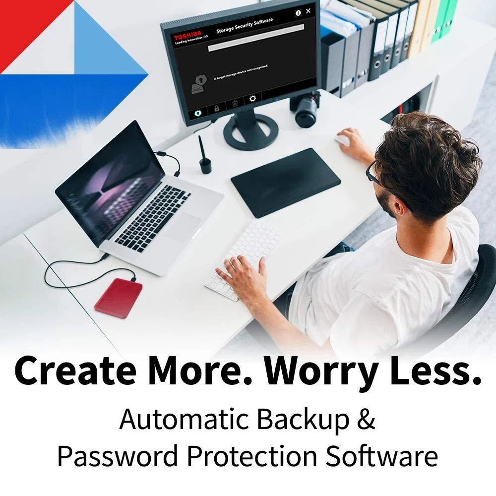 Product Page 1TB Red External Hard Drive USB 3.0 Automatic Backup Password Protection Description: Features: Compact design with stylish, textured finish and color options to fit your lifestyle. Automatic backup software to easily back up your content (free download, for Windows PC only). Password protection software to help prevent unauthorized access to your data (free download, for Windows PC only). USB 3.0 and USB 2.0 compatible.