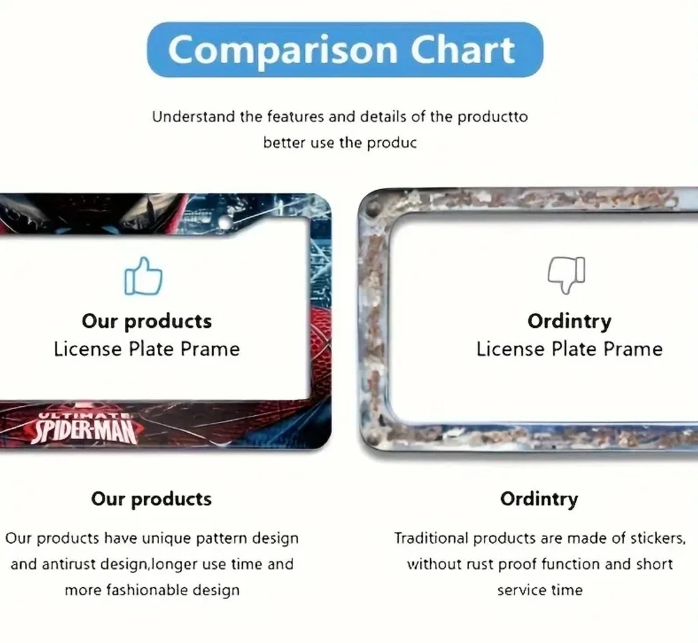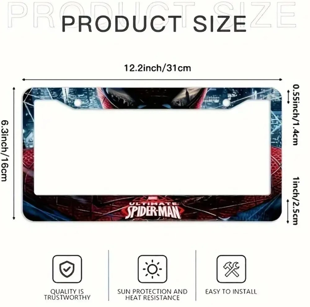 1x SpiderMan Aluminum Alloy License Plate Frame New 1x SpiderMan Aluminum Alloy License Plate Frame New Description High-quality aluminum alloy material for durability and long-lasting use Fits standard size license plates for both front or rear of your car Comes with mounting accessories including caps Sleek and stylish design adds a decorative touch to your car's exterior Protects your license plate from damage and wear Return and RMA Exchange Policy. Please refer to our Terms and Conditions page.