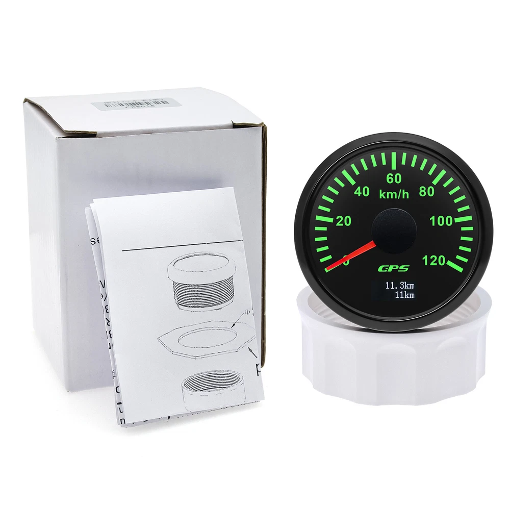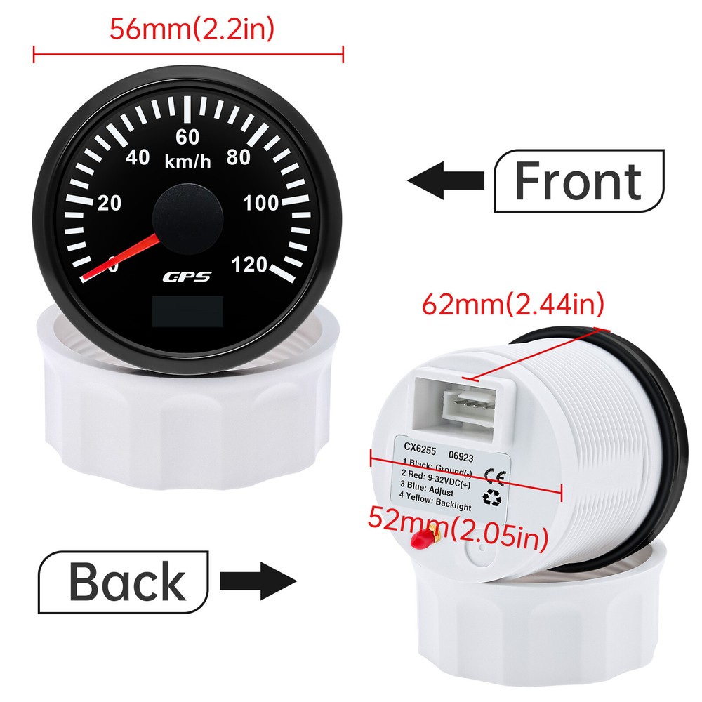 2" 52MM GPS Speedometer 0-120km/h Gauge for Motorcycle Boat Car Truck Waterproof 52mm Digital GPS Speedometer Speed Odometer Gauge 0-120Km/h for Car Boat Truck Specifications Item Name: 52mm GPS Speedometer Gauge Dial: Black Material: Stainless Steel 316L Bezel + Anti-fog Glass Install Diameter: Φ52mm or 2" Signal: GPS Working Voltage: 9~32V DC Working Current: ≤100mA Operating Temperature: -30℃ ~ 75℃ Storage Temperature: -40℃ ~ 85℃ IP67 waterproof and dustproof grade Indication Range: 0-120Km/h Backlight:7 Colors Backlight Product Descriptions High-brightness LED backlight. 316 stainless steel for long-term use even in acid-base, humid environment. IP67 waterproof and dust-proof grade. With curved glass( with anti-fog function). Suitable for all kinds of vehicle modification. Using stepper motor drive pointer, accurate display of the engine speed, and with the LCD display clear display mileage. Gauges have many kinds backlight color (red,yellow,orange,green,blue,purple,white),customers can adjust any color that you like. Connection: Black: Ground(-) Red: 9-32VDC Blue: Adjust Yellow: Backlight Package Includes: 1X 52MM Digital GPS Speedometer Gauge 1X Instruction 1X Wire Harness 1X GPS Antenna