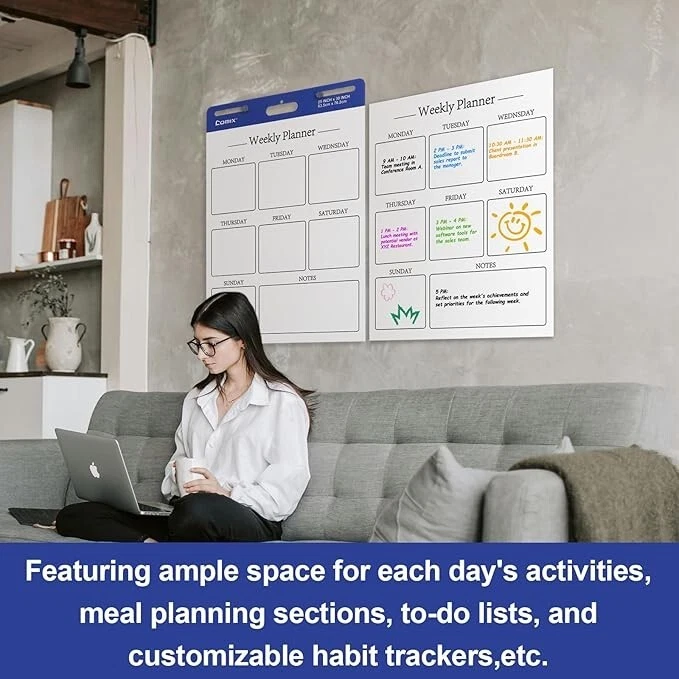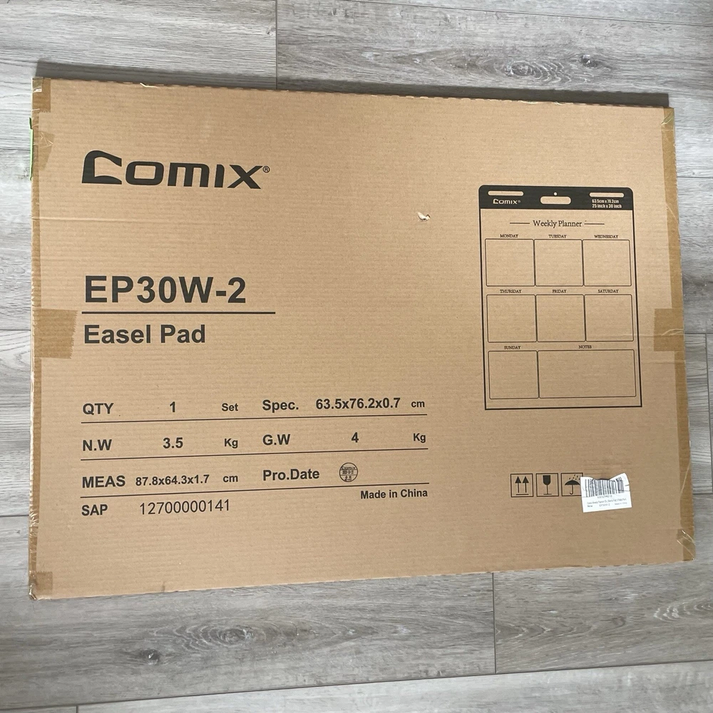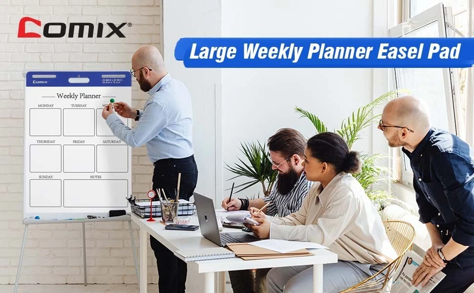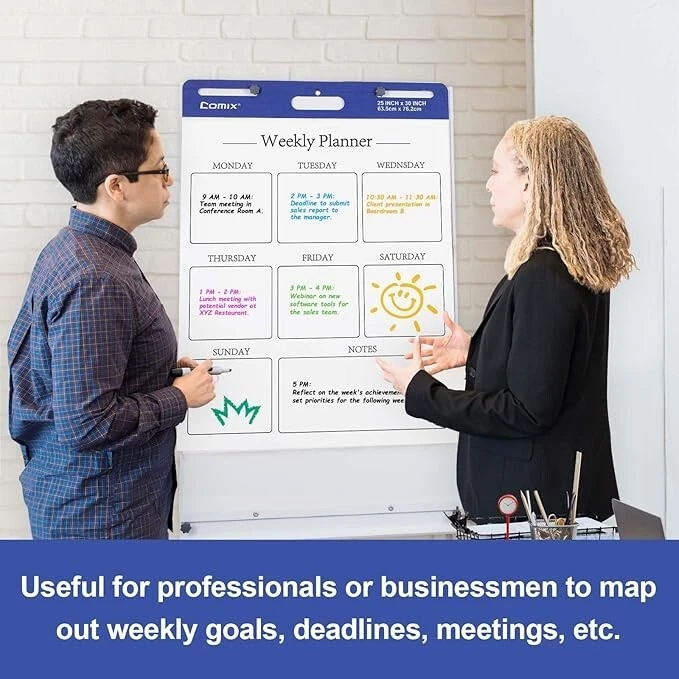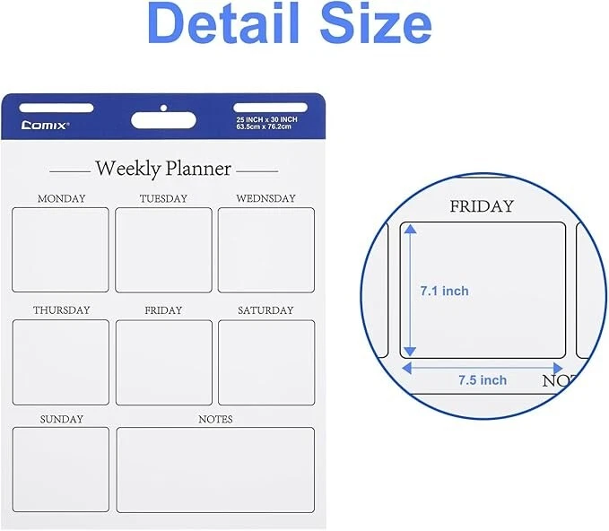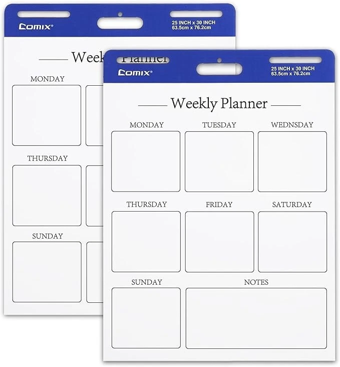 2-Pack Comix Extra Large Weekly Family Wall Planner 25x30 Sticky Calendar Easel Pads Two jumbo-sized weekly planners! Each comes with 30 sheets per pad, so together this purchase offers you 60 weeks (over a year!) of planning and organizational help. They're 25" by 30", with an adhesive on the back of each paper so you can stick them on your wall or wherever is most convenient. This product is completely new and unopened, so most of the photos are product photos. The long, thin box pictured at the end contains both pads and is the exact item you will receive in the mail. Reach out with any questions! Manufacturer information is below. Comix Weekly Planner Chart Paper, 25 x 30 Inches Weekly Calendar for Work Home ORGANIZE YOUR WORK AND LIFE Collaboration: In office settings or group environments, it can be used for a team to share a common schedule, promoting effective coordination of activities. Accessibility: Placing the easel pad in a shared space allows for easy access and visibility, reminding everyone involved of the week's plans. Easel pads can be torn off after week. Meeting Aid: During meetings, it can serve as an agenda guide, a space to jot down action items, or a way to display the week's focus to all participants. Large size: 25 in * 30 in Size of the grid: 7.1 in * 7.5 in 30 Sheets/Pad, 2 Pads/Pack Using a weekly planner easel pad effectively involves regular updates, noting down new appointments, and crossing off completed tasks, ensuring your schedule stays current and productive. About this item 【Large Size Chart Paper】 Comix flip chart paper comes in a large size of 25 x 30 inches, 30 Sheets/Pad, 2 Pads/Pack, providing plenty of space for writing and drawing. 【Super Sticky】This easel paper paper features a strong adhesive that sticks securely to most surfaces, making it easy to use in a variety of settings. 【Ink Bleed-Through Resistance】The large sticky notepad paper can resist bleed-through from markers or pens, ensuring that your notes and ideas stay clear and easy to read. 【Strong and Durable】Comix easel pad is made from 90 gsm thick, high-quality paper that are strong and durable, so it won't tear or rip easily. The cardboard is also strong enough for hanging and carrying. 【Versatile Use】Suitable for a wide range of applications, including office meetings, classroom lectures, training sessions, brainstorming, and more. 【Tips】Comix anchor chart paper is suitable for sticking on the indoor flat substrates ,such as latex walls, wooden door, glass, blackboards, whiteboards, metal, etc. lt is not recommended to stick on the conspicuously concave-convex substrates, specially diatomaceous mud wall or spray painted walls.
