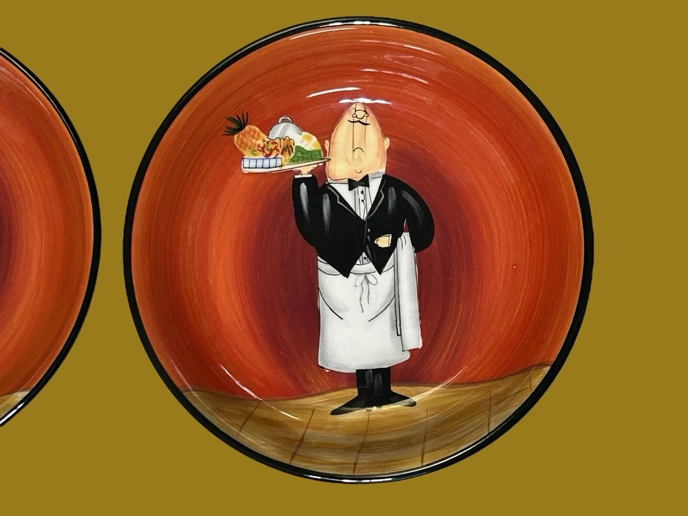 2 Dinner Is Served Bistro Waiter 9.5” Bowl Set By Certified International This set of plates might make you feel like you've hired a personal chef with their charming waiter designs. Whether serving up a gourmet meal or pizza night, these plates are here to add a dash of humor to your dining table. They're durable, microwave-safe, and dishwasher-safe. • 9.5" Diameter, 2" high • Dishwasher & Microwave Safe • Hand-Painted Ceramic • Made In China • Set Of 2 Plates • Playful Waiter Design Condition: Pre-owned, good. Light surface wear. No chips or cracks. PRE-owned, as-is, please zoom in to pictures for details of condition. Pictures are part of the detailed description. We only do returns/refunds on items purchased that are not as described and shown in photos and/or damaged in shipping. Please feel free to ask any questions before purchase and let us know if something is wrong with this listing! Shipping: Friday-Sunday purchases ship Monday Monday-Tuesday purchases ship Wednesday Wednesday-Thursday purchases ship Friday We usually ship USPS Ground Advantage or Fedex with Larger packages. Most of our shipping fees are at fixed rates. We apply averages based on calculated shipping costs given to us by ebay. Some zip codes cost us more and some less. So we pick a middle number. On large and heavy packages we may do calculated shipping which may show the cost very high for some people living on the west coast/Alaska for example. If you send us a message and your cost is outrageous based on our actual shipping cost, we don't mind refunding the difference in actual shipping/packaging costs. We wish there was a perfect way to charge on shipping, but there is not. Thanks for looking! Pops AA054 L/24