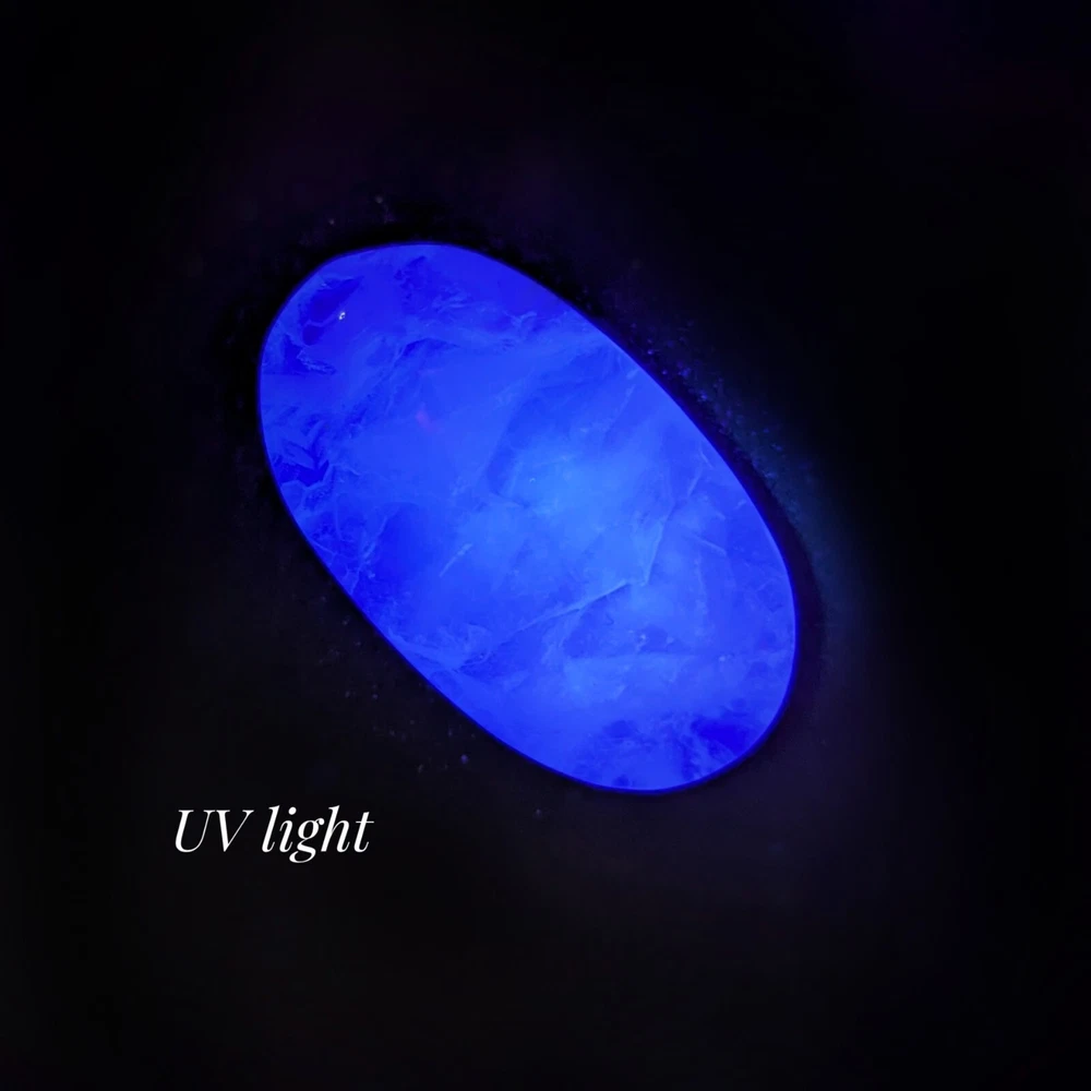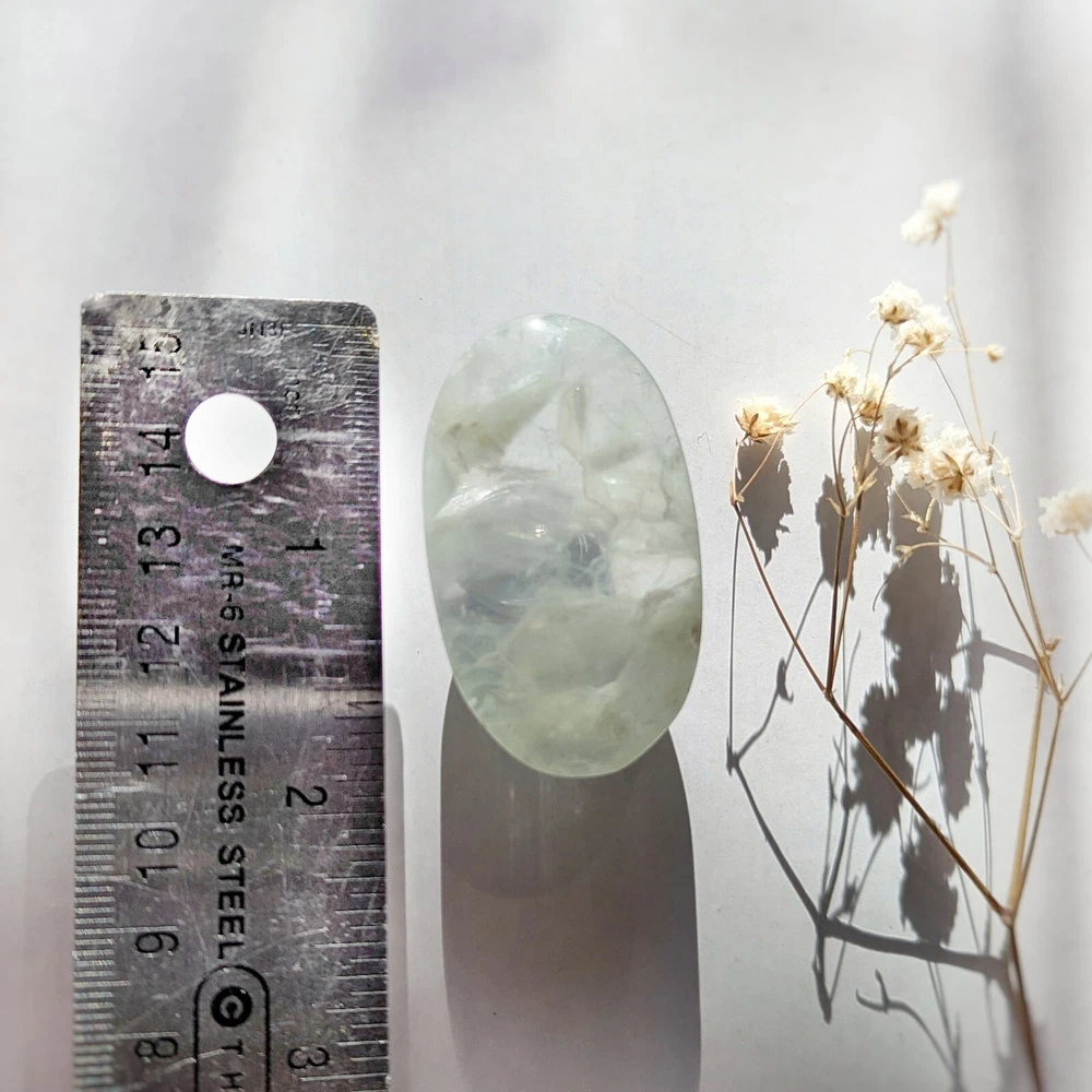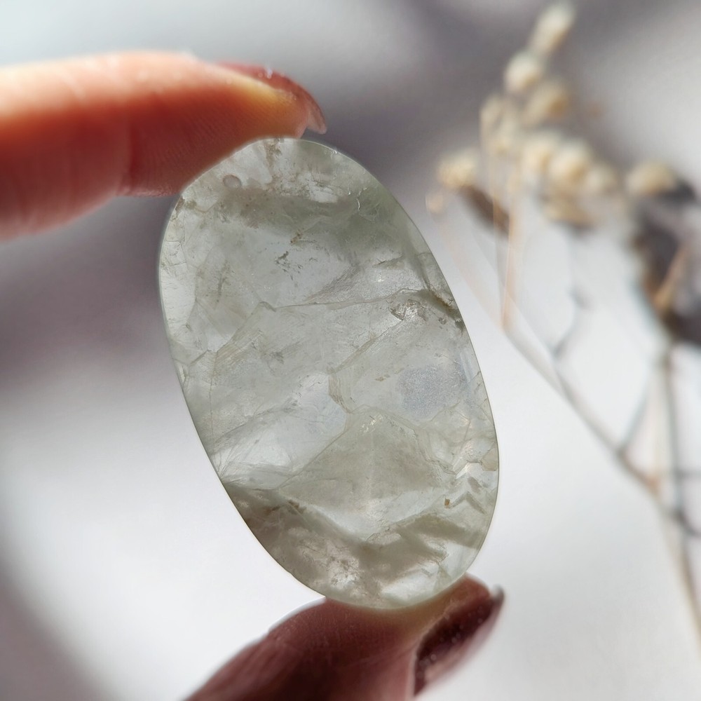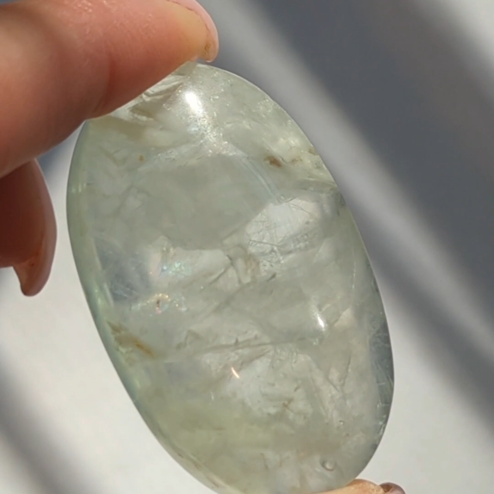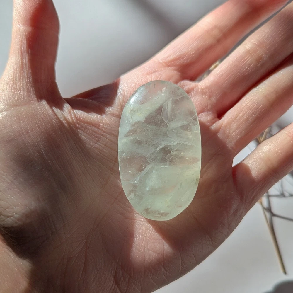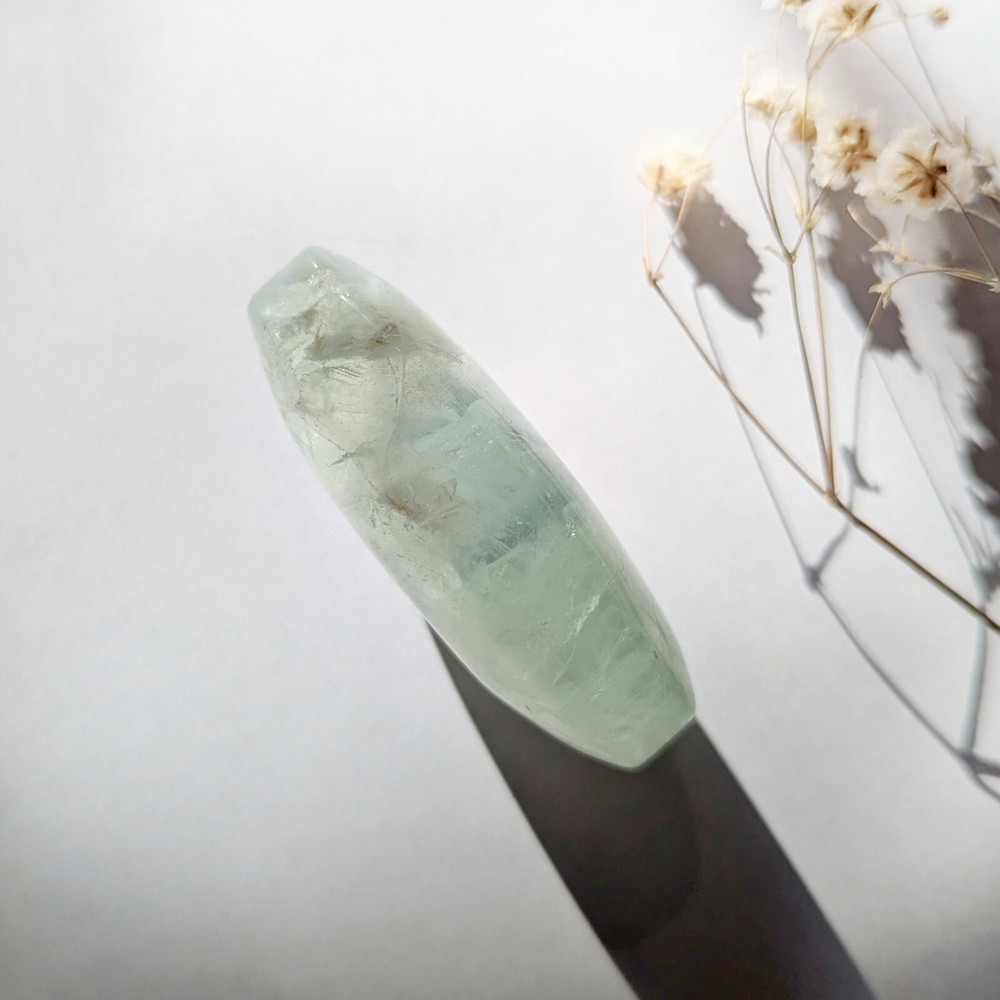 please read entire description! very stunning piece of translucent minty green fluorite. has some white inclusions, perhaps calcite? fluoresces bright blue under UV light. has lots of little shimmers and some interior rainbows. a really pretty one. 2" long, please see last photo for size reference. crystals are from mother nature and polished by humans, so minor imperfections exist that make them all the more charming! photos are taken in natural lighting and edited to look true to life, while videos are unedited. please note that colours may appear different on various screens. item will dispatch for shipping between 1-3 business days. please ensure that your address is correct, i am not responsible for mail mishaps. all sales are final. thanks for looking ~