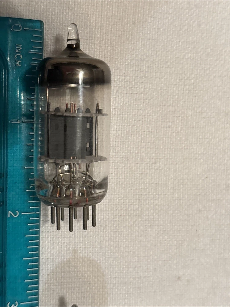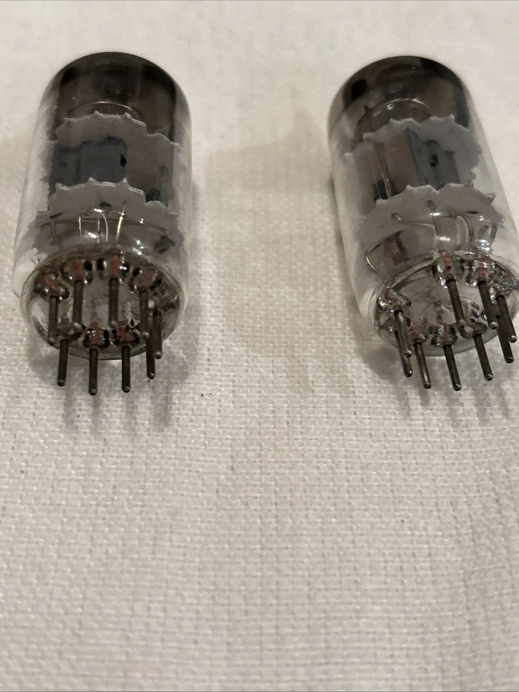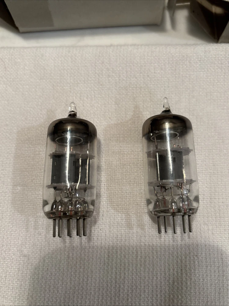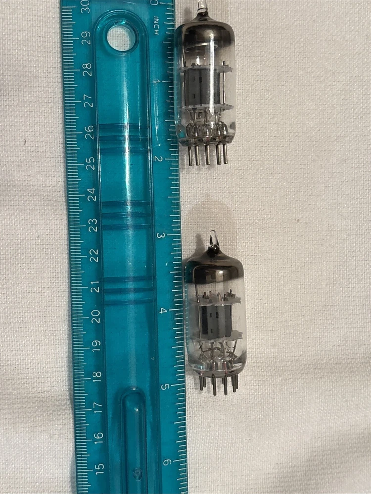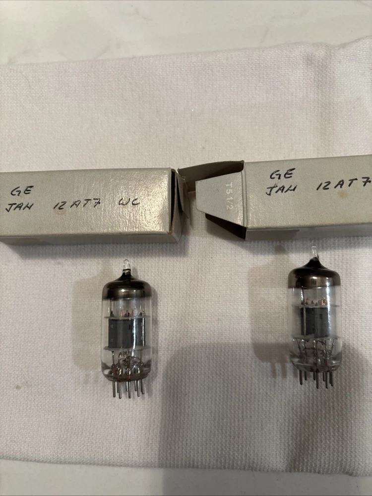 This listing includes two GE JAN 12 AT7 vacuum tubes, perfect for vintage audio and video enthusiasts. These tubes are designed for use in a variety of applications, including amplifiers and oscillators. They are 2.25 inches tall. They are practically brand new and hardly broken in. Don't miss out on the opportunity to enhance your vintage audio setup with these high-quality vacuum tubes.