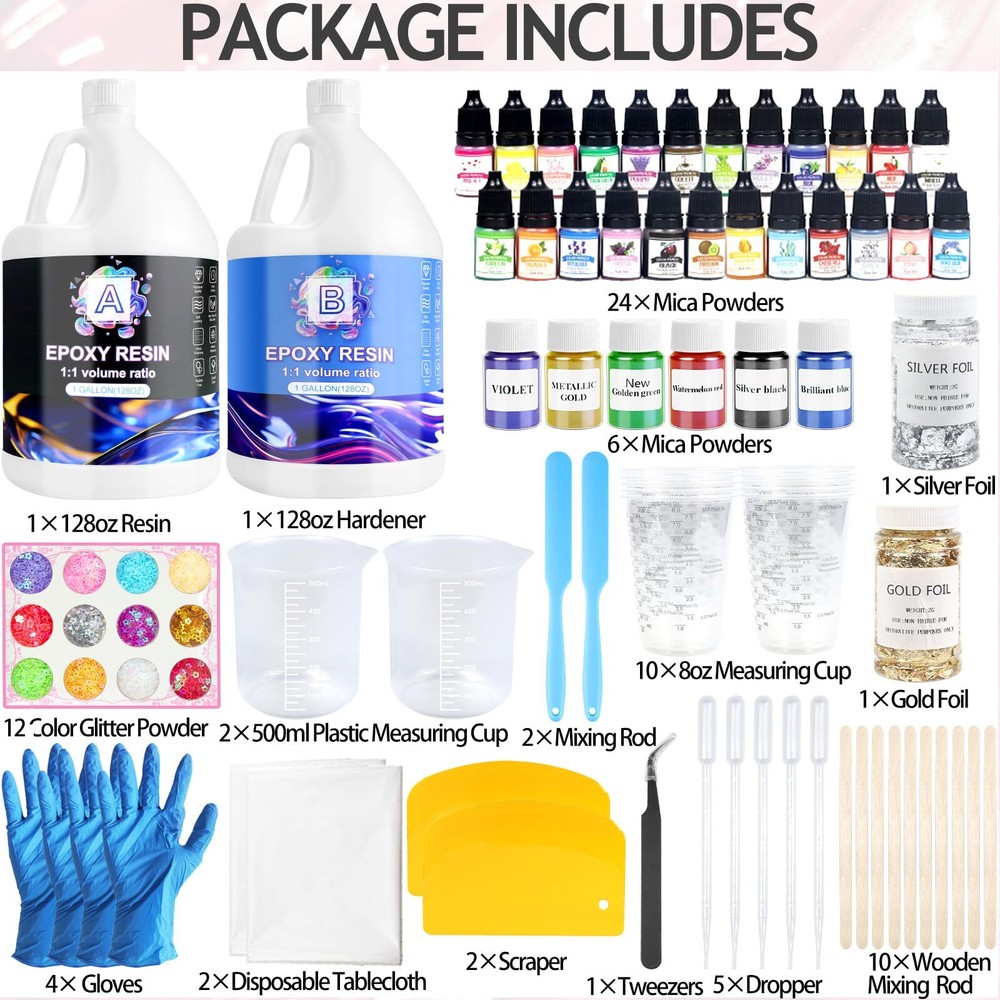 Epoxy Resin 2 Gallon Kit, Clear Resin Epoxy, Resin Kit - High-Gloss,No Bubbles, Not Yellowing, Self-Leveling Art Resin Casting Resin for DIY Art,Crafts,Jewelry,Table Top,Wood & Resin Molds Complete Epoxy Resin Kit : Our epoxy resin kit contains everything a beginner needs and can be used to try out many colorful resin crafts: 1 gallon crystal clear resin A, 1 gallon crystal clear hardener B, 6 colors of mica powder, 12 colors of glitter powder, 24 colors of toner, 1x gold foil, 1 x silver foil, 2 x 500 ml measuring cup, 2 x plastic mixing rod, 10 x 8 oz measuring cup, 10 x wooden mixing rod, 2 x scraper, 5 x dropper,1x tweezers,2 x table cloth, 4 x gloves. Suitable for DIY handmade art Safe & High Quality: Our resin kit is made with non-toxic materials, safe, no harsh chemicals, odorless. Excellent defoaming formula and our innovative self-leveling technology will automatically releases trapped bubbles, eliminating bubbles, achieve flawlessly smooth surfaces effortlessly.The anti yellowing performance of the upgraded formula is twice that of traditional epoxy resin,clear,long-lasting, won't turn yellow,ensuring that your artwork maintain their vibrant colors for years to come Easy To Use: Even if you haven't been exposed to it before, you can start quickly. Mix glue A and glue B 1:1 into the epoxy mixing cup, or epoxy resin molds, gently stir not easy to create bubbles, easy to use resin will automatically smooth, you can also mix epoxy color pigment, or add glitter, you can also pick up gold and silver foil with tweezers and put it in. Make your resin art more colorful, it will cure quickly within 24 hours, so you have a rich color of resin crafts Widely Applications: Our epoxy resins are suitable for a wide variety of applications, it can be used for desktop, bar table, ashtray or Wood finishes,a variety of colors are also suitable for DIY jewelry making,Mobile phone case.You can give full play to your imagination and creativity, use our epoxy resin kit to create a variety of beautiful resin crafts. The artwork you personally create will be the present for friends and family Strict Quality Control: To ensure that you receive a satisfactory resin kit, every batch of resin undergoes strict quality testing before shipment. If our products have failed your expectations or there are any issues (leakage, loss, usage issues), please tell us at any time. We will respond within 24 hours. It is recommended to read the instructions carefully provided with the epoxy resin kit before use and then test in a small amount before operation Note: If medical advice is needed, have product container or label at hand. Keep out of reach of children. Read label before use. Avoid breathing vapors. Wash hands and face thoroughly after handlingUse onlv outdoors or in a well-ventilated area. Wear protective gloves/ eve protection/ face protection.Contaminated work clothing must not be allowed out of the workplace.for skin: Wash with plenty ofwater. If skin irritation or rash occurs: Get medical advice/attention.fin eyes: Rinse cautiously with water for several minutes. Conditions for safe storage, including any incompatibilities Requirements to be met by storerooms and receptacles: Store in a cool and well-ventilation place Shipping We offer FREE shipping on all orders! We ship within Three business days of payment, usually sooner. We use a selection of shipping services such as UPS, FedEx, USPS etc. We only ship to the lower 48 states, no APO/FPO addresses or PO Boxes allowed. Local pickups and combined shipping options are not provided at this time. Return You can return a product for up to 30 days from the date you purchased it. Any product you return must be in the same condition you received it and in the original packaging. Please keep the receipt. Payment We accept payment by any of the following methods: PayPal Please pay as soon as possible after winning an auction, as that will allow us to post your item to you sooner! Feedback Customer satisfaction is very important to us. If you have any problem with your order, please contact us and we will do our best to make you satisfied. Contact Us If you have any queries, please contact us via ebay. We usually respond within 24 hours on weekdays. Please visit our eBay store to check out other items for sale! Thank you for shopping at our store.