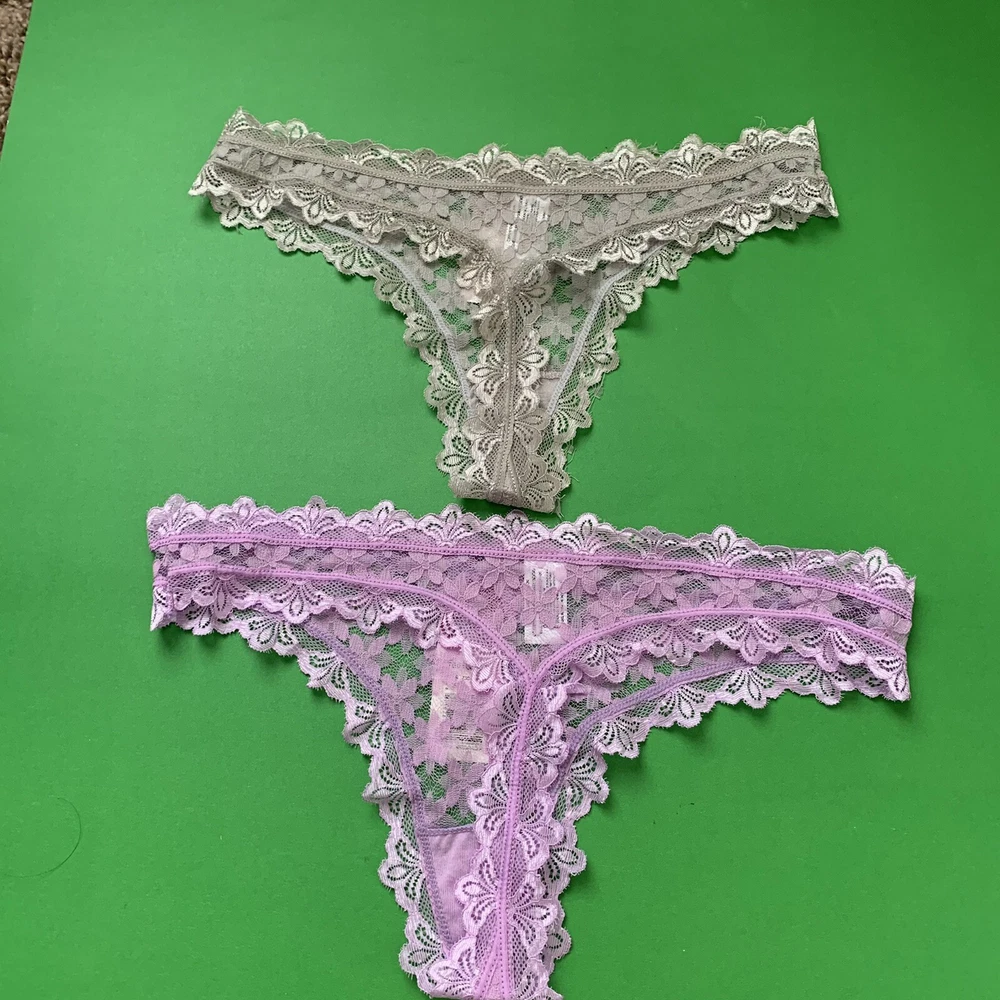 2 Hers By Herman Lace Thongs Grey purple Floral Size Large Scalloped Edges New.