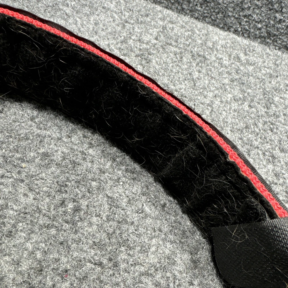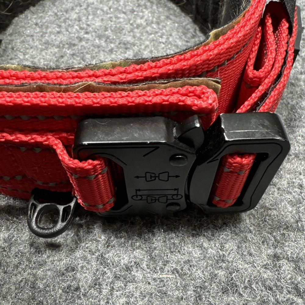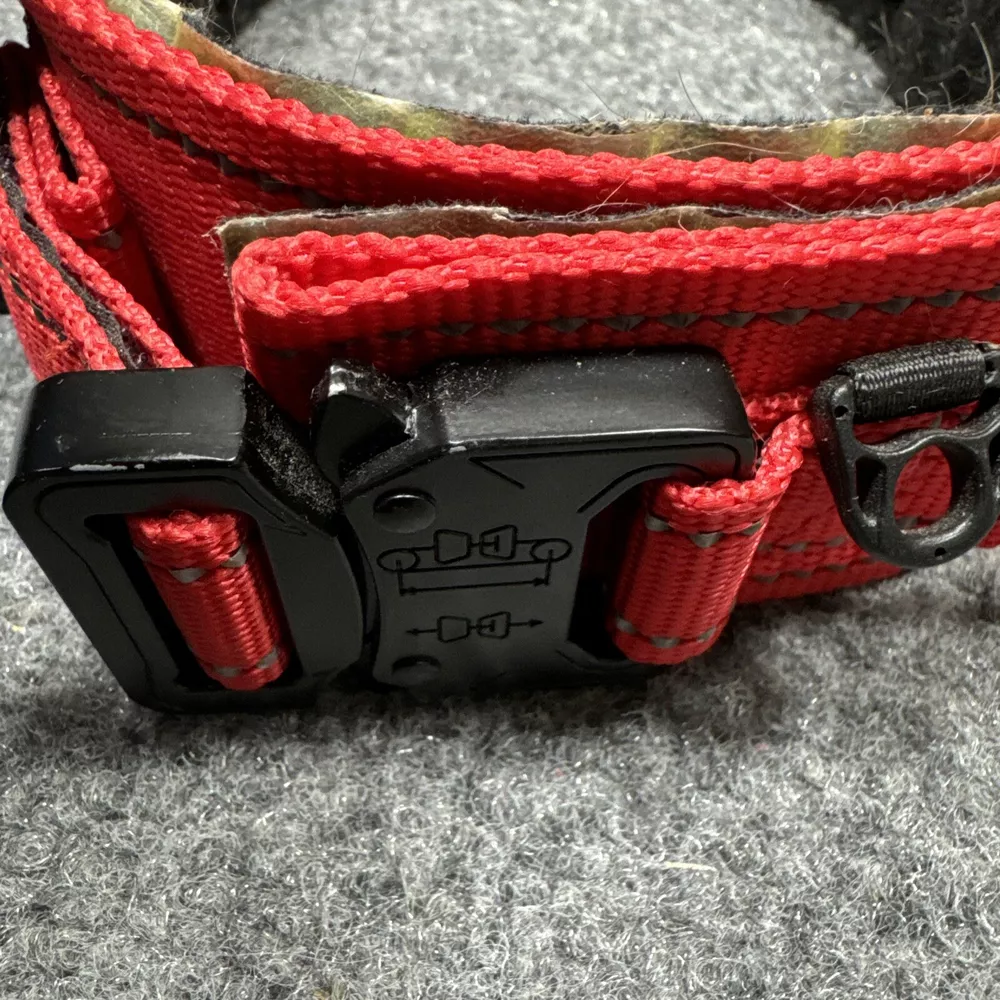 Introducing a top-quality 2-inch dog collar with a control handle and quick-release metal buckle. This collar is perfect for dog breeds such as German Shepherds, Labradors, and K9s, and is available in red color. The collar is made of durable polypropylene webbing material, and features a US flag patch, 10-inch hook and loop, personalized option, and adjustable strap. This tactical collar is designed for dog owners who want to ensure their dog's safety and control while on walks or during outdoor activities. With its sturdy construction and multiple features, this collar is an excellent choice for any dog owner. Hair on collar that will need to be cleaned off as seen in photo, priced accordingly.