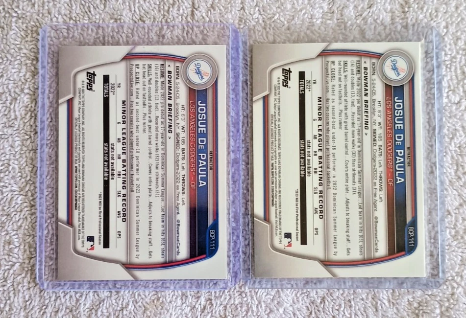 2 JOSUE DE PAULA 2023 BOWMAN CHROME LUNAR REFRACTOR RC LOT # BCP111 LA DODGERS SHIPPING WILL BE $4.99. I DO COMBINE SHIPPING FOR ADDITIONAL ITEMS PURCHASED. PLEASE CONTACT ME FOR DISCOUNTED RATES. USPS FIRST CLASS SHIPPING UNLESS OTHERWISE LISTED. I ONLY SHIP TO THE U.S. EBAY SELLER WITH 100% FEEDBACK. PLEASE VIEW MY OTHER LISTING. MONEY BACK IS GURANTED IF YOU NOT SATISFIED WITH THE RETURN OF THE ITEM OR ITEMS.