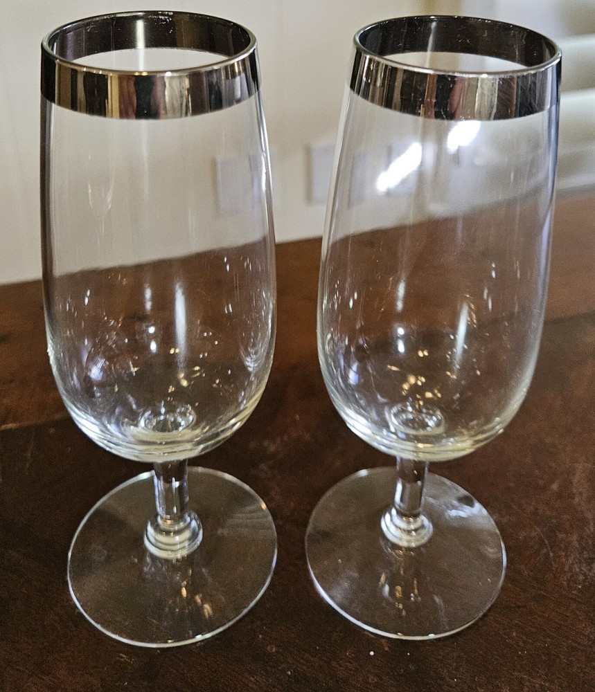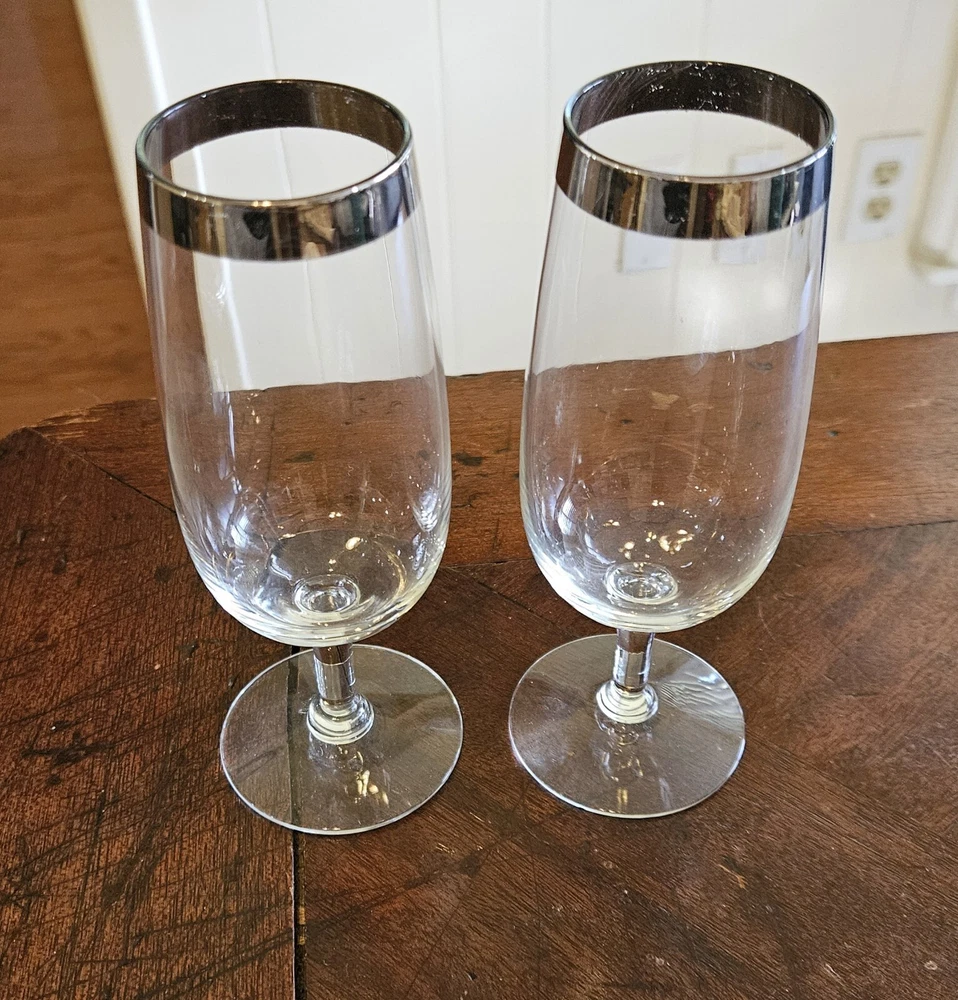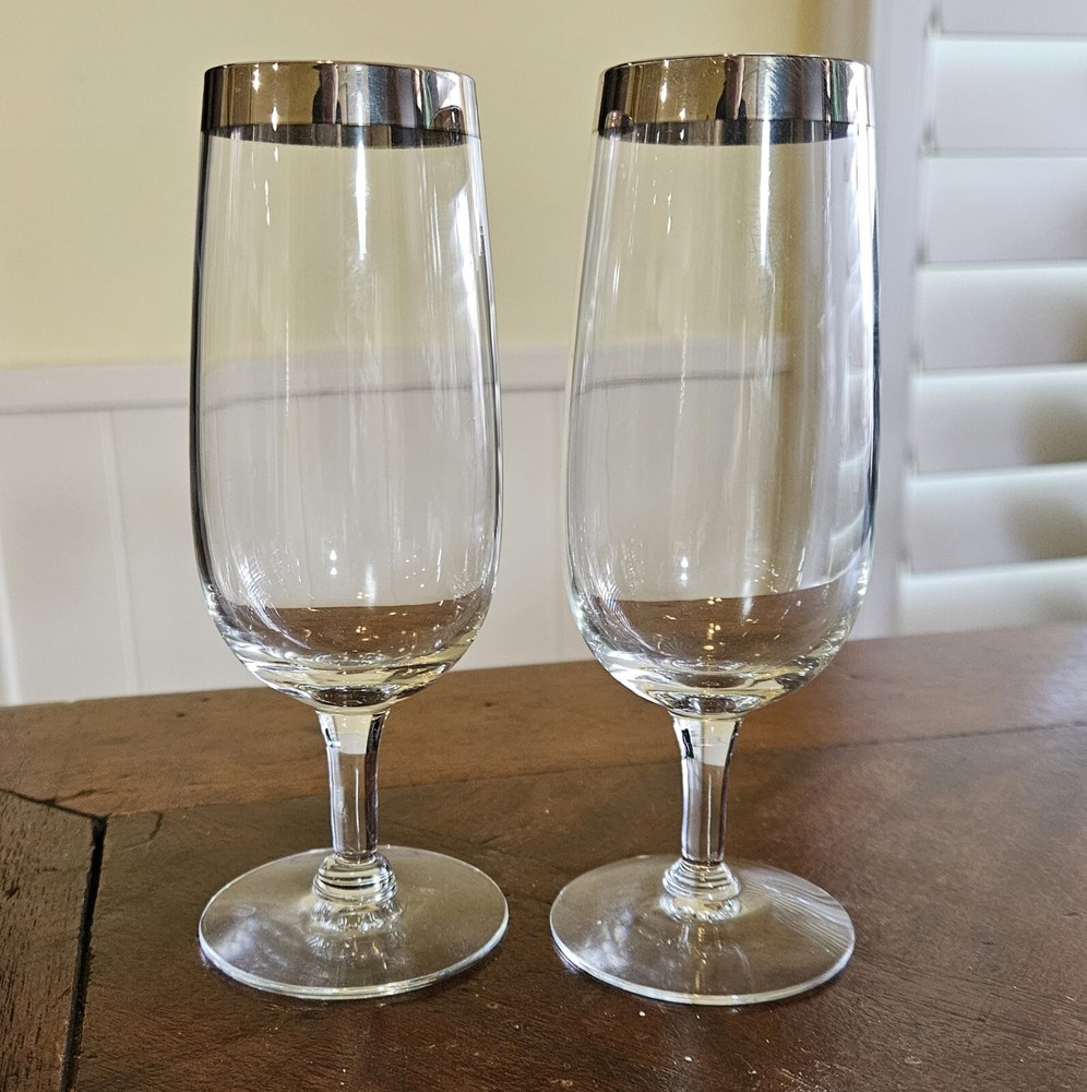 Pair Dorothy Thorpe Silver Rim Champagne Flute Wine Glass Short Stem Tapered 6"