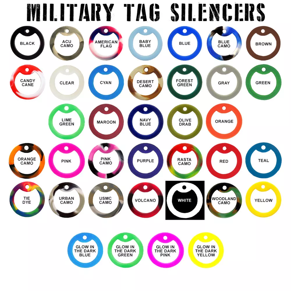 Custom Embossed Military Dog Tag Set PRODUCT DESCRIPTION The Dog Tag set includes: 2 Custom Embossed Aluminum Military Dog Tags 2 Stainless Steel Ball Chains (1 - 27" & 1 - 4.5") 2 Dog Tag Silencers - You choose a color (If no color is selected black will be sent) Tag-Z Military Dog Tags are regulation sized Military dog tags. They are 2 inches wide by 1.125 inches tall. Our tags come with real US military chains. The chain is a US made T304 Stainless Steel chain and is made with stainless steel made in the USA. Our chains are the same chains used by the US Military for our soldiers. Tag-Z Military ID tags also come with black military dog tag silencers to protect the tag and keep it from jingling. To close the chain - Put the ball into the connector and pull both sides of the chain away from the connector until the ball ‘snaps’ into place. These are really tough stainless-steel ball chains so sometimes it takes a good tug. HOW TO ORDER *** If we do not receive your information, we will send you blank tags. *** Our custom tags have 5 lines. Each line has 15 spots to put a character or space. Spaces count as a spot. Text is LEFT ALIGNED . The Available Characters are: A B C D E F G H I J K L M N O P Q R S T U V W X Y Z 0 1 2 3 4 5 6 7 8 9 & , . - / ( ) @ * + ! ? “ : ; $ # Here is an example of what to send for your order: Silencer Color: Line 1: JONES Line 2: JANET A. Line 3: 123-45-6789 Line 4: A POS Line 5: CHRISTIAN SHIPPING We ship free to the United States and Puerto Rico. We are enrolled in the Ebay Global Shipping program. For international shipments please check the shipping tab for rates. ABOUT US We specialize in Custom made Military dog tags and Custom pet tags. If you have any questions or concerns, please send us a message through Ebay and we will be glad to help!