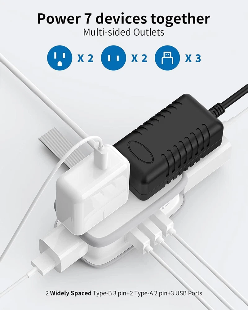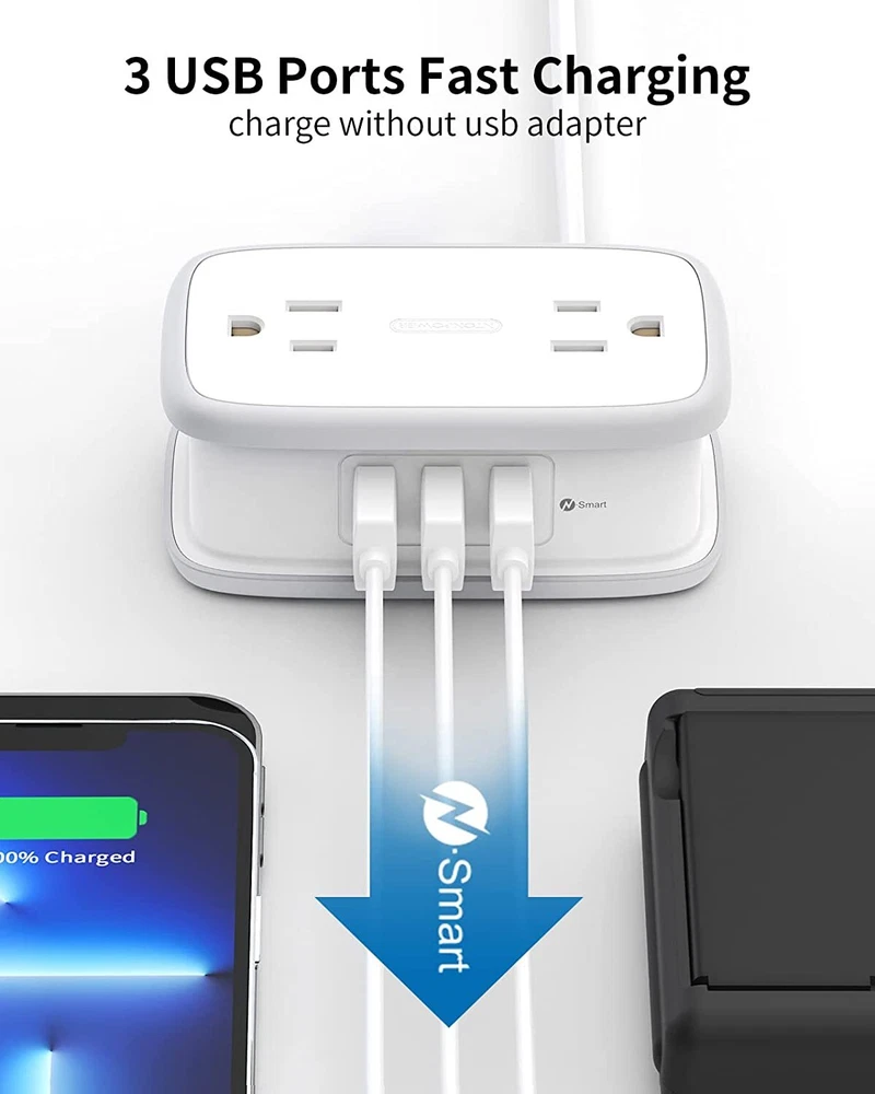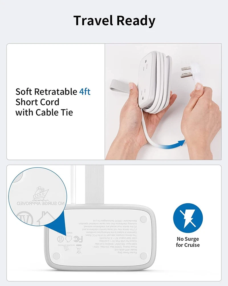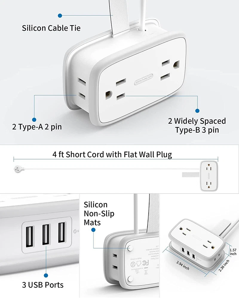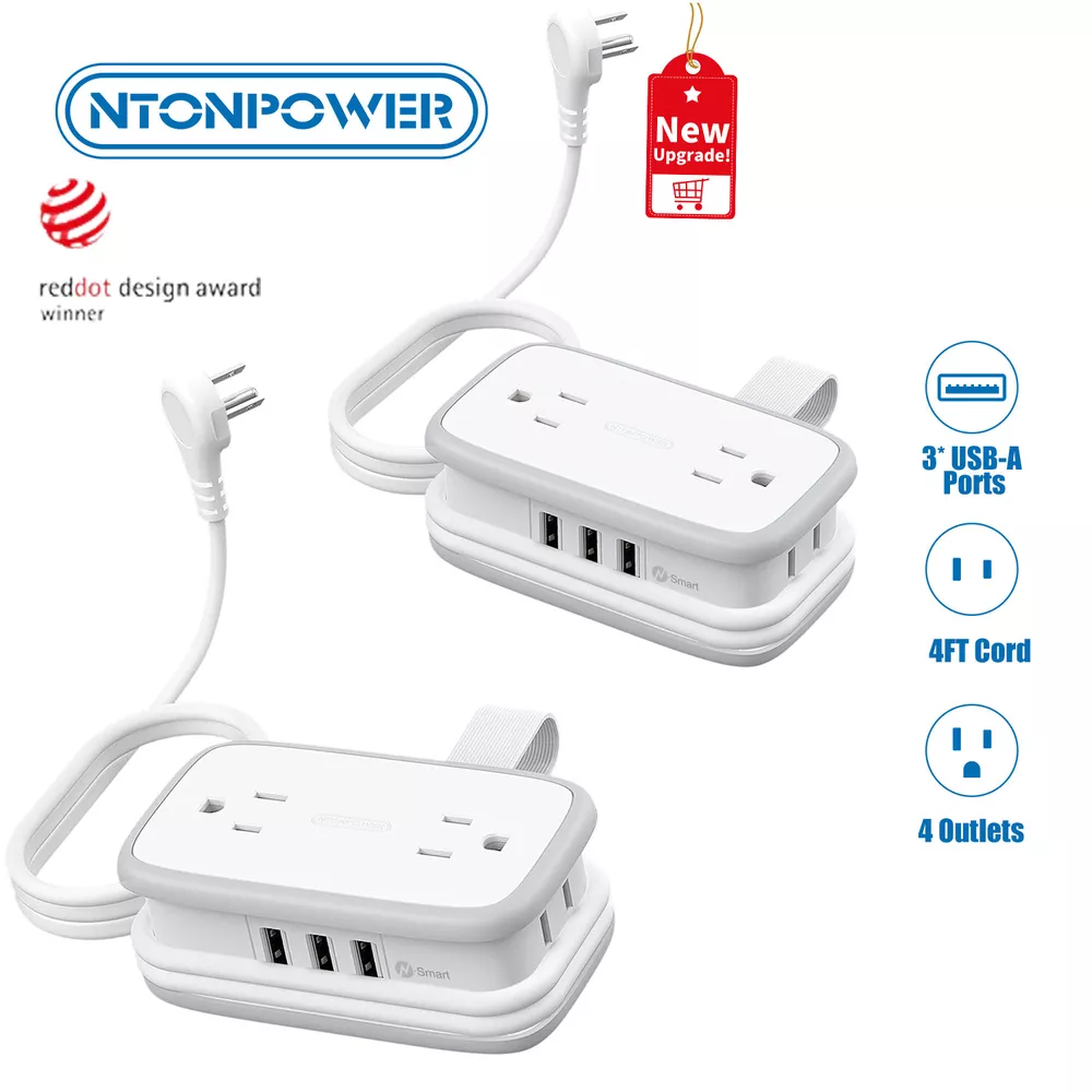 NTONPOWER Travel Power Strip 4 Outlets and 3 USB with 4Ft Short Extension Cord Features: 【 Special Wrapped Cord Design 】: 4Ft short extension cord wraps around this travel power strip which helps to get rid of tangling cords, Also equipped with reusable fastening cable ties can tie up the cord. According to the indicated wrap around the body of the strip, Soft retractable extension cord with a 45-degree angled flat plug can be hidden into the trunking and ac outlets, easily fit into your pocket, luggage, and bag. 【 Cruise Ship/Travel Must Have 】: Compact and lightweight body is very easy to carry everywhere you go. A mini power strip small size as a credit card can be your pocket power strip. This travel extension cord with usb ports is designed with so surge protection, making it a cruise approved power strip 【 Space-Saving 】: 4 Outlets with 3 USB(2 Type-B 3 pin and 2 Type-A 2 pin) small power strip can charge 7 devices simultaneously, such as phones, tablets, laptops, lamps, etc, without a variety of converters on the go. This portable powe strip that saves the space and makes the desktop organized, perfect for office desk accessories, cruise ships and travel. 【 Advanced Travel Charging Station 】: The portable extension cord features 3 USB ports totally provide 15.5W fast charging (5V 2.4A, 12W max). This desktop charging station built-in smart charging technology that detects and delivers the fastest possible charge speed up to 5V/2.4A per port(2.4A Max). NO NEED for a variety of converters, Ideal for multiple devices charged together, well as a travel power strip or a nightstand charging station. 【 Multi-Protection Safety System 】: NTONPOWER travel power strip with usb ports made of high strength fireproof ABS+PC material can bear high temperatures up to 1382℉ and high-end solid capacitor ensure complete protection for your devices from electrical short circuit, overheating, overcharging, over current, and overvoltage. Listed by FCC and RoHS, safety is more guaranteed. 【 Hassle Free Purchase 】: No worries at all if EBAY return window closed after1 month. Directly contact us within the 18 months warranty for quality-related replacement or refund. NTONPOWER compact power strip also backed by $300, 000 connected device liability insurance.