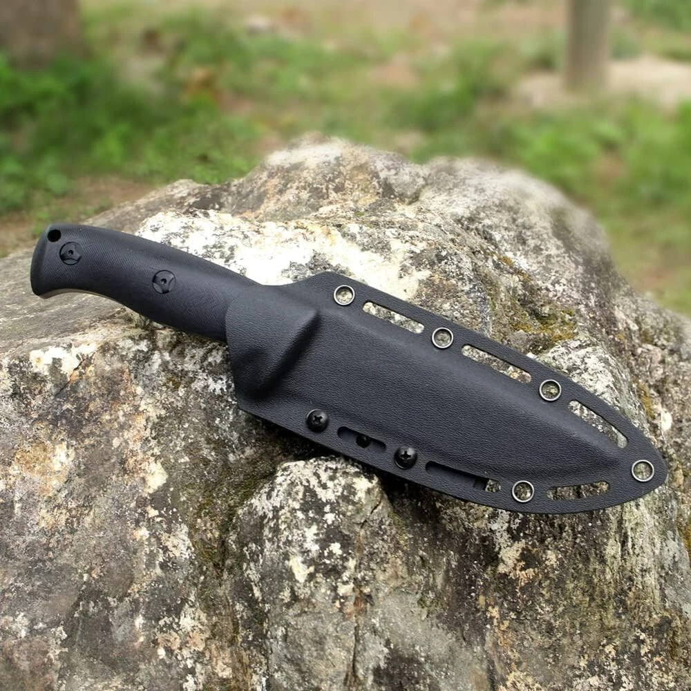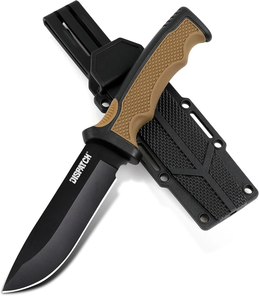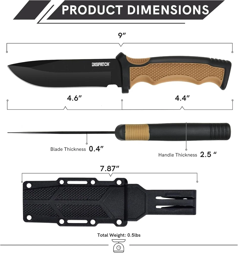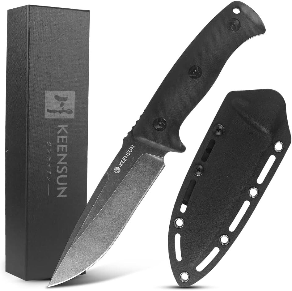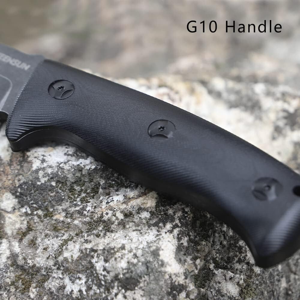 KEENSUN Fixed Blade Hunting Knife with D2 Blade and Black G10 Handle Outdoor Survival Camping Knife Perfect Tool for Men, Good for Camping, Hiking and Outdoor Activities About this item Perfect Design: Fixed Blade Hunting Knife Overall length:10.2", Blade length: 5.2",Weight:11.16 oz, Blade Thickness: 0.19". High Quality: The fixed blade hunting knife blade is made of D2. The blades are hard and sharp with a hardness of up to 60 HRC. Blades in D2 grade are extremely tough and have excellent edge retention for extremely precise cuts. The surface is treated with titanium plating, which can effectively prevent rust. The handle is made of G10 (polymer composite material), which has super corrosion resistance and slip resistance. Beneficial for long-term use. Multi-purpose: Fixed blade hunting knives are versatile and ideal for outdoor activities such as hunting, camping, fishing and hiking. A perfect knife for outdoor adventures. Best Idea for Gift: This fixed blade hunting knife can be used as an ideal gift for boyfriend, husband, father, mother, wife and girlfriend on special days. If you're looking for a meaningful and unique gift for someone who loves hunting, outdoor adventures, travel and hiking, then our fixed blade hunting knives are perfect! Dispatch Tactical Fixed Blade Knife with Sheath, 9 Inch Survival Hunting Knives with Non-Slip Handle for Outdoor Camping, Hiking, Bushcraft, EDC About this item Premium Stainless Steel Blade: Crafted with high-quality stainless steel, the blade is sharp, durable, and rust-resistant Ergonomic Design: Our fixed blade knife features a comfortable handle with a non-slip grip for precise and safe handling Practical Sheath: The square-shaped sheath is both decorative and functional, easily attachable to a belt for convenient travel Compact Size: With a length of 8.9 inches and a 4.2-inch blade, it provides a balanced feel at 7.4 ounces Best Gift: Whether it's for avid hikers, campers, or hunters, this fixed-blade is nice gift