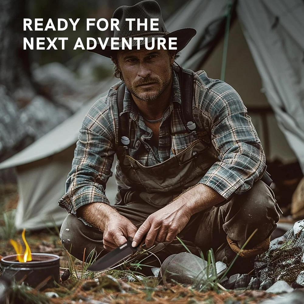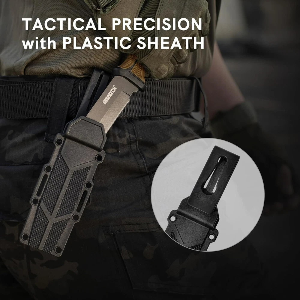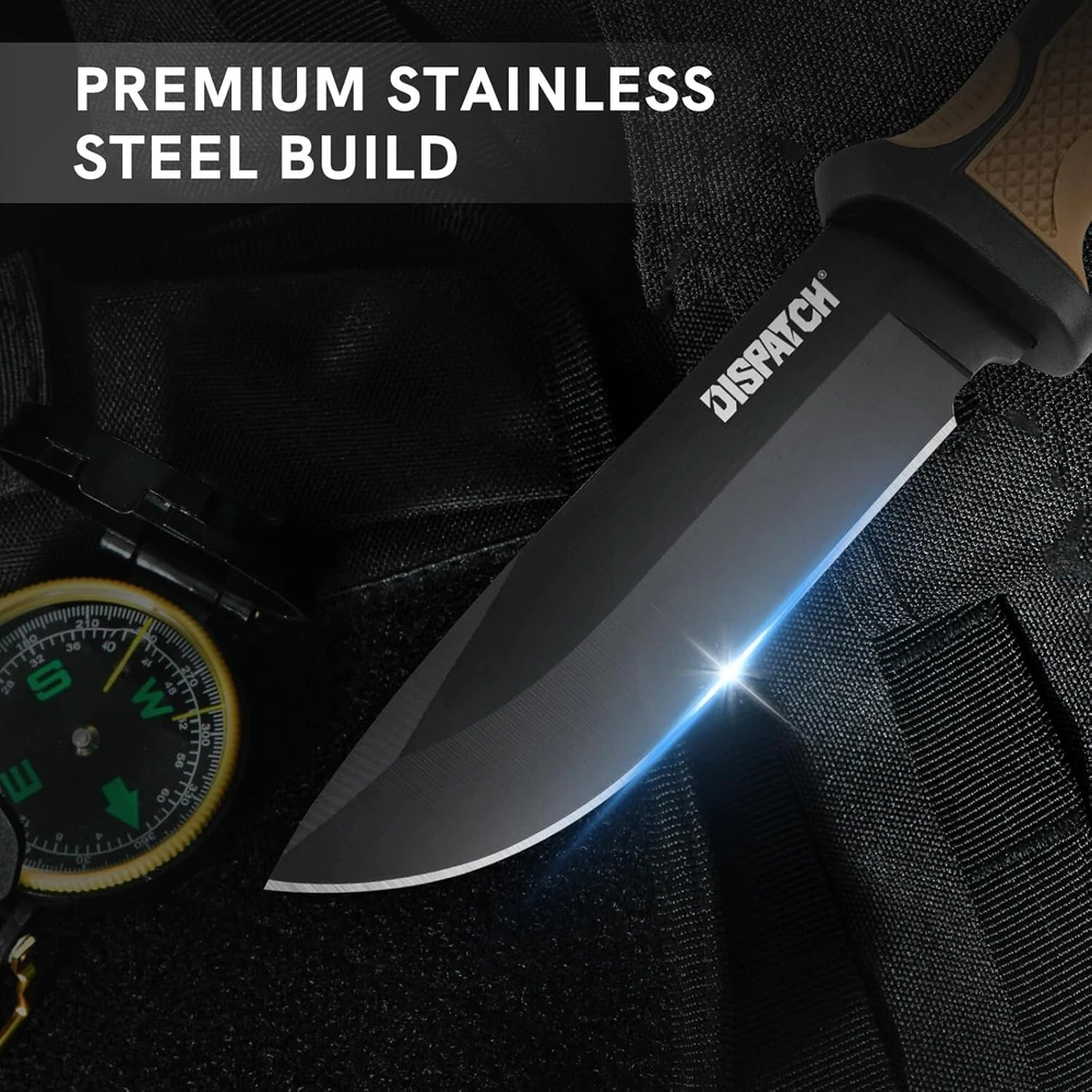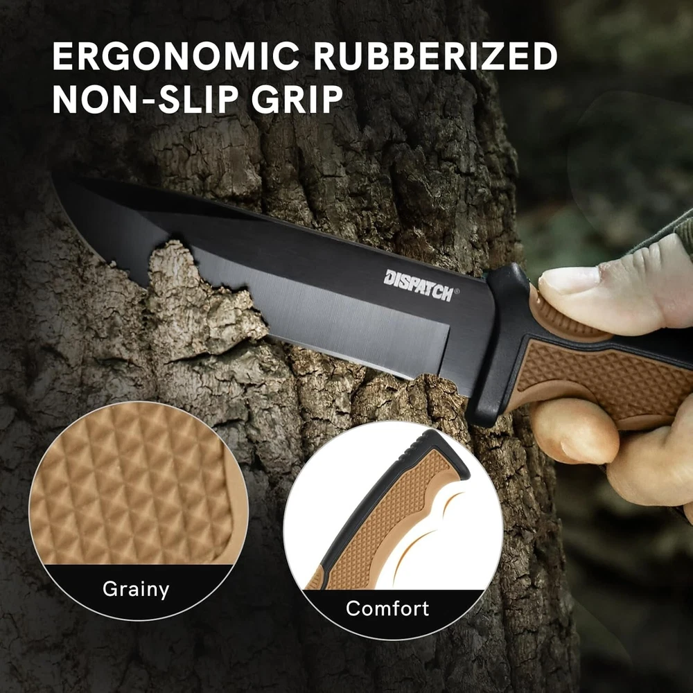 KEENSUN Fixed Blade Hunting Knife with D2 Blade and Black G10 Handle Outdoor Survival Camping Knife Perfect Tool for Men, Good for Camping, Hiking and Outdoor Activities About this item Perfect Design: Fixed Blade Hunting Knife Overall length:10.2", Blade length: 5.2",Weight:11.16 oz, Blade Thickness: 0.19". High Quality: The fixed blade hunting knife blade is made of D2. The blades are hard and sharp with a hardness of up to 60 HRC. Blades in D2 grade are extremely tough and have excellent edge retention for extremely precise cuts. The surface is treated with titanium plating, which can effectively prevent rust. The handle is made of G10 (polymer composite material), which has super corrosion resistance and slip resistance. Beneficial for long-term use. Multi-purpose: Fixed blade hunting knives are versatile and ideal for outdoor activities such as hunting, camping, fishing and hiking. A perfect knife for outdoor adventures. Best Idea for Gift: This fixed blade hunting knife can be used as an ideal gift for boyfriend, husband, father, mother, wife and girlfriend on special days. If you're looking for a meaningful and unique gift for someone who loves hunting, outdoor adventures, travel and hiking, then our fixed blade hunting knives are perfect! Dispatch Tactical Fixed Blade Knife with Sheath, 9 Inch Survival Hunting Knives with Non-Slip Handle for Outdoor Camping, Hiking, Bushcraft, EDC About this item Premium Stainless Steel Blade: Crafted with high-quality stainless steel, the blade is sharp, durable, and rust-resistant Ergonomic Design: Our fixed blade knife features a comfortable handle with a non-slip grip for precise and safe handling Practical Sheath: The square-shaped sheath is both decorative and functional, easily attachable to a belt for convenient travel Compact Size: With a length of 8.9 inches and a 4.2-inch blade, it provides a balanced feel at 7.4 ounces Best Gift: Whether it's for avid hikers, campers, or hunters, this fixed-blade is nice gift