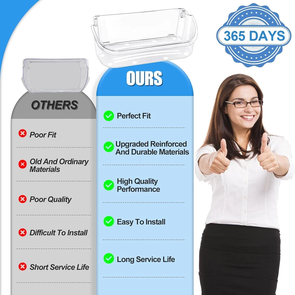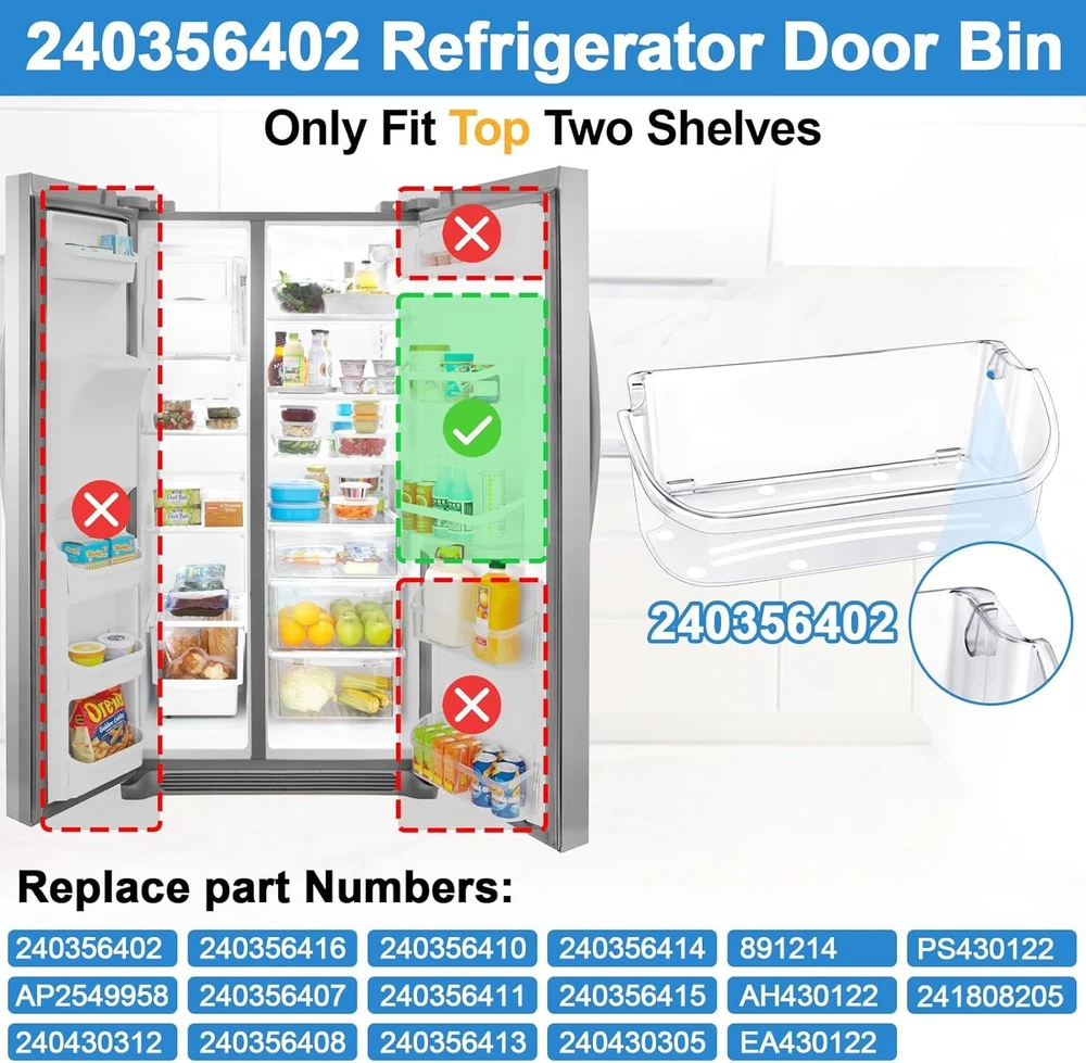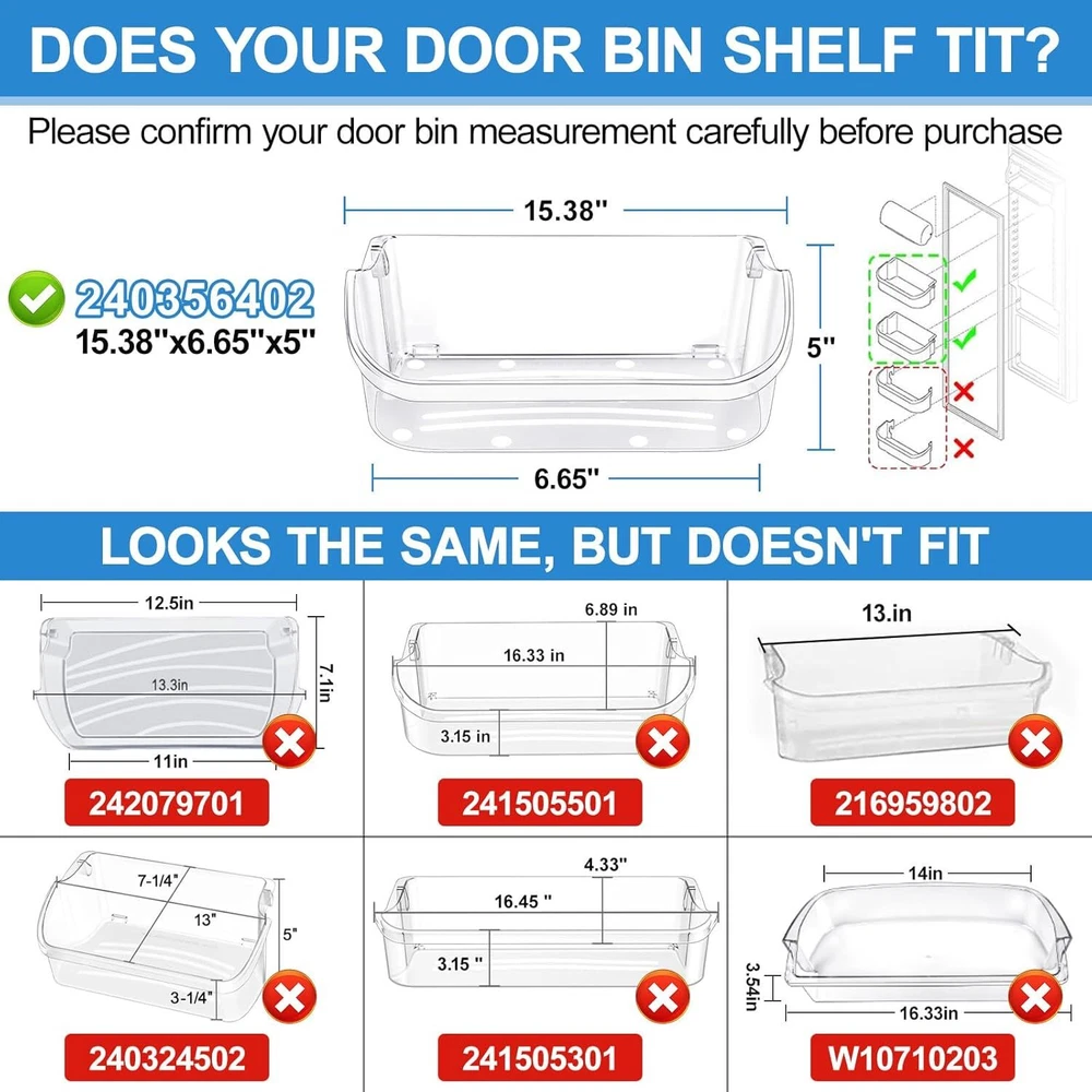 [2 PACK] UPGRADED 240356402 Refrigerator Door Bin 240356402 door bin 2 PACK Product Details Manufacturer: ALVAR Part Number: 240356402 Item Weight: 2.99 pounds Product Dimensions: 15.38 x 6.65 x 5 inches Country of Origin: China Item model number: 240356402 refrigerator door bin Color: 240356402 door bin 2 PACK Style: Crafted with high-quality Suitability and Durability materials, this door bin seamlessly fits into your Frigidaire refrigerator, providing ample storage space for beverages, condiments, or snacks. Its sleek and practical design complements the interior of your fridge, while the sturdy construction ensures long-lasting performance. Maximize your refrigerator's efficiency and enjoy convenient access to your favorite items with the Frigidaire 240356402 Door Bin. frigidaire door shelf replacement; 240356402 frigidaire door bin;frigidaire replacement door shelf; frigidaire shelf replacement; frigidaire fridge door shelf replacement; frigidaire refrigerator door shelf; frigidaire door shelf; frigidaire replacement shelf; frigidaire replacement shelves; frigidaire refrigerator parts -----100% Quality of Service - Suitability and durability are your first choice when you are concerned about refrigerator replacement 240356402 shelf bin parts. We use rigorous testing to ensure the suitability of our products for buyers' refrigerator shelves. All refrigerator replacement shelves are 100% safety tested to ensure consistent quality you can trust. Material: Upgraded Food Grade Material Voltage: 115 Volts Special Features: frigidaire gallery door shelf replacement Good toughness No breakage Usage: frigidaire door shelf replacement / frigidaire replacement door shelf/ frigidaire replacement shelves Included Components: 2 x 240356402 frigidaire door shelf ;2 X Soda Can Organizer Batteries Included?: No Batteries Required?: No 【240356402 Refrigerator Door Bin- Compatibility Models】240356402 frigidaire shelf replacement fits Frigidaire Refrigerator parts-Model Reference: LFSS2612TE0, FFSS2615TE0, LFSS2612TF0, LFSS2612TF2, LFSS2612TF4, LFSS2612TP0, FFSS2615TS0, FFSS2615TS2, FFSS2615TS5, FGHS2655PF0, FFSS2615TP0, FGHS2631PF4A, LGHX2636TF0, LFSS2612TE2, LGUS2642LF1, FGHS2655PF, LGHX2636TFB, LGHX2636TF5, FGHS2631PF0, LFSS2612TE2, LFUS2613LE0, LFSS2612TP5 door shelf bin etc. To save your time and avoid making a purchase mistake, make sure the model matches before you buy. 【High Quality Material - Features of Sturdy & Durable】240356402 Frigidaire replacement shelves made of Upgraded Food Grade Materials and advanced technology, Sturdy and safe excellent stability and load-bearing capacity, meet withstand frequent use and temperature changes inside the refrigerator. Easy Installation, designed for seamless installation, have undergone multiple rigorous tests to accurately measure its size, ensuring align perfectly with the refrigerator's slot, fits perfectly and works great.