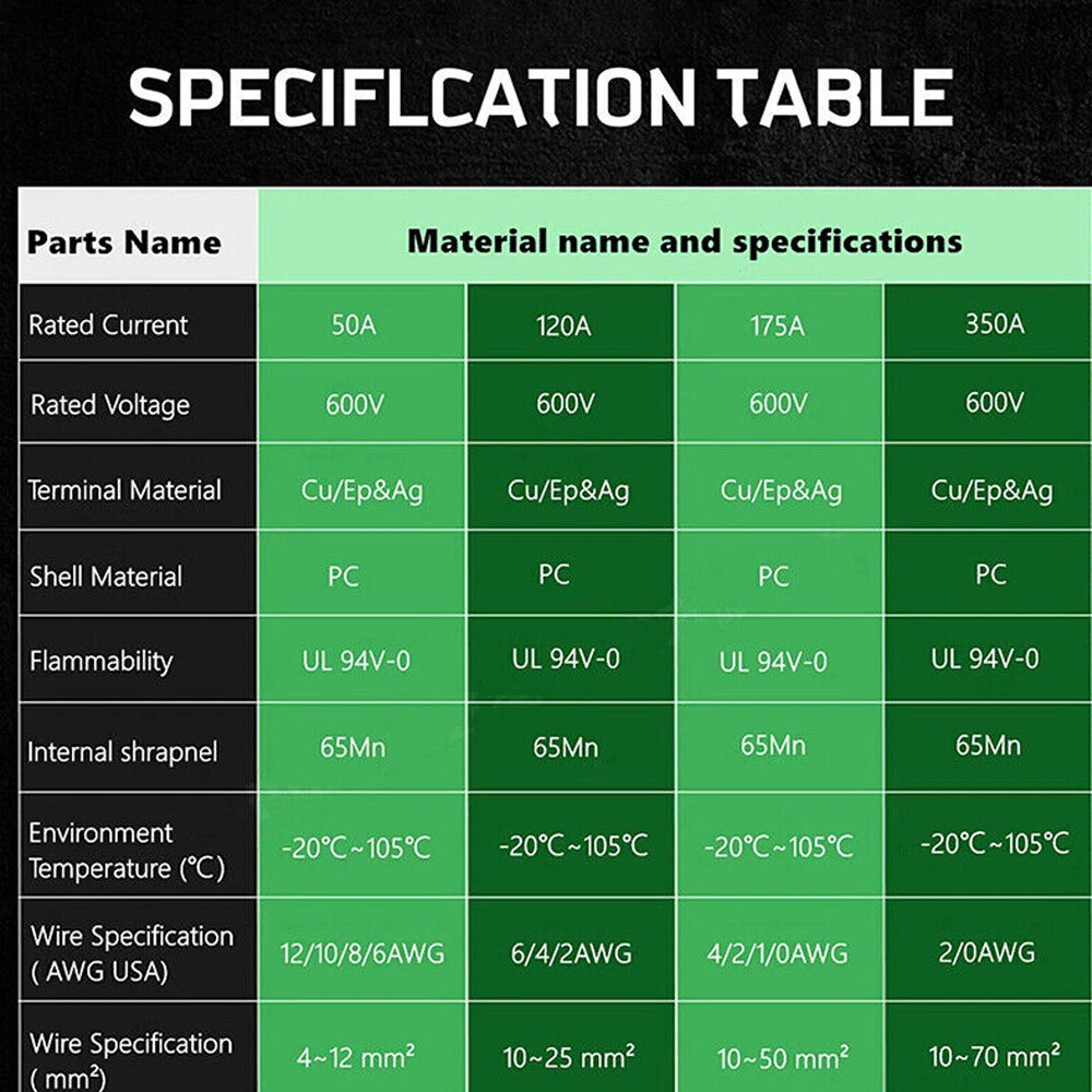 Features: -Brand New High Quality -Made of high-quality materials, durable -Easy to connect and disconnect, good conductivity -It will not generate heat during use. -The charging process is safe, simple, and fast. -Silver plated contacts - extend service life when used in high-power, high-temperature applications -Terminals can be crimped or soldered to the cable -Unique function: mechanical keying housing - preventing accidental component mating (each connector slot is inserted into another slot - no male or female version - can be inserted in the same color) -Housing - provides industrial strength, quality, and durability -Sex free design - makes assembly quick and convenient, reducing the need for high inventory Specifications: -175A size: about 79.8x55.7mmx25.5mm -Rated current: 175A -Rated voltage: 600V -Contact material: copper and silver -Fire rating: UL94-V0 -Operating temperature - 20 ° C to 105 ° C -Color: gray, red (optional) -Quantity: 2pcs -Interface type: straight plug -Insulation material: PPO -Contact type: red copper silver plated -Housing material: PC -Application field: lithium battery - Applicable wire diameter: 0, 1, 2, 4AWG package includes: 2 Sets( 1 Pair ):2PCS Connectors For Anderson plug + 4PCS Terminals Notes: 1. Due to various factors such as display brightness and light brightness, the actual color of the product may be slightly different from the website picture. 2. Please allow a slight deviation between the data and the manual measurement. On Aug 12, 2024 at 18:55:13 PDT, seller added the following information: