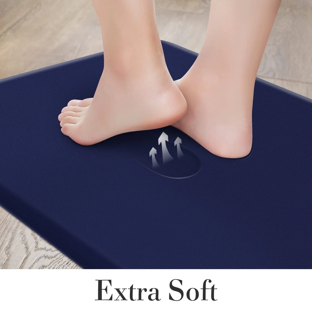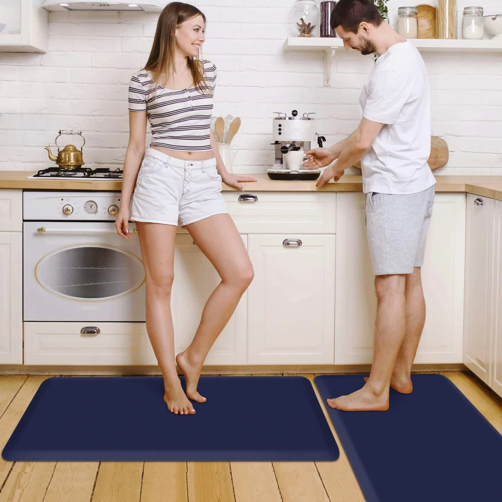 Comfort&Anti-Fatigue: The package includes 2 packs of kitchen carpets (17.3"x39"+17.3"x39"). The 0.47-inch anti-fatigue kitchen mat perfectly combines support and softness to provide you with thick cushioning support for long-term standing; kitchen rug helps to improve blood circulation and relieve back pain, knee pressure, and foot fatigue caused by standing. What a perfect gift for your family or friends! Premium Materials: kitchen mat is made of high-quality PVC material, phthalate-free, latex-free and odor-free. Premium materials determine the durability, comfort, elasticity, and softness of household floor mats. Even if it is used continuously, our high-quality mat can remain as it is. Anti-slip stability: The non-slip kitchen floor mat can be applied to a variety of surfaces such as wood, ceramic, laminate, marble, and concrete. The unique beveled edge design of our comfortable rug helps prevent trips and slips. [Note] Open rug fully place on even, flat, dry floor. Water under rug may result in slippage. Rug must be placed on dry surface during use. Easy to care: Made of water-resistant material, the kitchen mat is easy to clean-simple rinse with cold water or wipes with a damp cloth when water, stains, or oil splash on the kitchen mat, and then air dry for daily care. Multi-purpose: The anti-fatigue mat provides an extra large area to stand in front of the laundry room, kitchen, office, sink or any other high-traffic indoor or outdoor space. Also, the floor mat with neutral colors provides a fashionable accent to any area within the home.