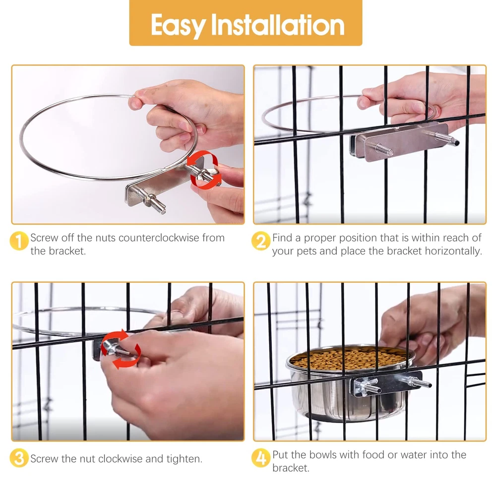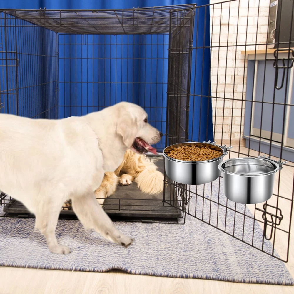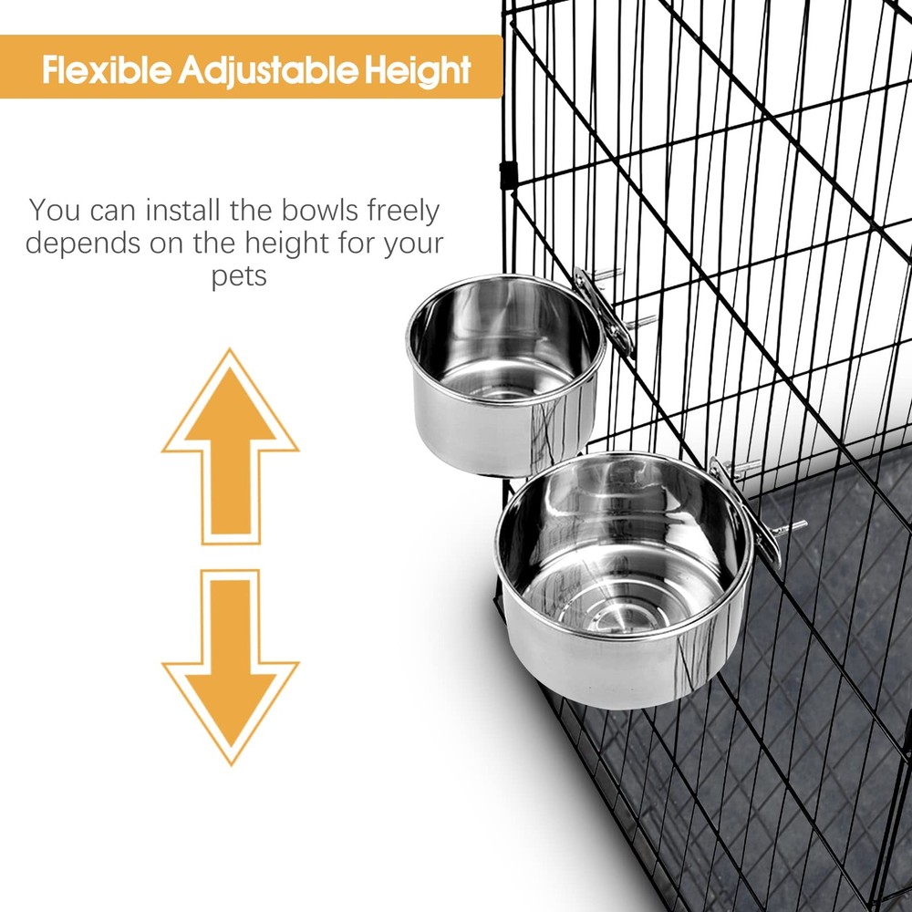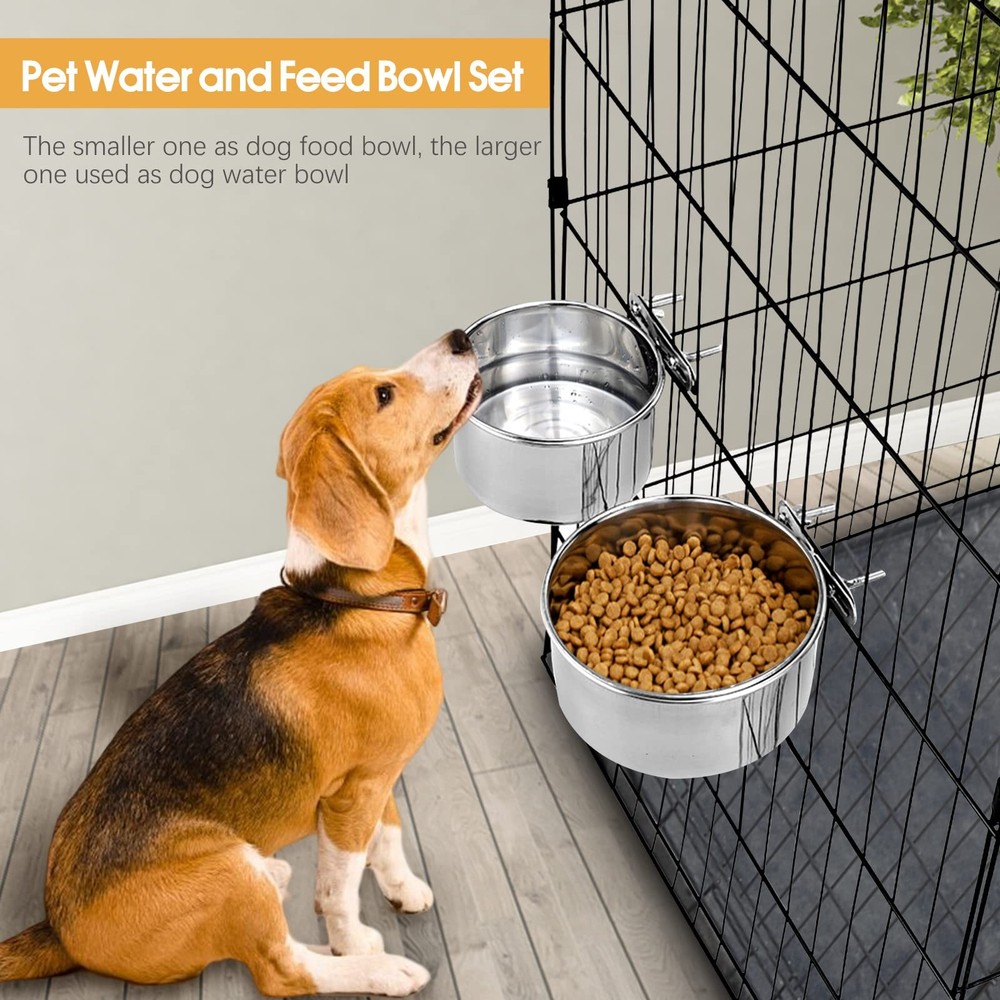 2 Pack Dog Food Water Bowls for Cage Stainless Steel Removable Pet Kennel Bowls with Clamp Holder Hanging Feeder for Large Dogs Huge Pets Features: 1. Premium Material Made of durable and sturdy stainless steel, dishwasher safe, no worry about your pets will chew it. 2. Large Enough The pet bowls are large enough to hold enough food and water for larger dogs. It will satisfy their hydration needs when you are out of the house. 3. Easy to Install The bowls are separate from the holders, you can easy to put on or take out the bowls for you to fill and wash them conveniently. You can attach the food feeder inside or outside of your pet's cage. 4. Comfortable for Eating Attach them to the proper height on the back of the crate allowing your pets to use them easily and without having to bend excessively. 5. Keep the Kennel Clean Fixed with a clamp holder, the wing nut attachments make the bowl super sturdy, your lovely pets can not dump the bowls, no spill of food or water and less wasted. 6. Perfect for Playful Pets Our pet bowls for the cage is a must-have for clumsy puppies and large dogs who love knocking over bowls on purpose, suits most kennels crates and cages Package Includes: 2x pet bowls 2x clamp holder 【Anti-spill】: The bowl and holder attach easily and securely to the cage, so your pets can freely get a drink or food without making a mess. You don't need to worry the bowl will tip over resulting in your pets being wet. ( Note: Suit for medium and large-breed pets. ) 【Durable & Easy to Clean】: Made of food-grade stainless steel, rust-resistant and safe to use, does not leave any smelly odors. Easy quick cleaning for stainless steel bowls, the bowls are removable for easy clean-up and support washing by dishwasher. 【Save Space & Keep Neat 】: By having the bowls raised off the kennel floor, there is more sleeping area and space for a litter pan. It won't wobble or spill, you don't have to clean up dumped water dishes every day. 【Easy to Install 】: The mounts are easy to maneuver and are very sturdy to keep the food and water where they should be. Our dog bowls can securely attach to pet crates, cages, or kennels. 【What You Will Get】: Including 2 size bowls. The smaller one you can use as food bowls. The larger one you can use it as a water bowl. Buy with confidence! If you have any problem with our products, please freely.