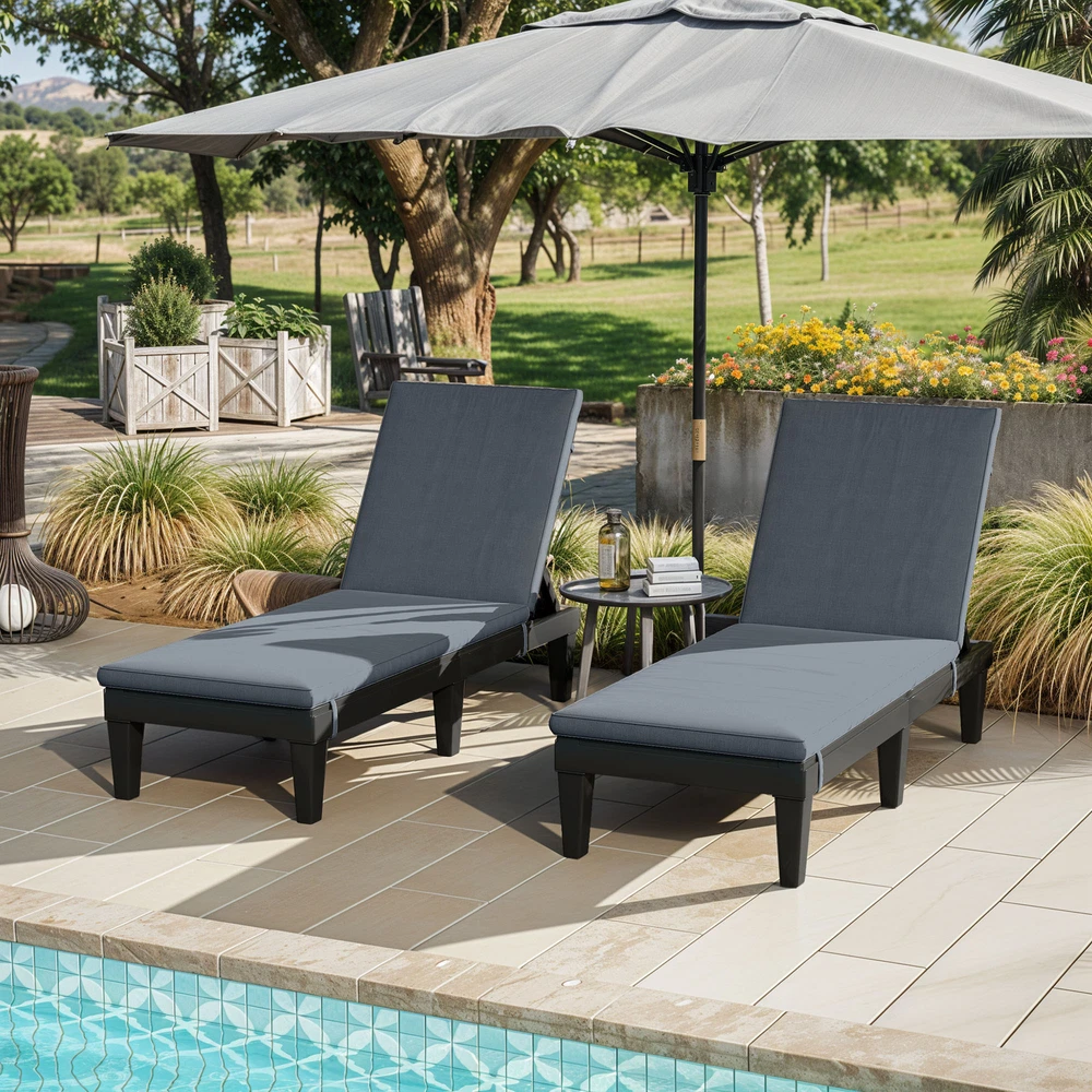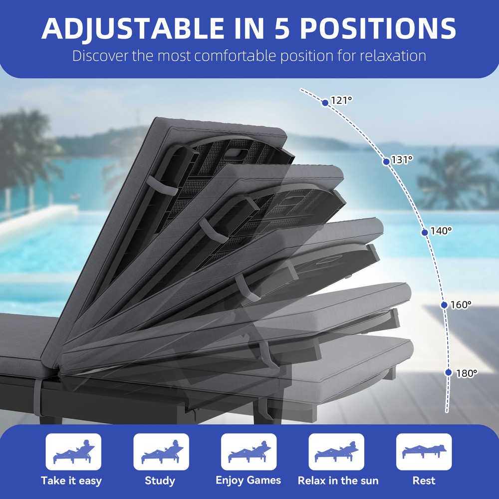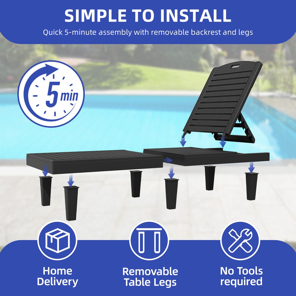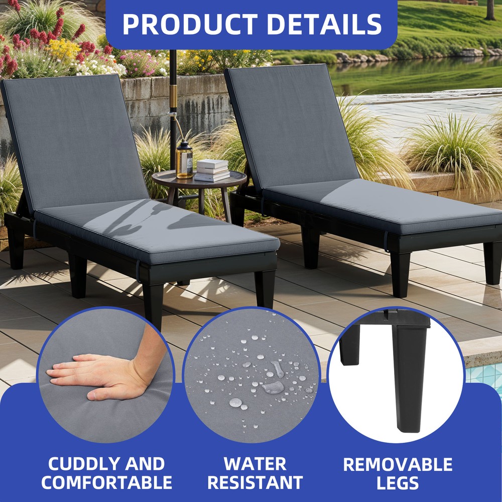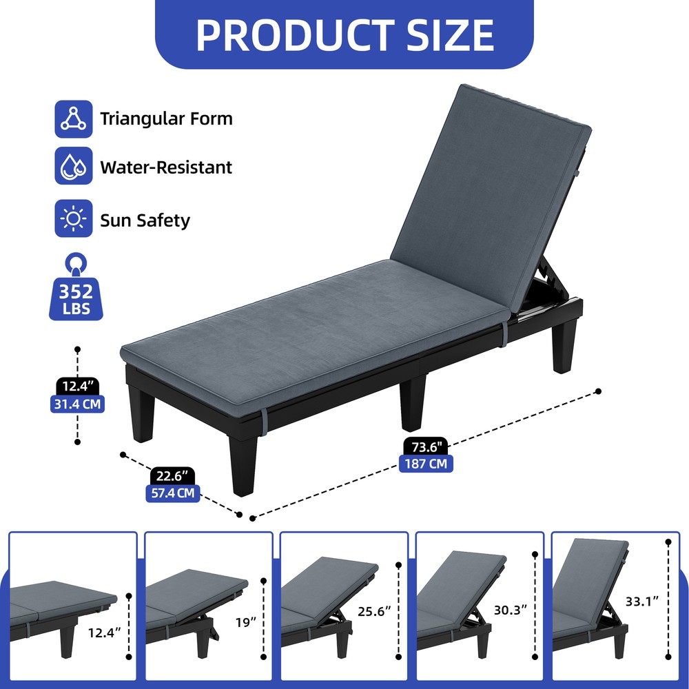 2 PCS Adjustable Patio Chaise Lounge Beach Chairs Stackable All Wheater proof Product Description NOTE: Professional Installation would be Highly Recommended. Description: 1. Material: Polypropylene Resin 2. Color: Black 3. Features: Durable Polypropylene Resin Construction with Rattan-Like Texture, 5-Position Adjustable Backrest for Customized Comfort, Weather-Resistant & UV-Proof for Long-Lasting Outdoor Use, Set of 2 with Comfortable Cushions for Poolside & Patio Relaxation, Sturdy 352 lbs Static Load Capacity with Reinforced Frame, Lightweight & Stackable Design for Easy Storage, Quick & Tool-Free Assembly in Just 5 Minutes, Fade-Resistant & Easy to Clean for Hassle-Free Maintenance 4. Great For: Patio Chairs, Beach Chairs, Poolside, Swimming Pool, Sunroom. Features: Sturdy & Weather-Resistant Polypropylene Resin : Crafted from high-quality polypropylene resin , this durable and fade-resistant chaise lounge set is built to withstand outdoor conditions year-round . The rattan-like texture adds a stylish touch, while the reinforced frame provides a 352 lbs weight capacity , ensuring stability and reliability for long-term use.. 5-Position Adjustable Backrest – Personalized Comfort : Enjoy versatile relaxation with a 5-level adjustable backrest , allowing you to find the perfect angle for sunbathing, reading, or napping. Whether you prefer a fully reclined position or an upright seating posture, this lounge chair adapts to your comfort needs effortlessly . Lightweight & Stackable for Space-Saving Storage : Designed for effortless portability , these chaise lounges are lightweight yet sturdy , making them easy to move around your outdoor space . Their stackable design allows for compact storage , making them a perfect choice for patios, balconies, and poolside areas . Waterproof Cushions – Extra Comfort & Easy Maintenance : This set includes premium outdoor cushions designed for optimal support and comfort . The weatherproof and water-resistant fabric ensures durability, while the removable cushion covers make cleaning a breeze. Dimensions: 1. Overall Size: 73.6"L x 22.6"W x 32.7"H 2. Maximum Weight: 352 lbs 3. Item Weights: 42 lbs Package Included: 1. 2pcs Chaise Lounge 2. Assembling Hardware Kits 3. Instruction Manual Book Shipping 1. Normally the item will be dipatched within 1 business day if payment is cleared before 12pm PST. 2. Please verify the correct shipping address in your PayPal account before making the payment. We only dispatch the item to the address that is sent to us at the time of checkout. 3. We don't ship to Hawaii, Alaska, Puerto Rico, APO/FPO/PO Boxes. 4. We don't provide local pick-up service. 5. Normally we will use USPS, UPS, FedEx & LTL to dispatch items. Payment 1. We accept PayPal and credit card. 2. We will ship to the confirmed Paypal shipping address that is provided with the payment only. Return 1. 30 days Money Back Guarantee. 2. Please contact our customer service to receive a RMA form first if want to return the item. 3. All returned items MUST in new condition with the original package. Contact If has any problem, please contact us by sending an ebay message. Our customer service will resolve the problem as soon as possible. On Aug 8, 2024 at 03:04:35 PDT, seller added the following information: On Mar 3, 2025 at 20:28:52 PST, seller added the following information: