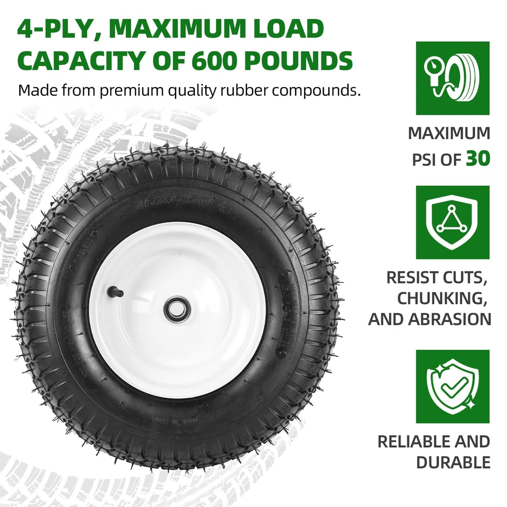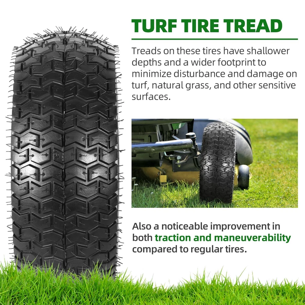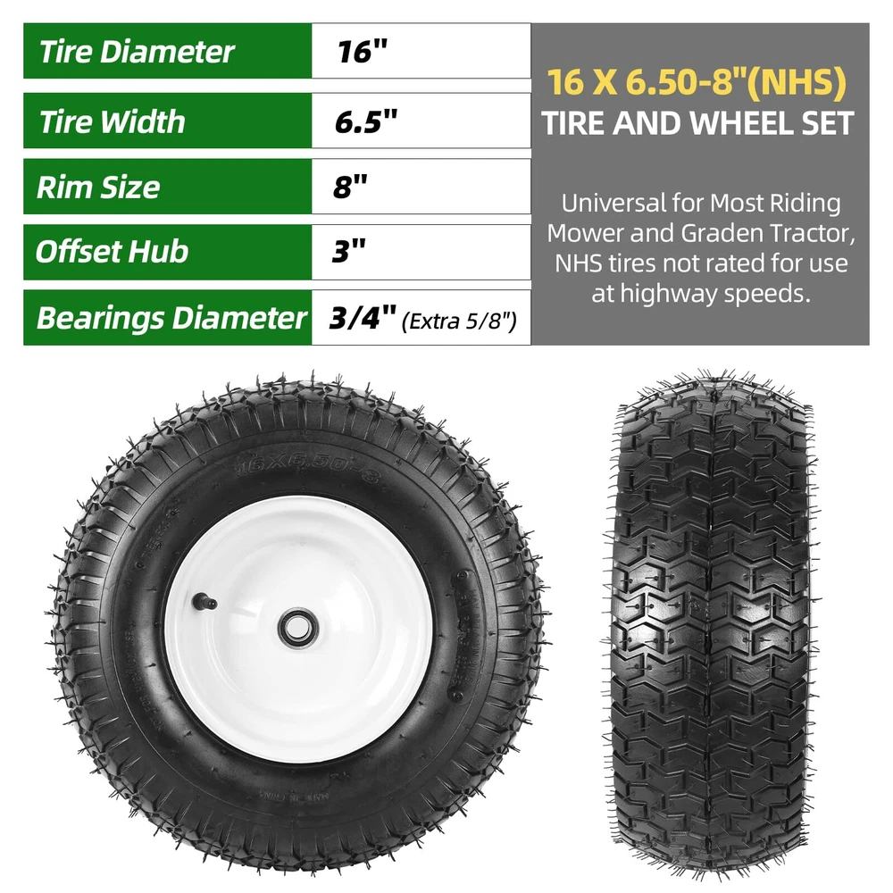 EXACT 16 X 6.50-8 TUBELESS TIRE AND WHEEL ASSEMBLIES - They're an exact for 16x6.5-8" tubeless mower tire and wheels, with John Deere Riding Mowers and most Mowers. 16 inches outer diameter, 6.6 inches section width, and 8 inches rim size. WITH MOST JOHN DEERE RIDING MOWERS: with select yard tractors, lawn mower tires, farm equipment, and other wheeled lawn and garden equipment. These are NHS tires not for use at highway speeds. Check the sidewall of your riding mower's existing front tires for information on the exact size of the tire and wheel. 3" OFFSET HUB AND 3/4" BEARINGS - This 2-pack tire and wheel assembly are also with other brands and models of riding mowers and lawn tractors. Aside from having the exact wheel size, you should also ensure that your existing riding mower's wheel assembly has a 3-inch offset hub and a 3/4-inch diameter Bearings. (Extra 5/8" Bearings x 4pcs; metal washers x 12pcs) 600 LBS MAXIMUM LOAD RATING - These tires were made for hauling and carrying relatively heavy loads. Not for highway service (NHS) tires like these are 4-PLY with a maximum PSI of 30. Made from premium quality rubber compounds that remain reliable and durable throughout all seasons. And with a maximum load capacity of 600 pounds for each tire and wheel assembly, you can do more for less. TURF TIRE TREAD FOR MINIMAL SURFACE DISTURBANCE - Mainly designed for turf, the treads on these tires have shallower depths and a wider footprint to minimize disturbance and damage on turf, natural grass, and other sensitive surfaces. These treads also offer stability on gravel and sand. There's also a noticeable improvement in both traction and maneuverability compared to regular tires.