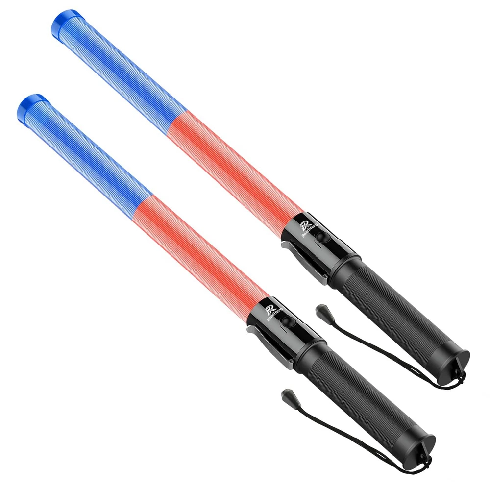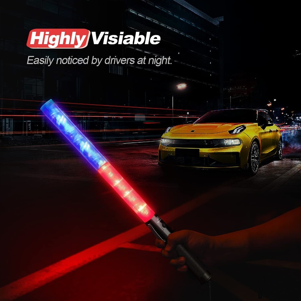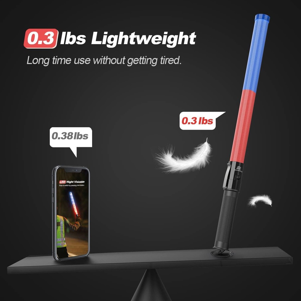 Highly Visible: The 21 inch traffic wand has 6 lights inside which are bright and easy for drivers to . It has a strong warning effect on rainy, foggy, and snowy days Lightweight and Sturdy: This traffic wand is made of ABS material, each weights only 0.3 pounds which can be held for a long time without burdening you. The non-slip handle also has a convenient wrist rope and iron clip that will not fall off easily 3 Flashing Modes: The traffic directing wand has 3 light modes, blue color steady-glow, red color steady-glow, and both the red and blue Blinking. Convenient for choosing the suitable modes according to the specific condition Widely Used: These safety wands are suitable for traffic control, parking attendants, directing traffic, air marshaling, fire rescue, church events Size and Quantity: You will receive 2 pieces of 21 inch traffic wand. Powered with 2 C-size batteries but the batteries are not included in the package