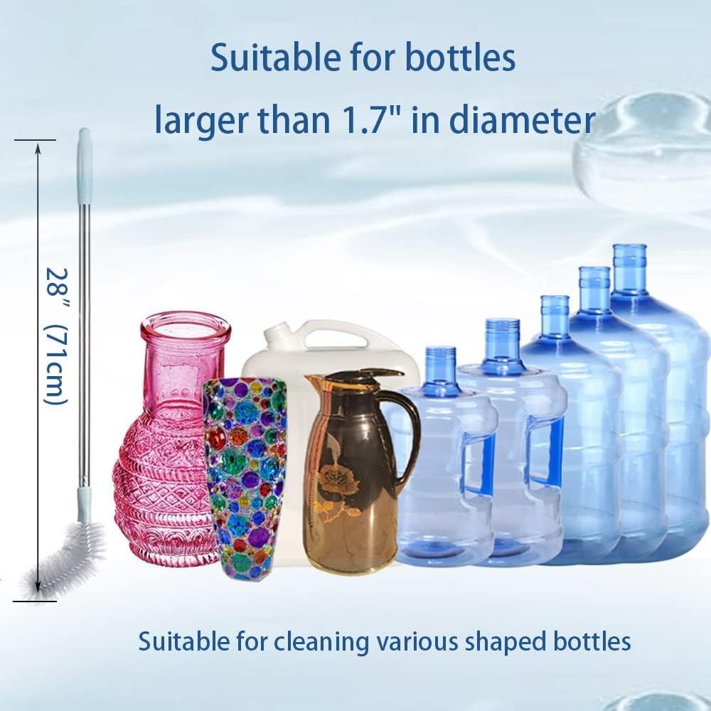 2 Pack 28" Long Bottle Brush, 3 & 5 Gallon Cleaner Nylon Gray Product Details Brand: kehail Color: Gray Handle Material: Stainless Steel Specific Uses For Product: cleaning vase Product Dimensions: 2"L x 4"W x 28"H Material: Polyvinyl Chloride (PVC) Special Feature: Long Handle, Extendable, Reusable Shape: Oval Included Components: Attachment Surface Recommendation: Tile, Grout, Metal, Plastic, Porcelain, Stone, Vinyl, Wood Number of Items: 2 Theme: cleaning Item Firmness Description: Soft Item Weight: 0.5 Pounds Manufacturer: kehail Unit Count: 2.0 Count Item Weight: 8 ounces Country of Origin: China Item model number: 2 PCS Bottle Cleaning Brush √PRODUCT FEATURES: Longer length, 28 inches in total length. Can easily and thoroughly clean 5-gallon water bottles, also can clean a variety of bottles with irregular heights. √CONDITIONS OF USE: The bottle opening diameter is greater than 4.5cm/1.77 inches, please check your bottle opening diameter carefully before purchase. √UPGRADED DESIGN: The brush head adopts a design that can be bent at will, so that dirt and sediment are completely removed and cleaned 360 degrees without leaving a trace of residual stain, which is a good helper for your cleaning. √PACKAGE QUANTITY: Contains 2 pieces of bucket brush, brush head screwing design, easy to assemble. √HIGH-QUALITY MATERIAL: Made of PP + stainless steel + PVC, non-slip handle, stainless steel metal material can extend your use time and let you save your wallet.