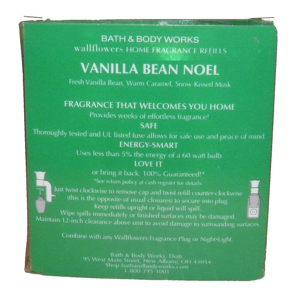 2 PACK BATH & BODY WORKS VANILLA BEAN NOEL WALLFLOWER BULB WALLFLOWER UNIT SOLD SEPARATELY Mailing Address - We will ONLY ship to the address on file with eBay. Before making a purchase, please ensure that your address is correct. We may otherwise cancel the sale. Handling Time - Our handling time is set to THREE BUSINESS DAYS. We ship packages Monday - Friday, except on holidays. This listing is NOT sponsored by, affiliated with, or representative of the mentioned brand(s), trade name(s), or trademark(s) and does not claim any ownership of such. All trademarks or brands mentioned in this listing are registered trademarks of their original owners who reserve all their rights and ownership. The use or mention of any trade name, product name, or trademark is necessary for identification and is for reference purposes only.