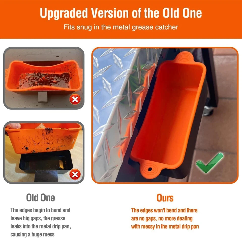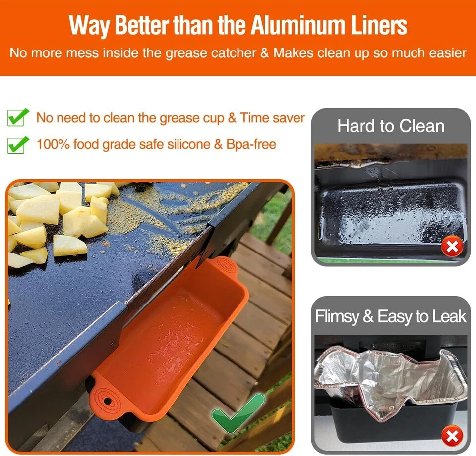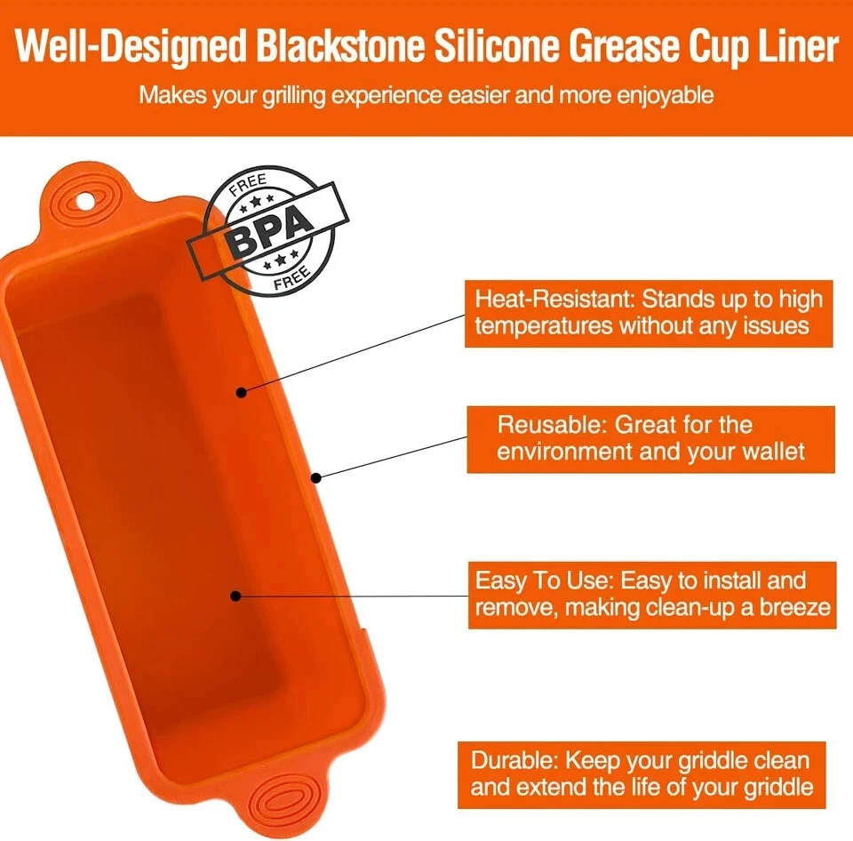 Must Have Blackstone Griddle Accessories: 2 Pack Silicone Grease Cup Liners for Blackstone Grill. No more scrubbing and scraping the grease and residue from the griddle, makes your cooking/grilling experience easier and more enjoyable. Silicone grease cups measure 7 x 3.3 x 2.8 inches and are designed to fit perfectly on 36/28/22/17 inch Blackstone grills Easy to Clean & Dishwasher Safe: These reusable drip pan liners make cleaning the grill a breeze. Cleaning the liners is incredibly easy too. You can either wash them with ordinary detrgent and water or just wipe with paper towel and throw them in the dishwasher, allowing to quickly remove any grease or residue without any hassle Better than the Aluminum Foil Pans/Liners: Still keep buying disposable aluminum foil pans? Aluminum foil pans are easy to leak, easy to blow away, and the griddle grease catcher will be an absolute mess. Silicone are soft so no worry about accidentally cutting the fingers on the foil pans. No more wasting money on a lot of disposal foil trays. Great value actually saves you money and pays for itself almost immediately Reusable, Durable & Heat-Resistant: The Grill Grease Cup Liners are made of heat-resistant silicone material that can withstand high temperatures and rough outdoor conditions. They are also reusable, which is great for the environment and your wallet. Unlike disposable foil trays, these silicone trays are non-t0xic, non-hazard0us, and can be used over and over again. The silicon pan is also much easier to remove than regular aluminum pans for disposal of grease and cleaning Keep Your Griddle Clean & Extend the Life of Your Griddle: The Grill Grease Cup Liners provide a convenient, efficient, and eco-friendly solution for keeping your grill clean. If you're looking for a reliable and affordable way to make your grilling experience easier, these silicone Blackstone grease cup liners are definitely worth considering