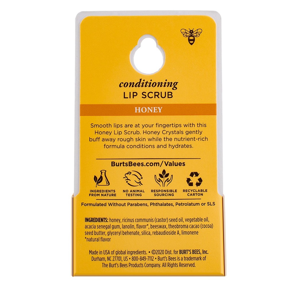 Product Description Burt’s Bees Conditioning Lip Scrub gently exfoliates and conditions dry lips with Honey Crystals to help your lips look and feel beautiful and primed for a smooth lip balm or lipstick application. - The honey crystals buff away rough, dry skin while Beeswax conditions and hydrates lips - Nourishes and smoothes dry lips with nutrient-rich, responsibly sourced Beeswax, exotic oils, and exfoliating honey crystals leaving them beautifully smooth and soft - 100% Natural - Honey: The perfect way to show your affection, Honey is an ode of everlasting devotion to your skin. Sweet and deliciously fragrant, it's the ideal natural moisturizer that helps soften and recondition. Letting you live happily ever after in your skin. - No Parabens, Phthalates, Petrolatum or SLS Ingredients honey, ricinus communis (castor) seed oil, vegetable oil, acacia senegal gum, lanolin, flavor (natural flavor), beeswax, theobroma cacao (cocoa) seed butter, glyceryl behenate, silica, rebaudioside A, limonene. Product Description Burt‚Äôs Bees Conditioning Lip Scrub gently exfoliates and conditions dry lips with Honey Crystals to help your lips look and feel beautiful and primed for a smooth lip balm or lipstick application. - The honey crystals buff away rough, dry skin while Beeswax conditions and hydrates lips - Nourishes and smoothes dry lips with nutrient-rich, responsibly sourced Beeswax, exotic oils, and exfoliating honey crystals leaving them beautifully smooth and soft - 100% Natural - Honey: The perfect way to show your affection, Honey is an ode of everlasting devotion to your skin. Sweet and deliciously fragrant, it's the ideal natural moisturizer that helps soften and recondition. Letting you live happily ever after in your skin. - No Parabens, Phthalates, Petrolatum or SLS Ingredients honey, ricinus communis (castor) seed oil, vegetable oil, acacia senegal gum, lanolin, flavor (natural flavor), beeswax, theobroma cacao (cocoa) seed butter, glyceryl behenate, silica, rebaudioside A, limonene. Suggested Use Apply a generous amount of Conditioning Lip Scrub onto your lips, scrub in a circular motion to exfoliate and gently buff away rough, dry lips and rinse it off for a natural healthy glow. Follow by applying Burt‚Äôs Bees Overnight Intensive Lip Treatment for ultimate moisture. Can be used 2-3 times a week. Disclaimer The product descriptions and instructions provided by vitabox.com are for informational purposes only and are qualified in their entirety by the information available from manufacturers of the products. You should carefully read all product packaging, and contact the manufacturer with any questions before using a product. While we endeavor to ensure that product descriptions are current, manufacturers sometimes change their products. We are not liable for inaccuracies or misstatements about products. We do not provide medical advice or recommendations. You should not use the information provided by vitabox.com for diagnosing or treating a health problem or disease. If you have or suspect that you have a medical problem, immediately contact your health care provider. Information and statements regarding dietary supplements have not been evaluated by the Food and Drug Administration or any other government agency and are not intended to diagnose, treat, cure, or prevent any disease.