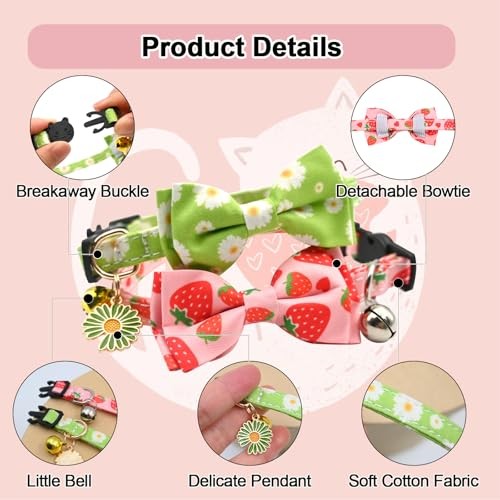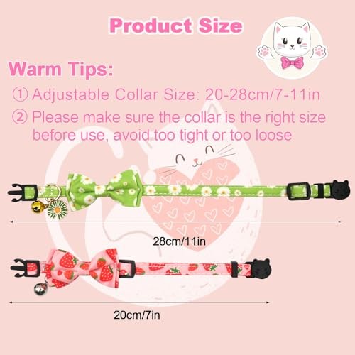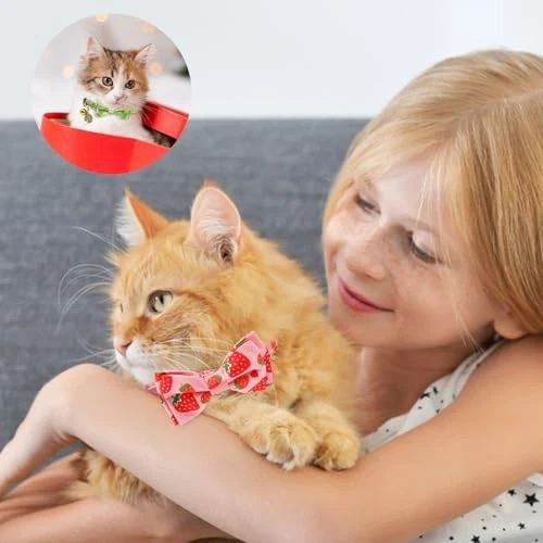 Return Policy Fast Delivery Trusted seller 2 Pack Cat Collars Breakaway with Cute Bow Tie, Cute Kitten Bowtie Collar, Fancy Cat Stuff Valentine Accessories for Male Female Boy Girl Indoor Cats Adjustable Product Description Safe & Comfortable Wearing: The cat collar is made of premium soft cotton, lightweight and burden-free, non-toxic and odorless, and the detachable carabiner allows for quick release in unexpected situations Exquisite Design: Package includes 2 cat breakaway collars, one with a green daisy pattern and one with a red strawberry pattern, comes with a removable bow and bell to make the cat look more cute and charming Adjustable Size: The kitten collar with bell has an flexible size range of 20-28 cm/7-11 in, the width of the strap is 1 cm/0.4 in, suitable for kittens, puppies and small pets (please measure your pet's neck circumference before purchg to make sure the collar is the right size) Ideal Gifts for Cats: Cat collar with bells and bows, bright colors and fine workmanship, perfect gift for your kitten or cat lover friends, for making your cat look more attractive Versatile Styles: The bow tie on the cat collar has an elastic loop that makes it easy to put on and take off, which makes the breakaway cat collars wearable in 2 ways to adapt to different occasions, versatile and stylish Shipping Returns Payment Shipping Shipping is FREE to all addresses other than APO/PO boxes in the lower 48 states. All our stock ships from US-based warehouses. Shipped via USPS or UPS (depending on location and package weight) Unless stated otherwise, all orders will ship within 24-72 hours of your payment being processed. Check our feedback to see the great reviews of FAST shipping we offer. Returns Seller does not accept returns Payment We currently accept payment via eBay managed payments only. Once payment is cleared, we will dispatch your shipment within 1-3 business days. Please refer to the "Shipping" tab for more information regarding shipping speed to your destination.