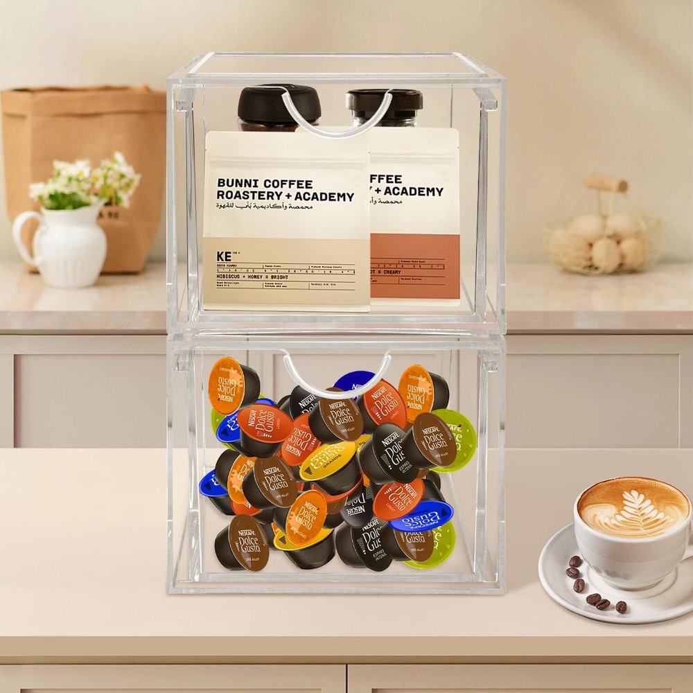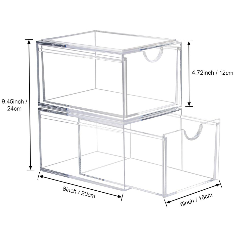 STACKABLE DESIGN - The stackable design allows for maximizing space by creating vertical storage. It can be used individually or stacked together to save space on a vanity or bathroom cabinet, keeping items contained and organized. VERSATILE & COMPACT - These clear storage drawers are suitable for use in any area of the home. They can serve as storage bins for the vanity, bathroom, kitchen, under sink, pantry, and washroom. They are perfect for organizing bathroom accessories, cosmetics, and skincare products. Additionally, they are also ideal for storing toys, puzzles, games, and books BUILT-IN HANDLE DESIGN - The makeup organizer drawers are designed with pull-out handles, providing convenience for storing and retrieving items. HIGH QUALITY MATERIAL - These clear storage containers are made from premium, BPA-free transparent plastic. The bathroom organizers and storage units are sturdy, shatterproof, scratch-resistant, and clear, allowing you to quickly find the items you need while keeping things tidy and dust-free. PACKAGE INCLUDES - Come with 2 drawer storage organizers, each organizer measuring 6" x 8" x 4.6". These large capacity multifunctional storage containers are suitable for a wide variety of items.