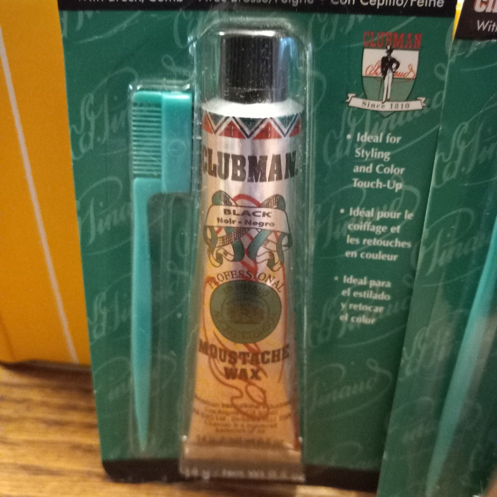 2 Pack Clubman Moustache Wax Black 0.5 oz Brand: Clubman Moustache Item: Mustache Wax Color: Black Size: 0.5 oz Each Pack Includes: 2 Packs --- (In Each Pack There Is 1 Mustache Wax & Comb) New In Package. Package Shows Some Wear