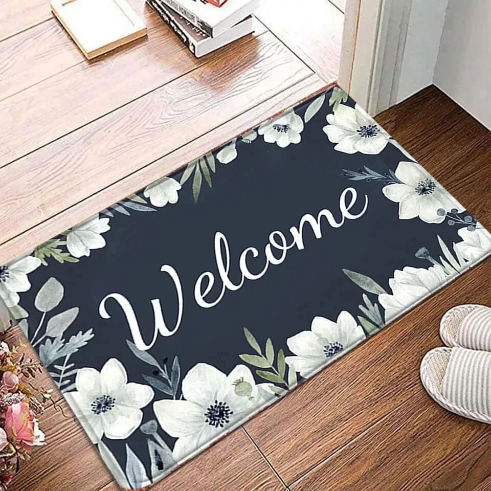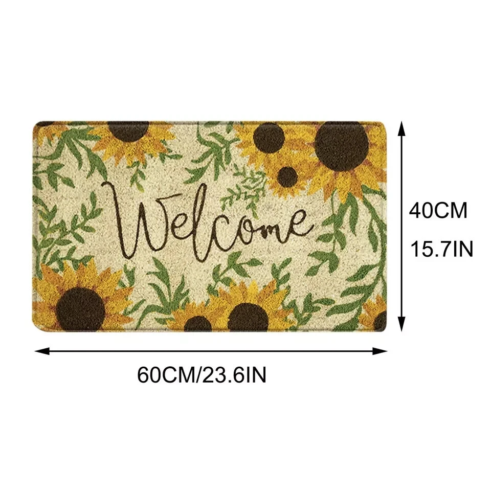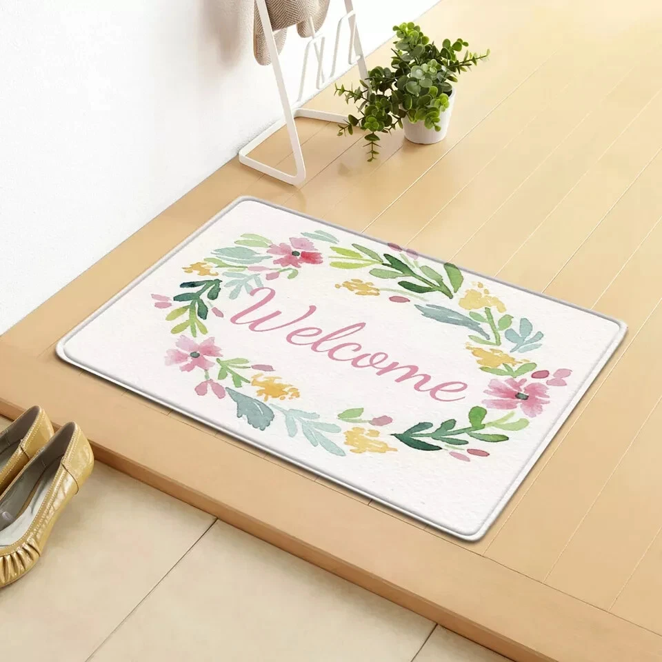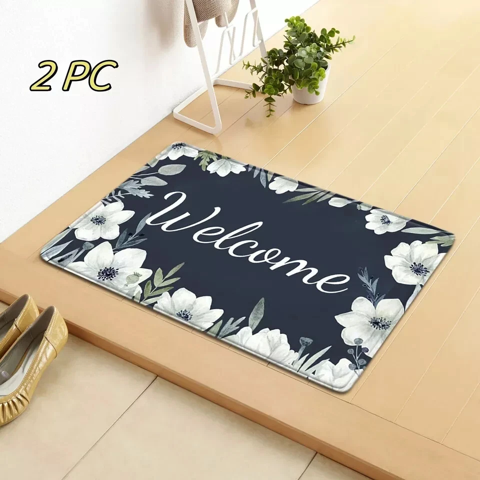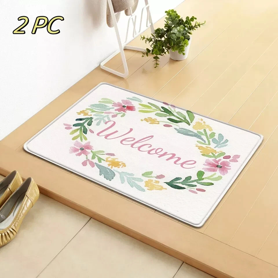 This product is a set of two rectangle-shaped door floor mats suitable for both indoor and outdoor use. They are multicolored and made of rubber material with a backing that is washable. The mats are designed for entryways and feature a durable construction for long-lasting use.