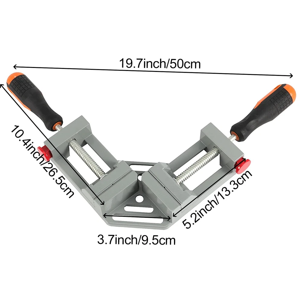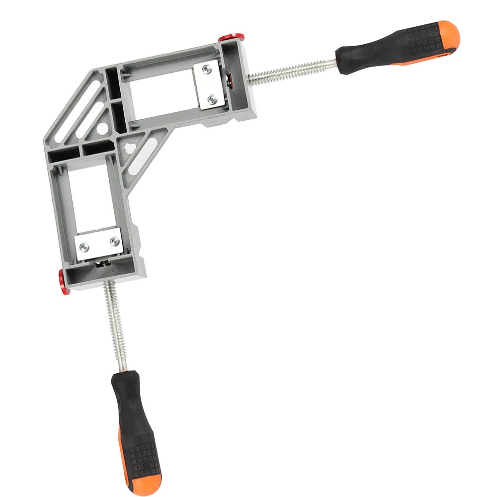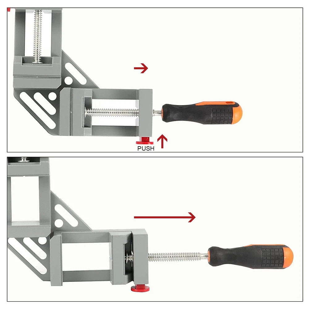 RIGID - The double handle right angle clamp forged with thick aluminum alloy material, lightweight but practical to last, thus the double handle right angle clamp is easy to carry and use. Steel solid threaded screw rod is durable and not easy to break or bend. QUICK RELEASE - 2 red quick-release buttons on both sides of corner clamp with quick release are metal-made, which is more durable than plastic . Press down the button for quick setup and adjustments or instant release of workpieces. EASY TO GRASP - With a maximum clamping range of 2.56 inches, our double handle corner clamp comes with anti-skid rubber handles and adjustable jaws for fast clamping wooden, glass, metal or plastic pieces together at 90 degrees. WIDELY USES - 2-pack 90 degree right angle clamps are suitable for drilling, welding, framing, or doweling to make cabinets, boxes, photo frames, canvas frames, aquarium, etc. A gift for woodworkers, gardeners, mechanics, handymen and DIY'ers. BUY WITH CONFIDENCE - After you receive the double handle right angle corner clamp. If you dislike or have any problems with them, please us in feel free. You can get a 30-day worry-free and we will reply to you the first time.