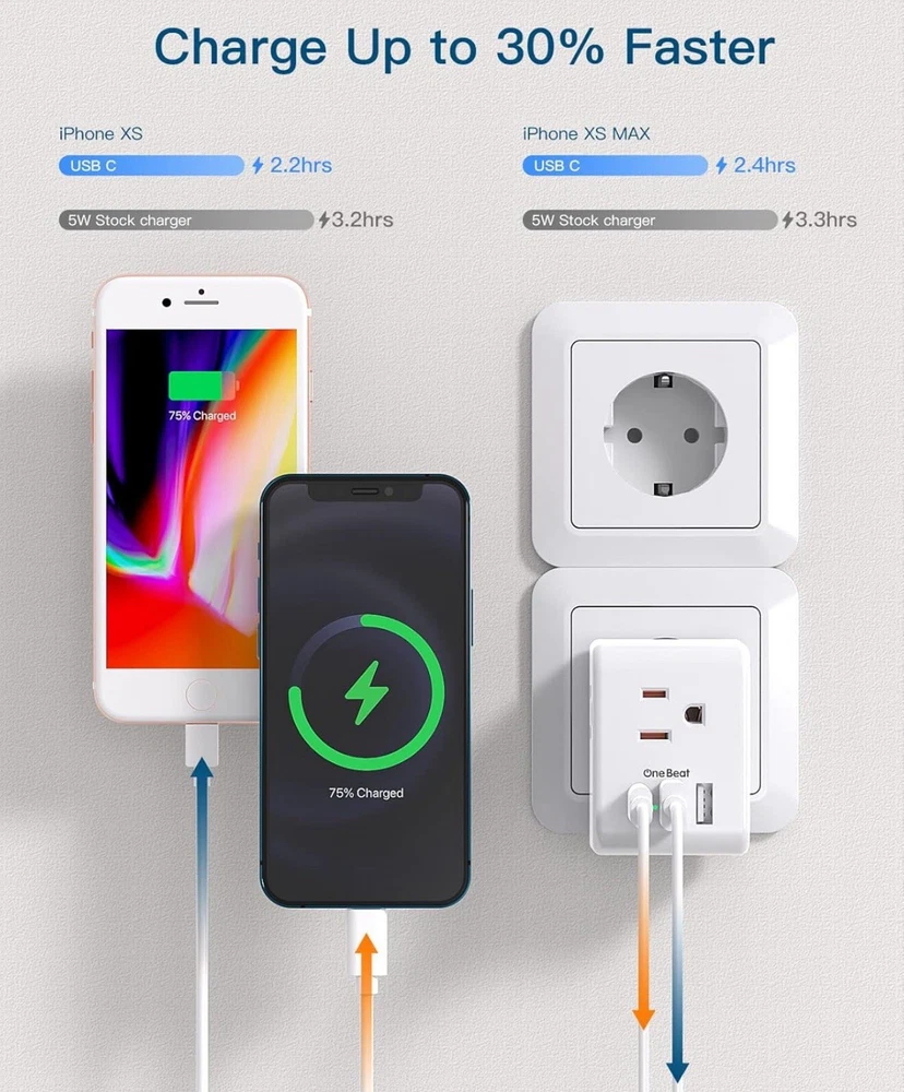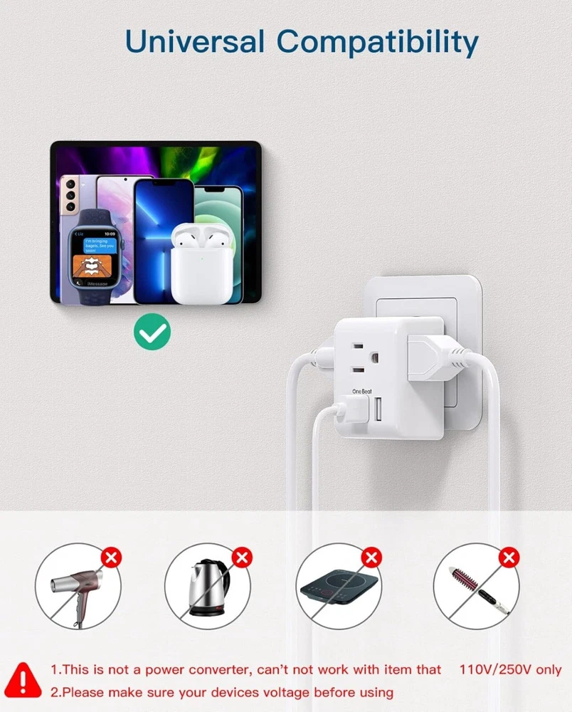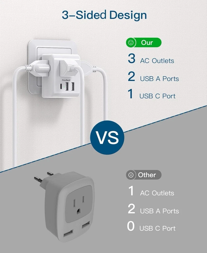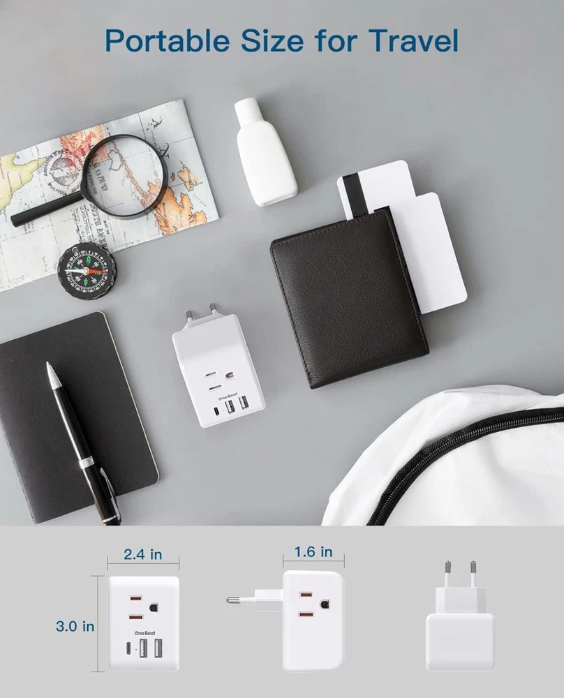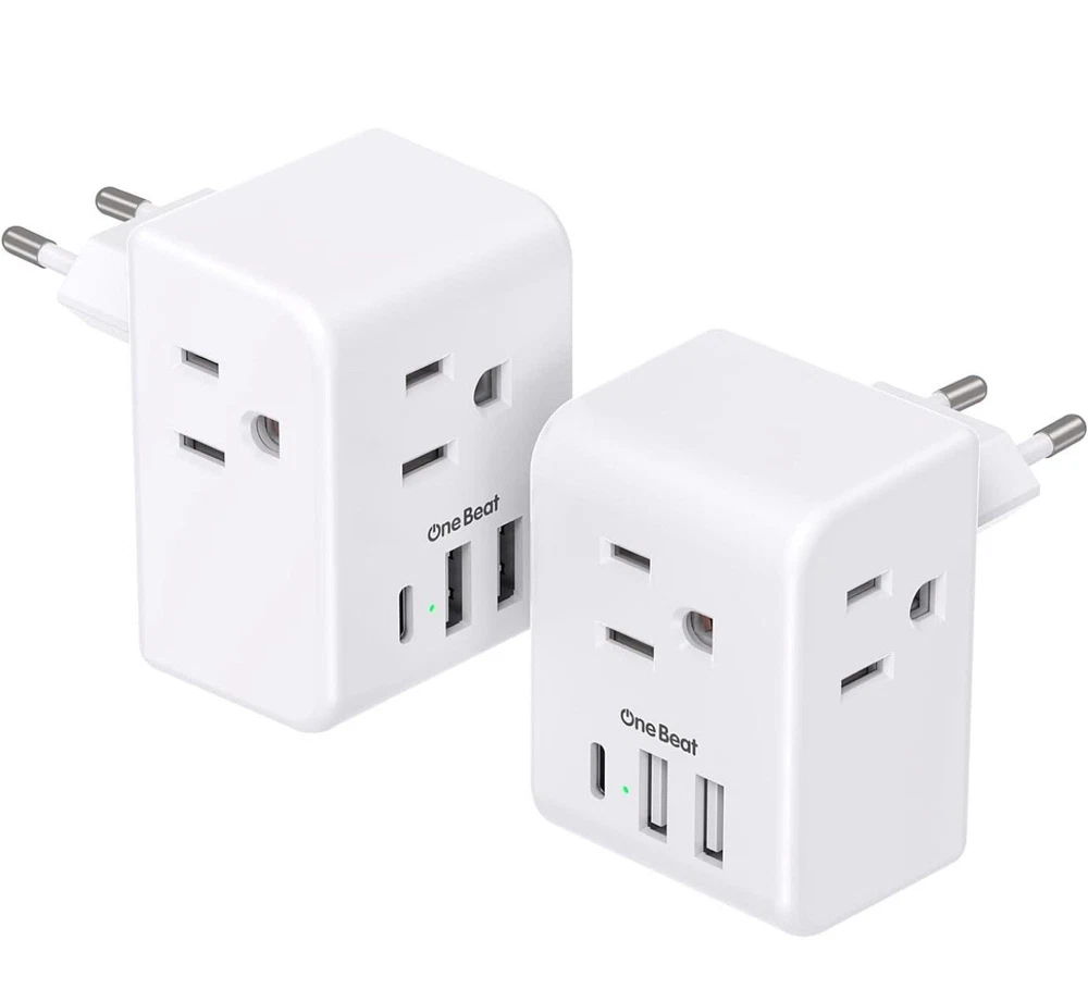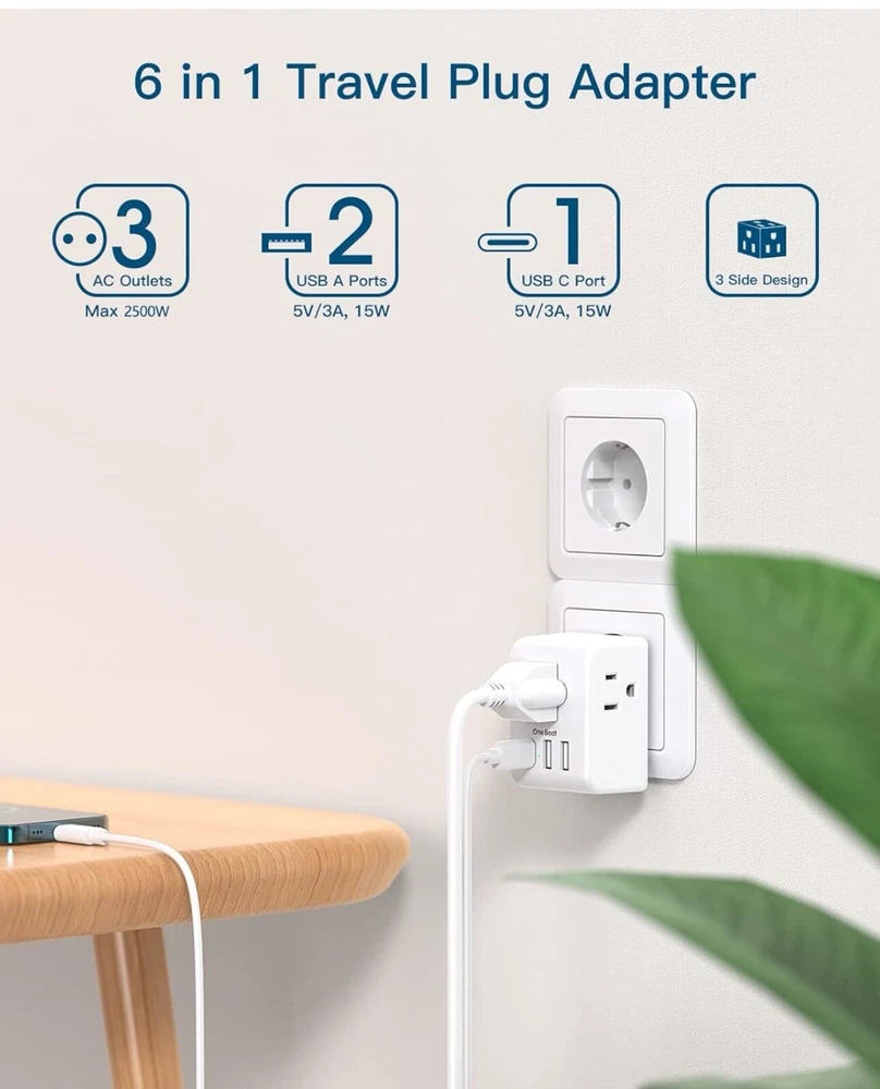 6 in 1 EU Power Adapter】- The European travel plug adapter turns 1 European Type C outlet into 3 standard American outlets, 2 USB-A and 1 USB-C charging port, Max Capacity Up to 2500 Watt (max 250 Volt, 10 A); 3 USB Ports can charge up to 3.1A, allowing you charge 6 devices simultaneously. ideal for cell phone, tablet, power bank and other electrical chargers; No need to carry extra adapter and power strip for your traveling, a small US to Europe plug adapter can save your suitcase space 【US to Europe Travel Plug Adapter】- Our italy travel plug adapter compatible with most European countries such as Austria, Belgium, Croatia, Denmark, Finland, France, Germany, Spain, Turkey, Iceland, Italy, Israel. More country list can be checked in description. ( NOTE: NOT WORK in UK/Ireland/Scotland) 【USB C Fast Charge 】- The plug extender total output of 3 USB ports is 5V/3.1A. Built in smart technology, the multi plug outlet can auto-detect charged devices and deliver optimum charging speed up to 5V/2.4A (max) each port, USB-C up to 3A.( Please note The UCB-C port is not Quick Charger 3.0, doesn't support any other devices which need 9~22V charging voltage.) 【European Travel Essentials】- This International power adapter is mini size: 3.0*2.4*1.6in, it's easy to carry and use. Indicator can let you know the power of this European travel plug adapter is on/off 【Note】- This is not a voltage converter; This power adapter US to Europe is only compatible for 100V to 250V wide voltage device, especially your hair dryer, straightener, electric toothbrush or razor need to support 100V to 250V dual voltage, otherwise you may need a power voltage converter