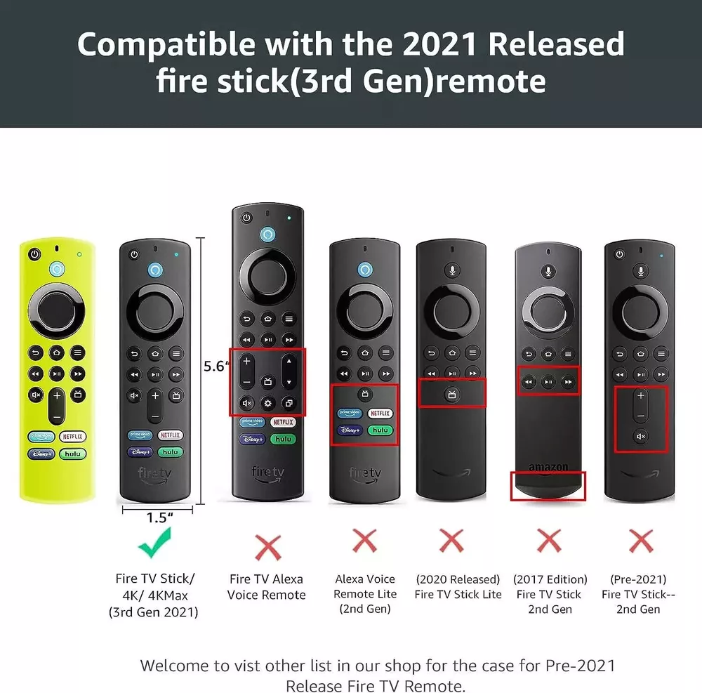 (2 Pack) Fire Stick Remote Cover 3Rd Gen with Alexa Voice 4K/4K Max, Glow(2 Pack 【Bright Colors,Standing Out!】Fire TV remote seems as if it is always getting lost in a blanket or between cushions or something, add color to the remotes which makes them easier to spot in dark rooms.Don't worry losing your fire stick remote anymore.---Only yellow can glow. 【Fit Perfectly】Only fit for Fire stick 3rd Gen 2021 Released, Fire stick 4K/4K Max.NOT compatible with Fire TV stick Lite,TV Basic Edition, Fire stick(1st Gen/2nd Gen)Pre-2018 released,Toshiba/Insignia TV remote. Warm Tips:Pls compare with your fire stick model fit or not before purchase. 【Say Goodbye to Pet or Baby Toys】 If you have pets or a cute baby, it is really easy for them to mistake the remote for one of their toys.The fire tv remote covers made of silicone material provide better protection for the remote control.Safe and non-toxic. 【No More Worried about Finding Batteries!】The texture keeps it from being slippery like it is without the cover,Light weight remote cover protects against accidental drops and adds grip to the firestick remote. 【Reliable After-sales Service】Your satisfaction is our priority. If you have any problem with this fire stick remote case, please tell us. ( Note: Only Silicone Fire Remote Cover, Not Include the Remote Control ---【Bright Colors,Standing Out!】Fire TV remote seems as if it is always getting lost in a blanket or between cushions or something, add color to the remotes which makes them easier to spot in dark rooms.Don't worry losing your fire stick remote anymore.---Only yellow can glow. ---【Fit Perfectly】Only fit for Fire stick 3rd Gen 2021 Released, Fire stick 4K/4K Max.NOT compatible with Fire TV stick Lite,TV Basic Edition, Fire stick(1st Gen/2nd Gen)Pre-2018 released,Toshiba/Insignia TV remote. Warm Tips:Pls compare with your fire stick model fit or not before purchase. ---【Say Goodbye to Pet or Baby Toys】 If you have pets or a cute baby, it is really easy for them to mistake the remote for one of their toys.The fire tv remote covers made of silicone material provide better protection for the remote control.Safe and non-toxic. ---【No More Worried about Finding Batteries!】The texture keeps it from being slippery like it is without the cover,Light weight remote cover protects against accidental drops and adds grip to the firestick remote. ---【Reliable After-sales Service】Your satisfaction is our priority. If you have any problem with this fire stick remote case, please tell us. ( Note: Only Silicone Fire Remote Cover, Not Include the Remote Control (2 Pack) Fire Stick Remote Cover 3Rd Gen with Alexa Voice 4K/4K Max, Glow(2 Pack 【Bright Colors,Standing Out!】Fire TV remote seems as if it is always getting lost in a blanket or between cushions or something, add color to the remotes which makes them easier to spot in dark rooms.Don't worry losing your fire stick remote anymore.---Only yellow can glow. 【Fit Perfectly】Only fit for Fire stick 3rd Gen 2021 Released, Fire stick 4K/4K Max.NOT compatible with Fire TV stick Lite,TV Basic Edition, Fire stick(1st Gen/2nd Gen)Pre-2018 released,Toshiba/Insignia TV remote. Warm Tips:Pls compare with your fire stick model fit or not before purchase. 【Say Goodbye to Pet or Baby Toys】 If you have pets or a cute baby, it is really easy for them to mistake the remote for one of their toys.The fire tv remote covers made of silicone material provide better protection for the remote control.Safe and non-toxic. 【No More Worried about Finding Batteries!】The texture keeps it from being slippery like it is without the cover,Light weight remote cover protects against accidental drops and adds grip to the firestick remote. 【Reliable After-sales Service】Your satisfaction is our priority. If you have any problem with this fire stick remote case, please tell us. ( Note: Only Silicone Fire Remote Cover, Not Include the Remote Control 【Bright Colors,Standing Out!】Fire TV remote seems as if it is always getting lost in a blanket or between cushions or something, add color to the remotes which makes them easier to spot in dark rooms.Don't worry losing your fire stick remote anymore.---Only yellow can glow. 【Fit Perfectly】Only fit for Fire stick 3rd Gen 2021 Released, Fire stick 4K/4K Max.NOT compatible with Fire TV stick Lite,TV Basic Edition, Fire stick(1st Gen/2nd Gen)Pre-2018 released,Toshiba/Insignia TV remote. Warm Tips:Pls compare with your fire stick model fit or not before purchase. 【Say Goodbye to Pet or Baby Toys】 If you have pets or a cute baby, it is really easy for them to mistake the remote for one of their toys.The fire tv remote covers made of silicone material provide better protection for the remote control.Safe and non-toxic. 【No More Worried about Finding Batteries!】The texture keeps it from being slippery like it is without the cover,Light weight remote cover protects against accidental drops and adds grip to the firestick remote. 【Reliable After-sales Service】Your satisfaction is our priority. If you have any problem with this fire stick remote case, please tell us. ( Note: Only Silicone Fire Remote Cover, Not Include the Remote Control