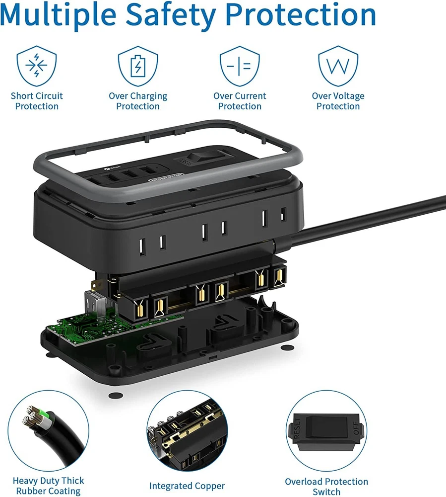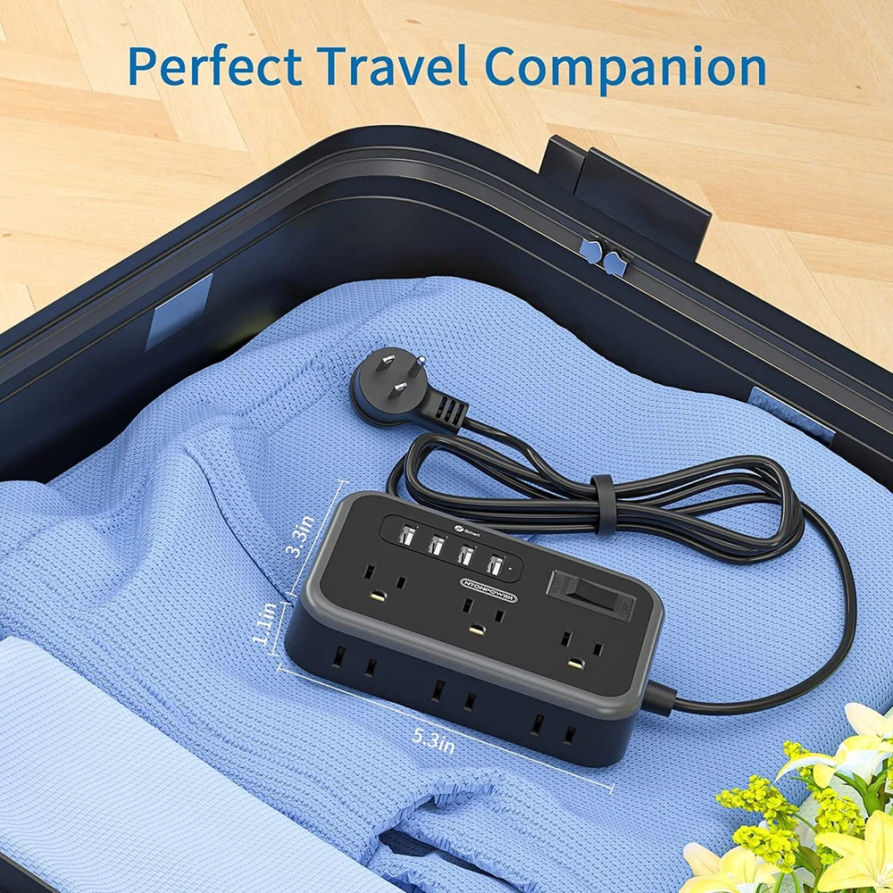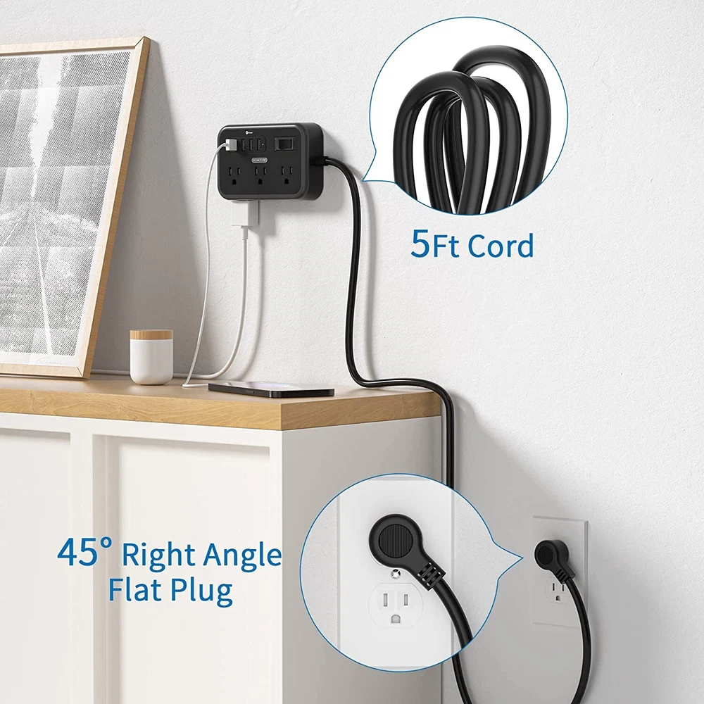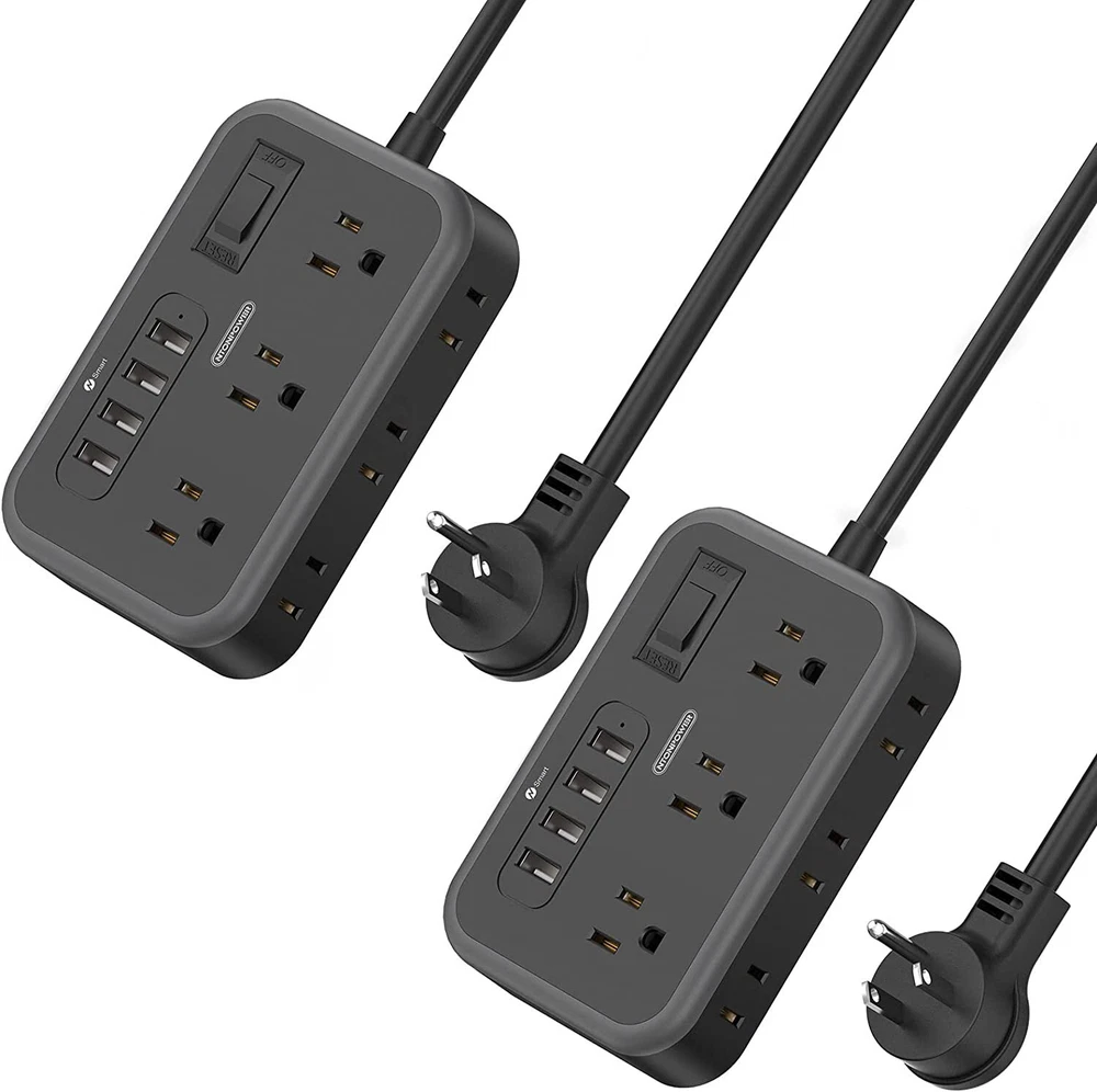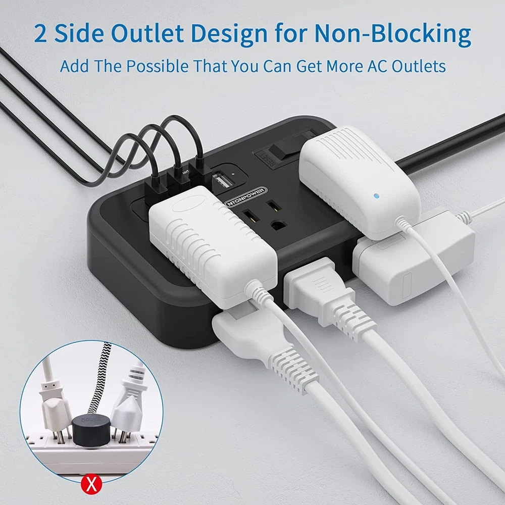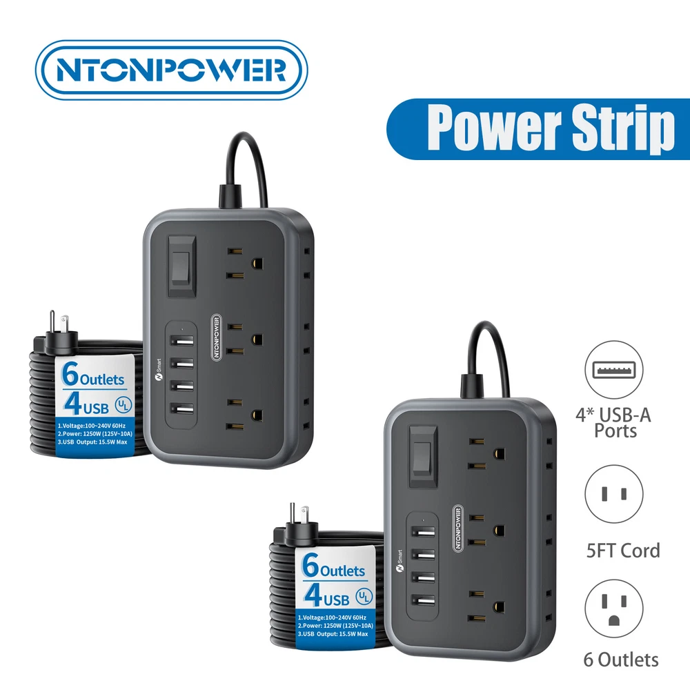 NTONPOWER Power Strip with 6 Outlets 4 USB Feature : 【 Unique 2 Side Outlets Design 】 The multiplug power outlet is designed with 2 sides, which adds the possibility that you can get more AC outlets. The 3-prong outlets can meet most devices with grounded plugs, like computers, TVs ,audio equipment, etc. The 2 prong outlets are suitable for most small appliances, such as laptop chargers, mobile phone adapters, desk lamps, fans, humidifiers, etc. 【 Widely Spaced Outlets 】 AC outlets are separated enough to fit big transform plugs without blocking each other(preferably < 1.6” wide). Power and protect 10 devices at once with the 3 Grounded Outlets, 3 *2 Prong Outlets, and 4 USB Ports. Transform your regular outlet into a safe, organized powering station. 【 Overload Safety Protection Switch 】 The multiple outlet extension cord has a circuit breaker and an OFF/RESET switch that automatically shuts off to protect your equipment and home once power overload is detected (rated power: 1250W). The switch on top is designed to be perfectly loose, to ensure it won't get stuck after a long time of use. 【 High Speed and Smart Charging 】 This power strip with 4 USB ports, which built-in smart charging technology, make this USB charger will detect your devices automatically and deliver the fastest charge speed up to 2.4A in one port at a time, and USB total power is 5V/3.1A, can charge almost any USB device (smartphone, tablet, Amazon Kindle, portable speaker, etc) 【 Hassle Free Purchase 】No worries at all if the ebay return window closed after1 a month. Directly contact us within the 18 months warranty for quality-related replacement or refund. NTONPOWER extension cord with USB ports also backed by $300, 000 connected device liability insurance. Package Includes: 2 Pack Power Strip with USB Ports Non-Blocking The unique 2 sided design with 6 AC outlets(3×3 Prong Gounted Outlets + 3×2 Prong Outlets) allows you plug more AC Devices. Wide spaced outlets(preferably < 1.6” wide) accommodate large power adapters without blocking others. Overload Protected Switch The multiple outlet extension cords has a circuit breaker and an OFF/RESET switch that automatically shut off to protect your equipment and home once power overload is detected (rated power: 1250W). The switch on top is designed to be perfectly loose, to ensure it won't get stuck after long time of use. Compact and Slim Design If you're looking for an all-in-one solution to multiple chargers and blocks that don't take up a lot of space in your bag, this is it. It's compact and lightweight, making it ideal for traveling. Take it and enjoy your wonderful journey. Never be out of energy! High-Speed Charging Smart IC technology enables each USB port to automatically detect and self-adjust the current to speed charge your power-hungry devices with a safe current. Now you can charge your cellphone, laptop, tablet, cameras WITHOUT a variety of converters, save your space and make your desktop organized. Right Angle Power Strip The flat plug can fit in tight spots behind furniture, such as sofa, bed, nightstand, couch, or TV stand. When using the socket, the furniture can be closer to the wall to save space. 45-Degree angled design doesn’t block the bottom receptacle of the duplex wall outlet. Wall Mount Power Strip Design with Hanging Keyslots, convenient to mount or hang on the wall, workbench, nightstand, dresser, or other surfaces horizontal or vertical, with higher stability and security. A true space saver. Included two screws and one mounting template for locating the mounting screws. Multi-Protections This USB charging station is made of ABS+PC fireproof material, UL94 V-0, the highest level fire-retardant material, it's very safe and value for money Complete protection for your devices from electrical short circuits, over heat, over charging, over current, and over voltage. Long Extension Cord The desktop multi-plug with 5ft extension cable, which can extend black power strip from socket to desk, home office table, nightstand, or anywhere you want. With cable ties for keeping the 5ft cord organized.