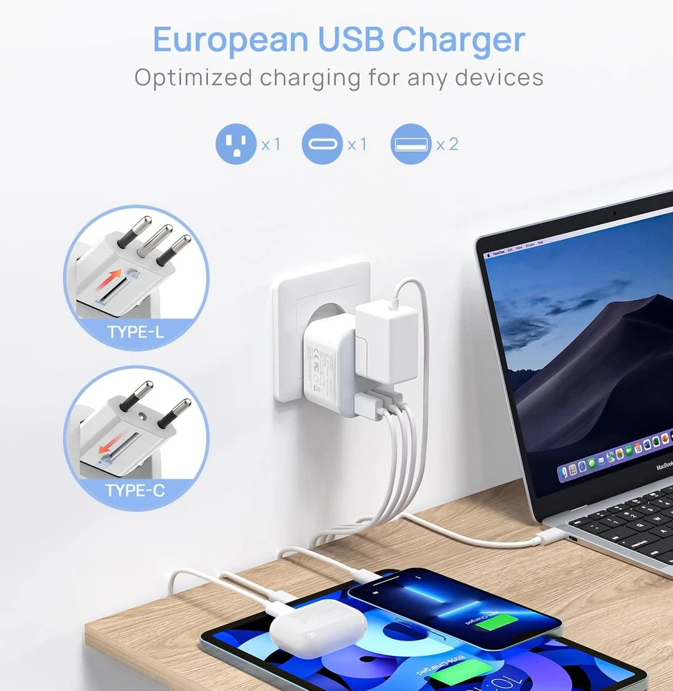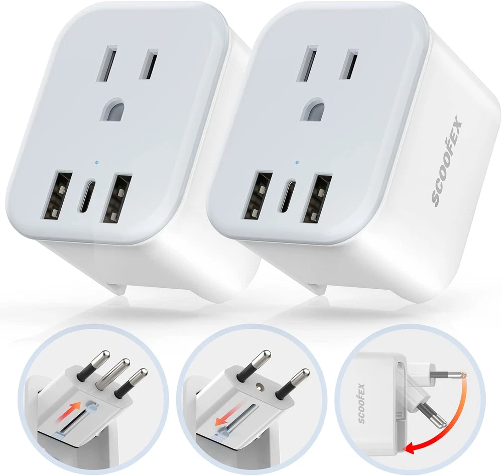Store New Arrivals Add to Favorite View Feedback Contact 2 Pack Foldable European Travel Plug Adapter with 3 USB (1 USB-C Port) and 1 AC Power Outlet Charger for US to Most of Europe France Germany Spain and Italy (Type C/L) Description Item dimensions L x W x H 1.65 x 2.04 x 2.44 inches Item Dimensions 1.65 x 2.04 x 2.44 inches Color White Plug Type Type C, Type L 2 in 1 Model Number SL-507 Output Voltage 5 Volts Input Voltage 250 Volts Retractable 2-in-1 Plug with Prongs:Type C switchable Type L Compatible in most Europe countries such as Austria, Belgium, Croatia, Denmark, Finland, France, Germany, Greece, Iceland, Poland, Portugal, Spain, Turkey, Italy, Chile, Maldives and more others countries. Tips:It does NOT work in UK/Ireland/South Africa/Scotland. Foldable Compact Storage Design:This mini-Italy travel plug adapter can be folded 90-degrees into the unit for better prong protection and easier portability so you can save space in your suitcase. It is suitable for any places such as hotels, offices, homes. It will be an excellent choice during your European and Italian business or travel trips. 4 in 1 US to Europe Plug Adapter: This international plug adaptor has 2 USB A (can charge up to 2.4A)and 1 USB C charging ports(can charge up to 3A), 1 AC Outlets max capacity up to 2500 watt (max 250 Volt, 10 A). It is ideal for phones, iPads, Laptops, power banks, cameras etc. It allows you to charge multiple devices simultaneously without blocking. Safe & Reliable Europe Travel Accessory:The SCOOFEX European travel plug adapter is certified by CE/EMC/ROHS/FCC. The built-in safety shutters protect the user from touching the live parts on the socket outlet. When our Italy power adapter is plugged into the wall socket,Indicator can let you know the Europe power adapter is on/off. Note for this Item: This is NOT a voltage converter. This type C/L adapter only supports 100V to 250V wide voltage devices, especially your hair dryer, curling iron or shaver, you need to make sure these devices support 100V to 250V dual voltage, otherwise you may need a voltage converter. Hassle-free after-sales service, if there is any problem with the adapter, please and we will fix the problem for free within 24 hours or send you a new by default (1 year limited). Product Description SCOOFEX European Travel Plug Adapter Open the folded EU pin (Type C) Compatible Countries : Algeria / Armenia / Austria / Azerbaijan / Azores / Balearic Islands / Belarus / Belgium / Bosnia & Herzegovina / Bulgaria / Cape Verde Islands / Chad / China / Croatia / Czech Republic / Denmark / Egypt / Estonia / Finland / France / Georgia / Germany / Greece / Hungary / Iceland / Iran / Iraq / Italy / Jordan / Kazakhstan / Kuwait / Kyrgyzstan / Latvia / Lebanon / Lithuania / Luxembourg / Macedonia / Madeira / Moldova / Monaco / Montenegro / Mozambique / Netherlands / Norway / Poland / Portugal / Republic of Guinea / Romania / Russia / Serbia / Slovakia / Slovenia / Spain / Sweden / Switzerland / Tajikistan / Turkmenistan / Ukraine / Uzbekistan Push the button up gently and transfer to the Italian pin (Type L) Compatible Countries: Italy / Chile / Cuba / Eritrea / Ethiopia / Lybia / Maldives / San Marino / Syria / Uruguay / Vatican City Tips: This electric adapter does NOT work in the UK / Ireland/ South Africa/ Scotland. Product Specification Input voltage: 100V-250V,MAX 50/60Hz Max load: 10A Power rating: 2500W (Max 250V, 10A) USB A ports output: 5V/2.4A USB C ports output: 5V/3A USB total output: 5V/3.1A (Total) 4 in 1 Foldable Travel Plug Adapter It can be folded into the unit at 90-degrees to better protect the pins from being bent, and is more compact and convenient, Suitable for any places such as hotels, bedrooms, dormitories, ships, etc. Certified by CE and FCC to ensure high quality. Ultra-lightweight and compact plug Dimension: 2.44 x 2.04 x 1.65-inch Weight:3.14oz This adapter is very small and compact so that you can take it anywhere and the plug will not scratch the digital devices and screen after folding in the bag. It is a great choice for your travel and business trip. NOT a Voltage Converter Note: This Europe plug adapter is not a voltage converter. It only supports 100V to 250V wide voltage devices, especially your hair dryer, curling iron, shaver or electric toothbrush, you need to make sure they support 100V to 250V dual voltage. If your device is only 110V or 125V, what you probably need is a voltage converter. The Best Travel Accessory Gifts for Travel Enthusiasts Best charging solution for your wonderful trip This adapter with 3 USB (1 USB C Port) and 1 AC Outlets can charge four devices at the same time, suitable for electronic products such as mobile phones, tablets, laptops, power banks, etc. when traveling, there is no need to carry additional chargers. ABOUT US We offer the best prices around on high quality products. Our E-store includes media such as books, movies, music and games while offering electronics, toys, sporting apparel, clothing, tools, general home, garden items and more. SHIPPING We are always working hard to ensure your package arrives as soon as possible. Please understand that some factors like weather, high postal traffic, and the performance of shipping companies are outside of our control. We offer free shipping to the lower 48 states and ship within 2 business days of payment, usually sooner. We do not accept P.O. Boxes. Please provide a physical address. For shipping outside of the continental USA, we only use eBay's Global Shipping Program.The item is shipped to KY and then sent to the rest of the world. International customers are responsible for all duties and taxes. Continue to check out in order to calculate costs for shipping the item to your country. Messages regarding eBay's Global Shipping Program MUST be directed at eBay EXCLUSIVELY. RETURNS We offer a 30-Day Return Policy on items which you are not completely satisfied with. You have the option for a full-refund or an exchange
