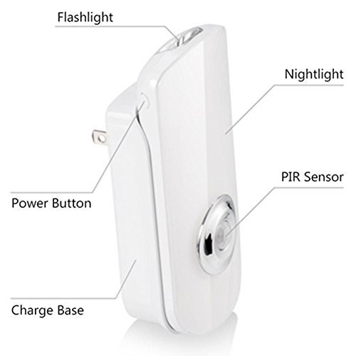 ▶Ideal power failure safety light: Automatically turns on when the power goes off (When Charging) ▶Motion Sensored: Integrated PIR sensor activates bright LED when motion is detected within 7-10 ft, providing convenient and responsive hands-free lighting. ▶Energy Saving: Once activated by motion, the light will power off after 25 second of inactivity for energy saving efficiency. ▶Detachable & Portable Lighting: A full charge time provides up to 1.5 hours of extended use for flashlight operation. Simply detach from the wall when handy lighting is in need. ▶This Night light is ideal for use in closets, bedrooms, bathrooms, hallways and so on.