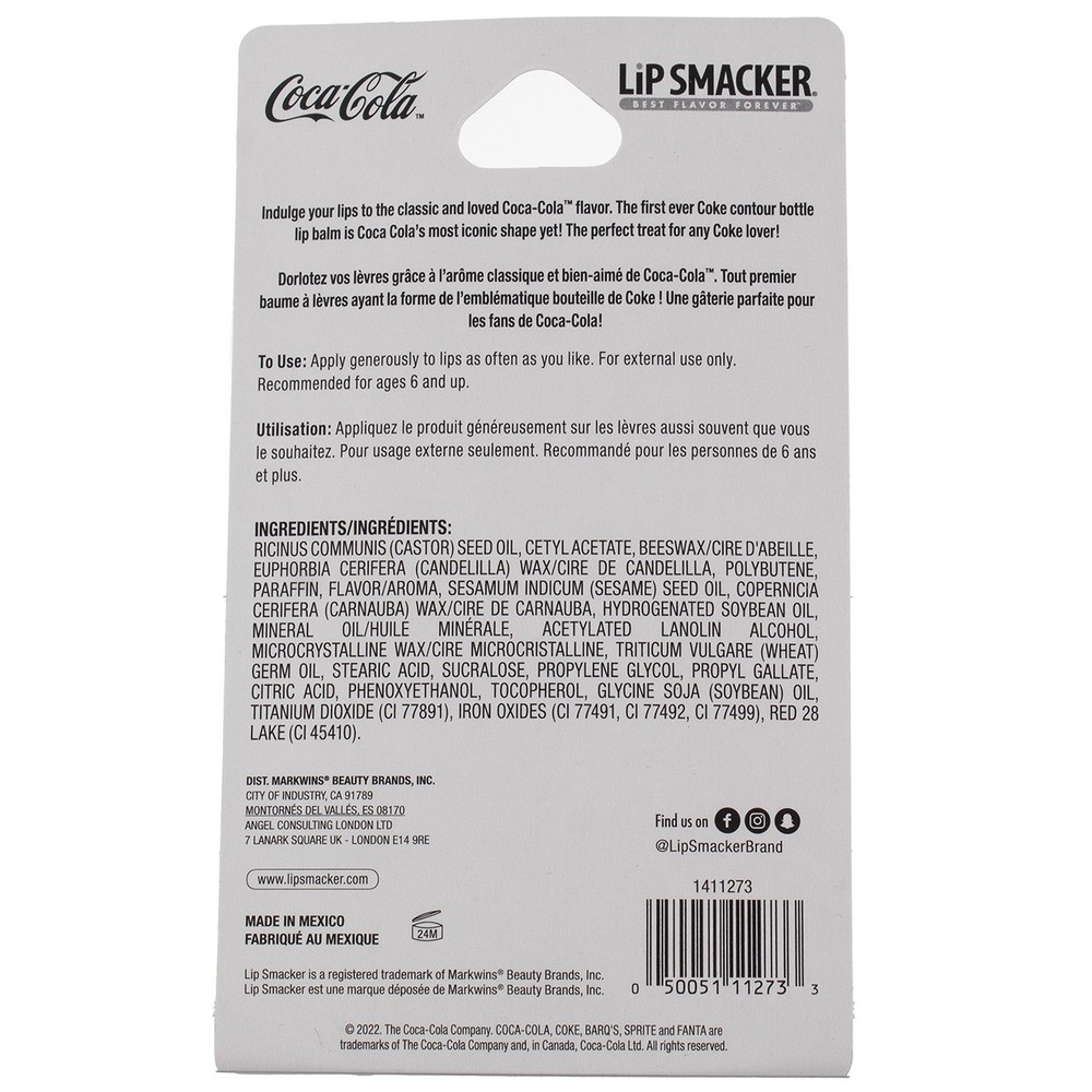 Product Description Give your lips the hydration they need along with the classic Coca-Cola flavor they crave. Designed to look like the iconic glass Coke bottle, this delightfully vintage lip balm leaves your lips looking, feeling, and tasting great! Whether it’s little piece of Americana for yourself or a fun gift idea for a friend, go ahead and share a Coke with Lip Smacker! Welcome to the World of Lip Smacker: Explore flavor, color, and design and find the Lip Smacker that makes YOU smile. Since 1973, we have put smiles on lips around the globe. We hope our authentic flavors, scents, and colorfully designed products make you happy. We invite you to discover Our World, explore our brand, and find your favorites. The flavor combinations are endless — mix and match to find your own lip softening, smile inducing, deliriously delicious happy moment. Then repeat, repeat, repeat! Lip Smackers Coca Cola Contour Bottle Lip Balm - 0.14oz - Lip Smackin' Good: Enjoy the classic refreshing taste of Coca Cola soda. Featuring the iconic glass Coke bottle design and flavor, this lip balm is a refreshing taste of Americana that leaves lips moisturized - No More Chapped Lips: Every Lip Smacker lip balm is made with the moisturizing nutrients that lips love. They go on like butter and the delicious smells and flavors leave you wanting more. - Clear and Glossy: Not only do these lip balms leave your lips soft and sweet, but they also create a pretty gloss finish for a spectacular smile - Fun and Giftable: Whether it's a birthday, holiday, or other occasion, Lip Smackers make great stocking stuffers, thank you gifts, or goodie items - Cruelty-Free: Lip Smacker never tests on animals and is 100% cruelty-free Ingredients Ricinus Communis (Castor) Seed Oil, Cetyl Acetate, Beeswax/Cire D'abeille, Euphorbia Cerifera (Candelilla) Wax/Cire De Candelilla, Polybutene, Paraffin, Flavor/Aroma, Sesamum Indicum (Sesame) Seed Oil, Copernicia Cerifera (Carnauba) Wax/Cire De Carnauba, Hydrogenated Soybean Oil, Mineral Oil/Huile Minerale, Acetylated Lanolin Alcohol, Microcrystalline Wax/Cire Microcristalline, Triticum Vulgare (Wheat) Germ Oil, Stearic Acid, Sucralose, Propylene Glycol, Propyl Gallate, Citric Acid, Phenoxyethanol, Tocopherol, Glycine Soja (Soybean) Oil, Titanium Dioxide (Ci 77891), Iron Oxides (Ci 77491, Ci 77492, Ci 77499), Red 28 Lake (Ci 45410) Product Description Give your lips the hydration they need along with the classic Coca-Cola flavor they crave. Designed to look like the iconic glass Coke bottle, this delightfully vintage lip balm leaves your lips looking, feeling, and tasting great! Whether it‚Äôs little piece of Americana for yourself or a fun gift idea for a friend, go ahead and share a Coke with Lip Smacker! Welcome to the World of Lip Smacker: Explore flavor, color, and design and find the Lip Smacker that makes YOU smile. Since 1973, we have put smiles on lips around the globe. We hope our authentic flavors, scents, and colorfully designed products make you happy. We invite you to discover Our World, explore our brand, and find your favorites. The flavor combinations are endless ‚Äî mix and match to find your own lip softening, smile inducing, deliriously delicious happy moment. Then repeat, repeat, repeat! Lip Smackers Coca Cola Contour Bottle Lip Balm - 0.14oz - Lip Smackin' Good: Enjoy the classic refreshing taste of Coca Cola soda. Featuring the iconic glass Coke bottle design and flavor, this lip balm is a refreshing taste of Americana that leaves lips moisturized - No More Chapped Lips: Every Lip Smacker lip balm is made with the moisturizing nutrients that lips love. They go on like butter and the delicious smells and flavors leave you wanting more. - Clear and Glossy: Not only do these lip balms leave your lips soft and sweet, but they also create a pretty gloss finish for a spectacular smile - Fun and Giftable: Whether it's a birthday, holiday, or other occasion, Lip Smackers make great stocking stuffers, thank you gifts, or goodie items - Cruelty-Free: Lip Smacker never tests on animals and is 100% cruelty-free Ingredients Ricinus Communis (Castor) Seed Oil, Cetyl Acetate, Beeswax/Cire D'abeille, Euphorbia Cerifera (Candelilla) Wax/Cire De Candelilla, Polybutene, Paraffin, Flavor/Aroma, Sesamum Indicum (Sesame) Seed Oil, Copernicia Cerifera (Carnauba) Wax/Cire De Carnauba, Hydrogenated Soybean Oil, Mineral Oil/Huile Minerale, Acetylated Lanolin Alcohol, Microcrystalline Wax/Cire Microcristalline, Triticum Vulgare (Wheat) Germ Oil, Stearic Acid, Sucralose, Propylene Glycol, Propyl Gallate, Citric Acid, Phenoxyethanol, Tocopherol, Glycine Soja (Soybean) Oil, Titanium Dioxide (Ci 77891), Iron Oxides (Ci 77491, Ci 77492, Ci 77499), Red 28 Lake (Ci 45410) Suggested Use Apply generously to lips as often as you like. For external use only. Recommended for ages 6 and up Disclaimer The product descriptions and instructions provided by vitabox.com are for informational purposes only and are qualified in their entirety by the information available from manufacturers of the products. You should carefully read all product packaging, and contact the manufacturer with any questions before using a product. While we endeavor to ensure that product descriptions are current, manufacturers sometimes change their products. We are not liable for inaccuracies or misstatements about products. We do not provide medical advice or recommendations. You should not use the information provided by vitabox.com for diagnosing or treating a health problem or disease. If you have or suspect that you have a medical problem, immediately contact your health care provider. Information and statements regarding dietary supplements have not been evaluated by the Food and Drug Administration or any other government agency and are not intended to diagnose, treat, cure, or prevent any disease.