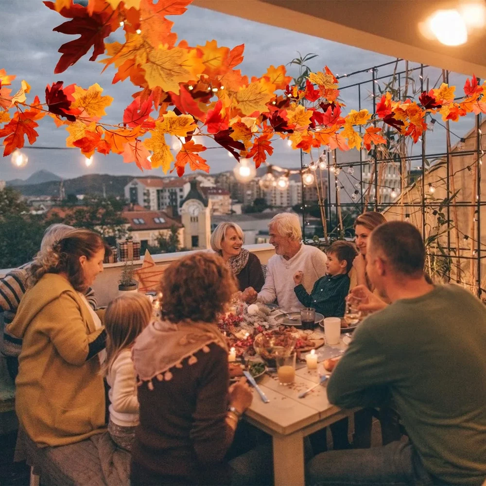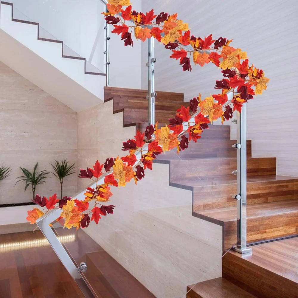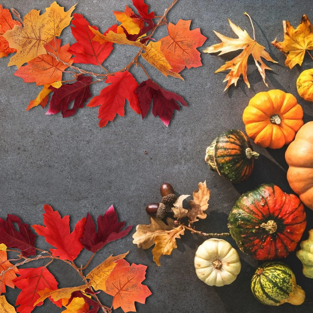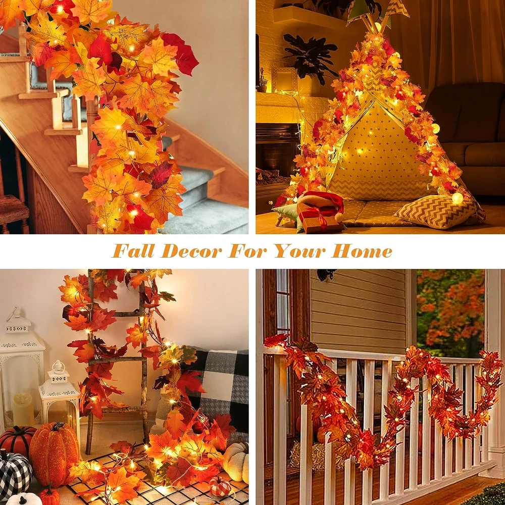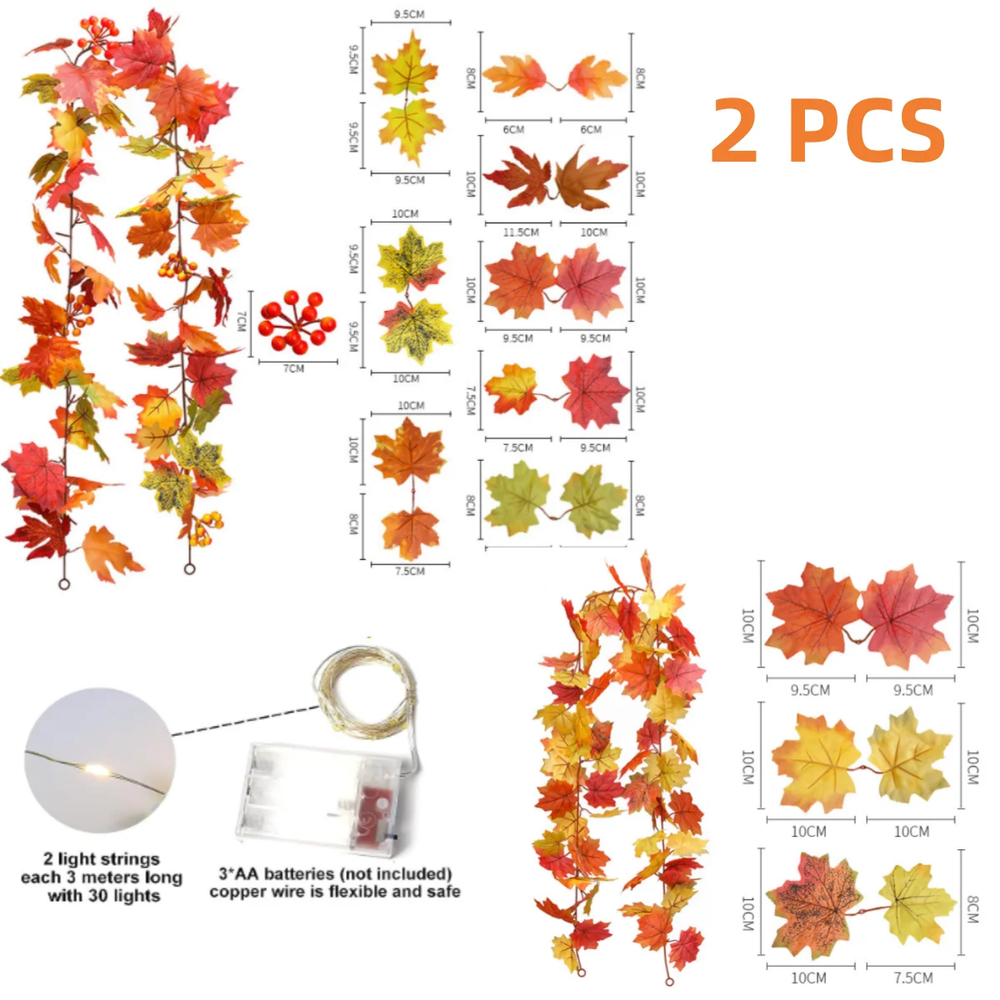 2-Pack Maple Leaf Fall Garland with LED Lights – Warm Autumn Glow, Indoors or Out Bring cozy autumn vibes to your space with this 2-pack of maple leaf garlands, each paired with a 30-LED fairy light string. With lifelike leaves and warm lighting, they’re perfect for Thanksgiving, Halloween, or everyday fall décor. What’s Included: 2 maple leaf garlands (approx. 5.8 ft each – one with fruit, one without) 2 LED light strings (30 lights each, approx. 9.8 ft long) Battery-powered (3 AA batteries required, not included) Why You’ll Love It: 🍁 Realistic & Durable – Vivid plastic leaves with a lifelike texture, waterproof and fade-resistant ✨ Versatile Display – Drape across mantels, stair rails, porches, windows, or party tables 🔋 Easy Setup – Battery box with 3 light modes: flashing, steady, or off—no outlet needed 🏡 Indoor & Outdoor Use – Perfect for walls, gardens, balconies, or cozy corners Add a soft seasonal glow to your home and celebrate fall in style—no outlet, no hassle, just instant autumn charm.