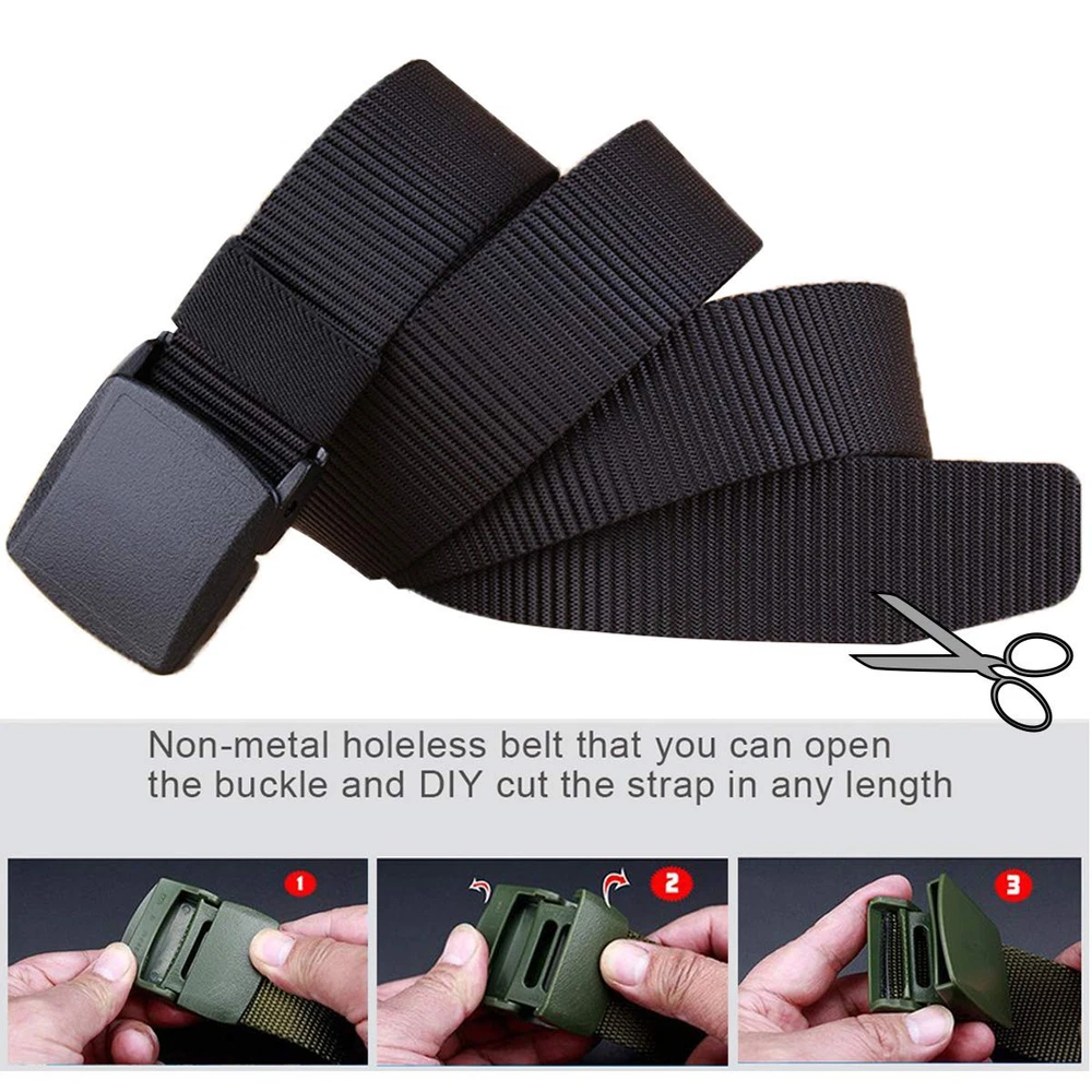 NO METAL BELT: If you are fed up with alarming when passing through airport or factory checkpoints, If you or your friends are metal allergy, Our 2 Pack narrow belts are Non-metal construction overall, YKK plastic buckle, nickel free, anti-allergic NYLON BELT: If you want to try a belt no leather. We are premium nylon strap belts, high strength, impact and abrasion resistance, comfort and dry fast in air. Can meet your needs to be the daily casual belt and outdoor work belt SUPER LIGHTWEIGHT BELT: Our nylon belts are very comfortable and lightweight for work occasion. Wear all day without any load for your waist TACTICAL DUTY BELT: These military style belts can not only as your daily belts to match your jeans, dress shorts, military uniforms but also as outdoor belt in hiking, camping, trekking, climbing. Sturdy, heavy duty for CCW, EDC, tool, molle pouches DIY FOR WAIST BELT: This web belts size 1.25” wide, length 47.2 inch that fit for waist below 40 inch. Holeless design, removable the buckle to trim the length you no need and trimmed edge with a lighter, then put on the buckle again to complete. Nice FIT
