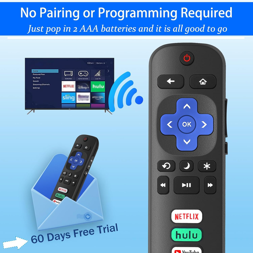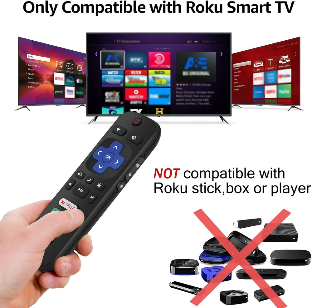 Compatible with : : Smart TV remote control by Gotellx, it compatible with all your Roku series smart TVs ( Compatible with TCL/Hisense/Onn/Sharp/Element/ Westinghouse/Philips/Insignia/JVC/RCA/Hitachi /Sanyo Roku samrt TVs. ) Please Note : : Gotellx IR remote control only compatible with Roku smart TV . It can NOT compatible with Roku Stick, Box, player or Speaker. ( NOT compatible with Roku Express/Express 4K+/Ultra/Streaming Stick 4K).Without voice function or headphone jack. No pairing or programming required : : Just pop in 2 AAA batteries and it i s all good to go. (Batteries are not included) 4 Preset Shortcut Buttons : : With 4 preset popular shortcut buttons on it , you can quickly jump to NETFLIX, hulu, YoutTube and to Disney+ APPs. Significantly elevate the entertainment of your TV time. 2 PACK : : 2 remote controls can make you no longer worry about not being able to find the remote control, and can also help you control multiple TVs more conveniently. Product Description