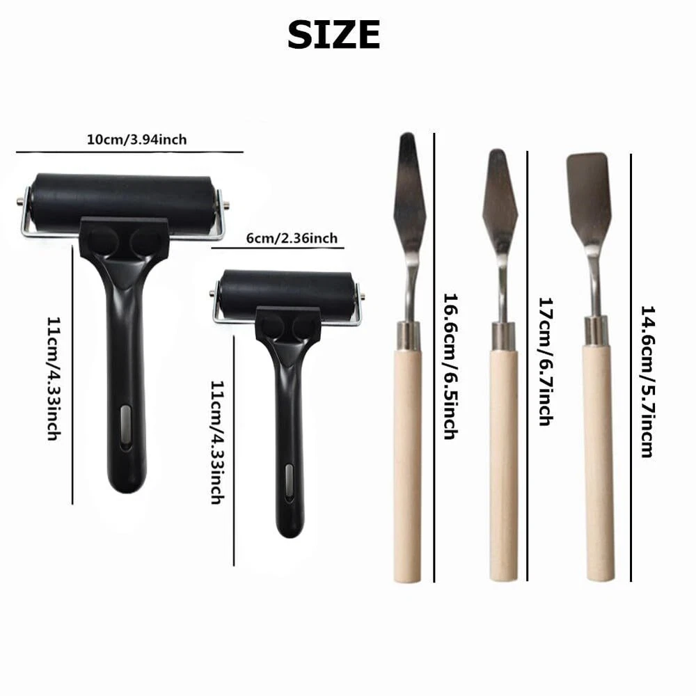 2 Pack Soft Rubber Brayer with 3 Spatula for Printmaking Ink Paint Block Stamping Gluing Wallpaper and Arts & Crafts -----------------EASY TO USE: The brayer moves with ease and no need to press hard or work hard for the roller to move; Can give you comfortable touch feel and pleasant user experience. -----------------FEATURES:This roller brush is a very useful art tool for painting or printing or stamping.As a good painting tool, which is capable of painting large area very quickly -----------------MATERIAL:The roller is made of high quality rubber, sturdy and durable, with good elasticity; The handle is made of nonslip plastic handle,easy to grip and easy to operate -----------------MULTIPLE USAGE: These rollers ideal for inking blocks, carved surfaces for printmaking, printing,scrapbooks, wallpapers, etc. Package Includes: 1 x 2.4 Inch rubber brayer 1 x 4 Inch rubber brayer 3 x Spatula Material: Our Rubber brayers is made of plastic grip handle, stainless steel frame and solid rubber roller Easy to Used:Glue roller moves with easy and no need to press hard for the roller to move, give you comfortable touch feel and pleasant user experience Unique Design: Durabilityand comfortable handle, has a heavy duty steel frame that will not bend or break easily, the smooth surface of brayer contribute to all types of block printing. There are two finger prints that can help to adjust the power and direction Widely used: Rubber brayer roller ideal for construction tools, printmaking, inking blocks, carved surfaces or stamping tools, scrapbooks, paintings, etc Package Includes: 1 x 2.4 Inch rubber brayer, 3 x 4 Inch rubber brayer, 3 x scraper