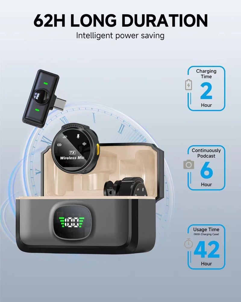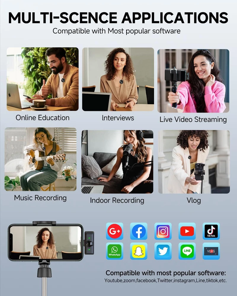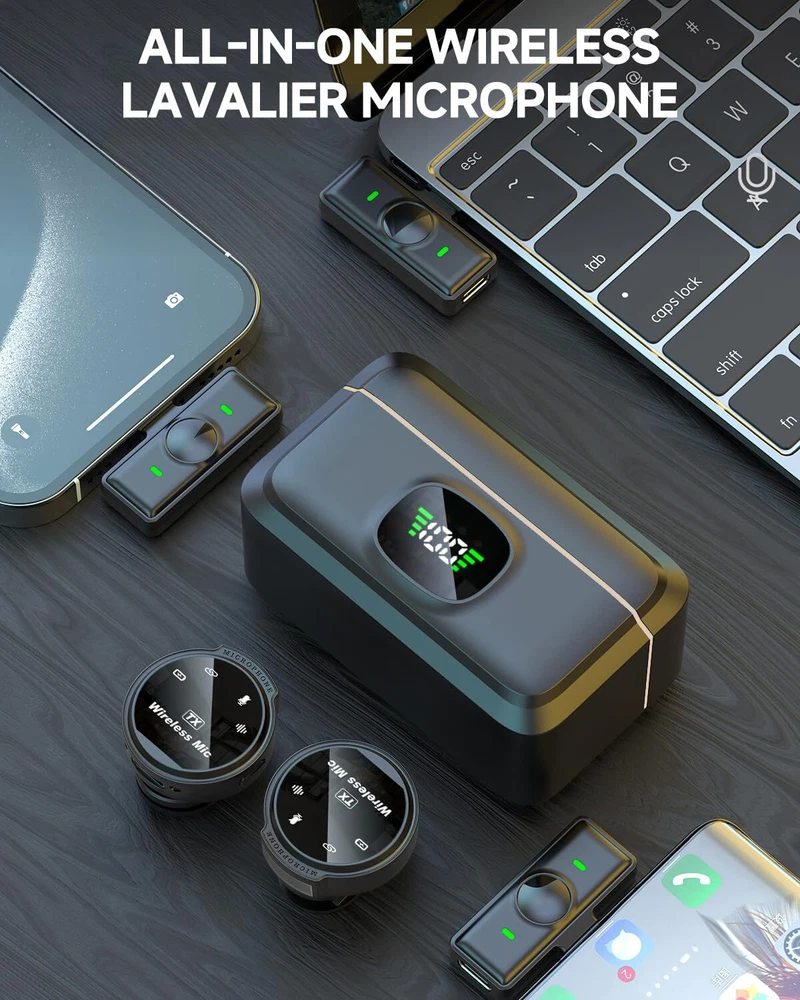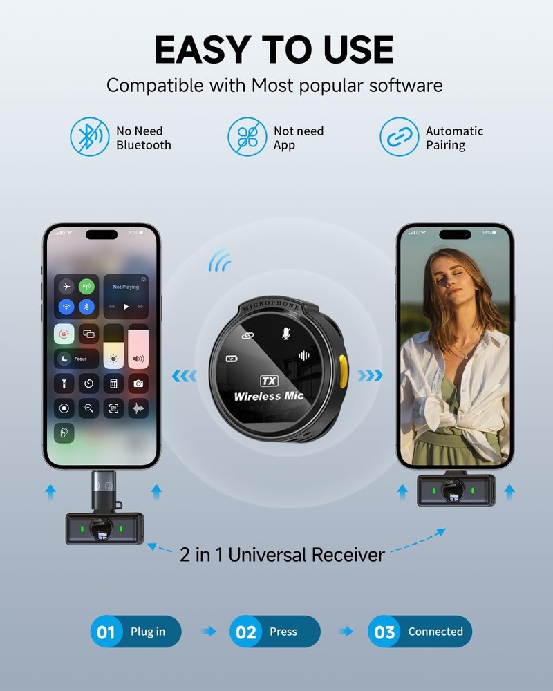 Plug and Play: No Bluetooth or APP needed. The wireless lavalier microphone can be clipped to the collar for hands-free audio and video recording. Just need to plug the receiver into your device, and power on the microphone, it will start working for you soon Design for Professional: The J6 microphone boasts a 48kHz/24bit audio format for accurate sound capture. With a 60dB signal-to-noise ratio, it delivers excellent audio with minimal background noise. Plus, it can handle up to 95dB Sound Pressure Level, perfect for recording high-pitched sounds. Visual dials have been designed to provide clear insight into the microphone's usage status, including connection, noise reduction function, mute, battery usage, and more 165FT Wireless Transmission & Rechargeable: This lavalier microphone boasts a consistent audio signal, capable of reaching a remarkable wireless transmission distance of up to 165 feet. Equipped with a high-quality DSP chip, it ensures even more stable transmission. The wireless microphone transmitter features a built-in rechargeable battery, offering up to 6 hours of operation on a single charge, or an impressive 42 hours with the charging case Omnidirectional Mic with Noise Reduction: Supports one-click on the yellow button to turn on/off the noise cancellation on TX and RX. The built-in intelligent active noise Cancellation chip and advanced 2.4GHz transmission technology, which allows you to record clearly in noisy environments, which can provides more vivid, soft, natural and stereo sound around for recording or real time video Compatible with Most Devices: Compatible with iPhone, iPad, PC, Android, Camera etc. Work with IOS 6.0 system or above (with Lightning), Android 3.0 system or above, can be use with iPhone, Android etc. The handheld mic is suitable for interviewing, online conferencing, podcasting, vlogging, live streaming What You Get: 2*TX (2 Transmitters) + 1*RX(1 Receiver ) +2*Adapter+2*Windscreen+ Charging Case + 2*Charging cable + Instruction. Our worry-free 18-month warranty, and friendly customer service